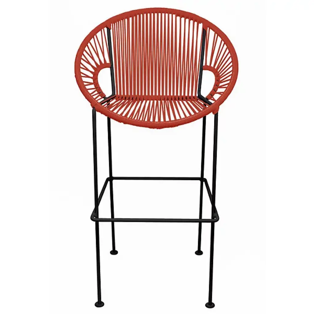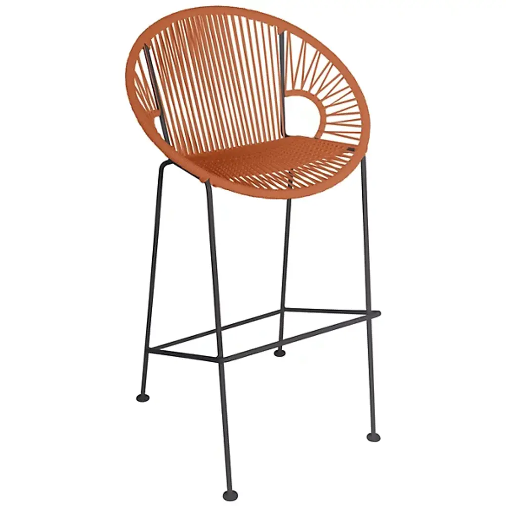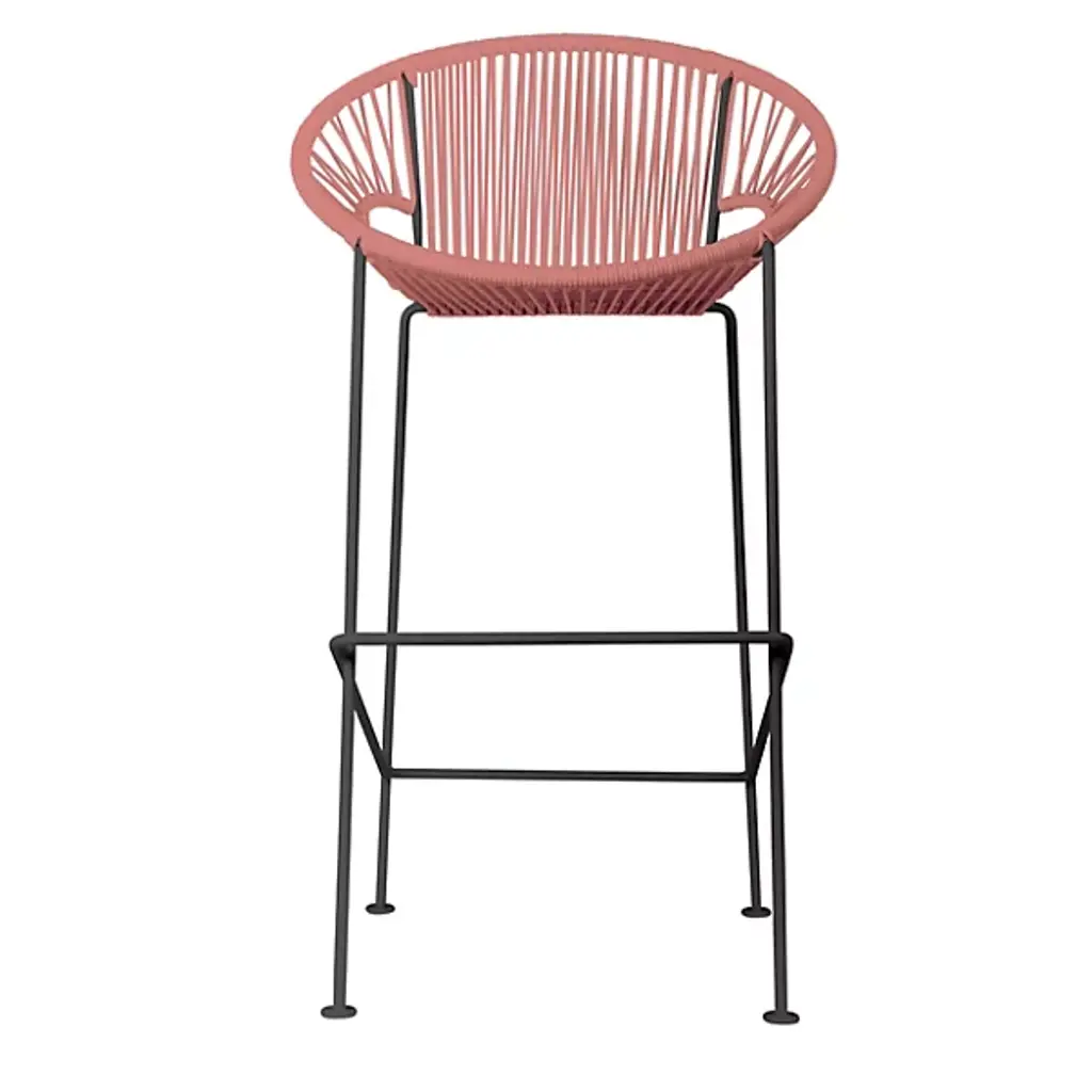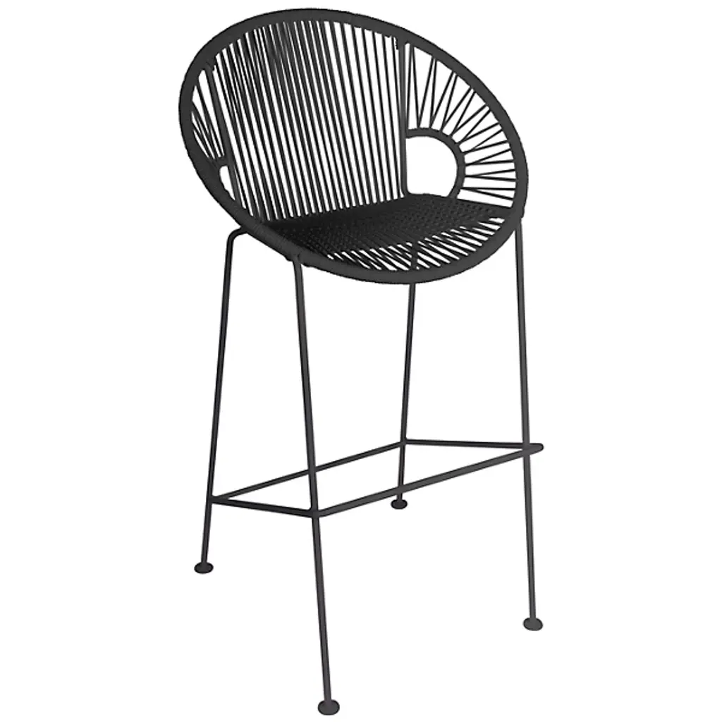 The cool style of the Concha Chair gets taken to new heights in the Innit Designs Puerto Stool. This bar height stool features a distinctive and impressively comfortable seat made out of hand-woven strands of vinyl. It sits atop a tall powder-coated steel frame. Durable, easy to clean and weatherproof, this stool is great indoors and out.