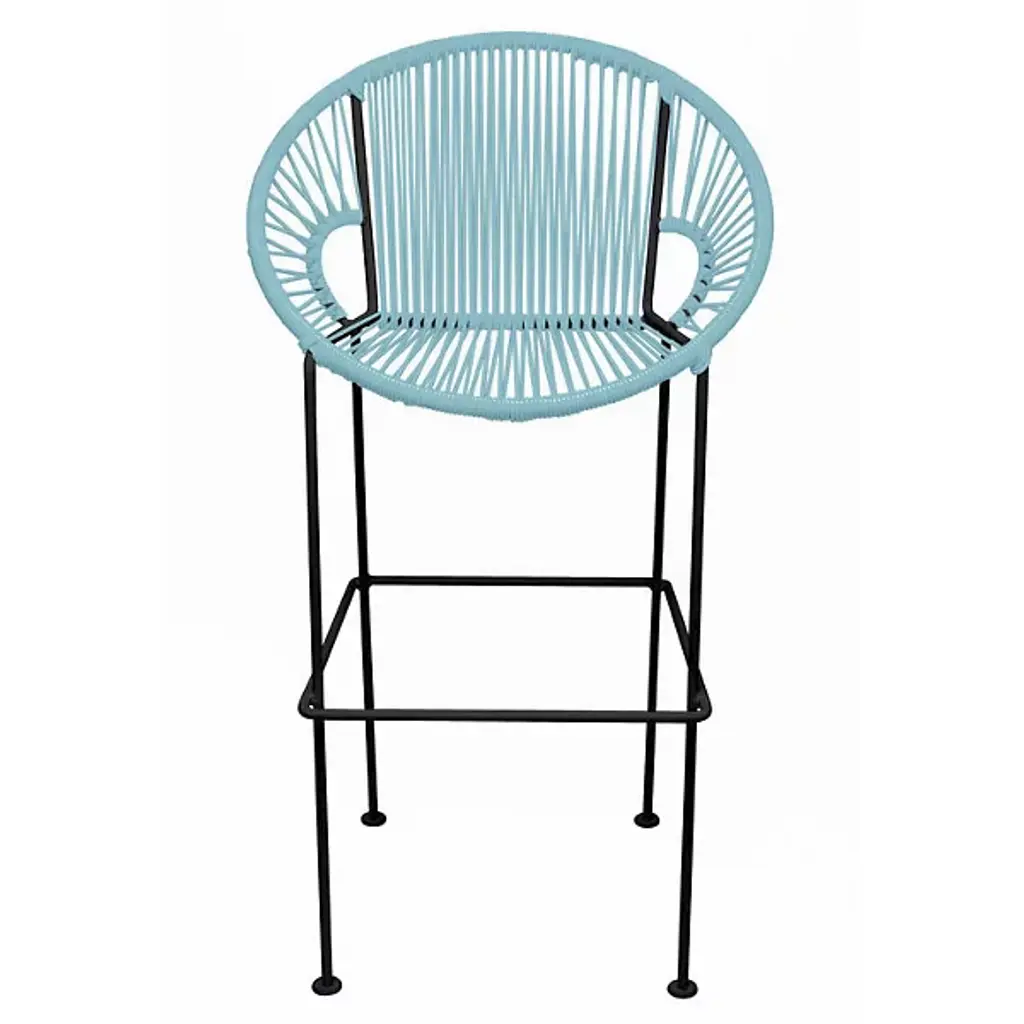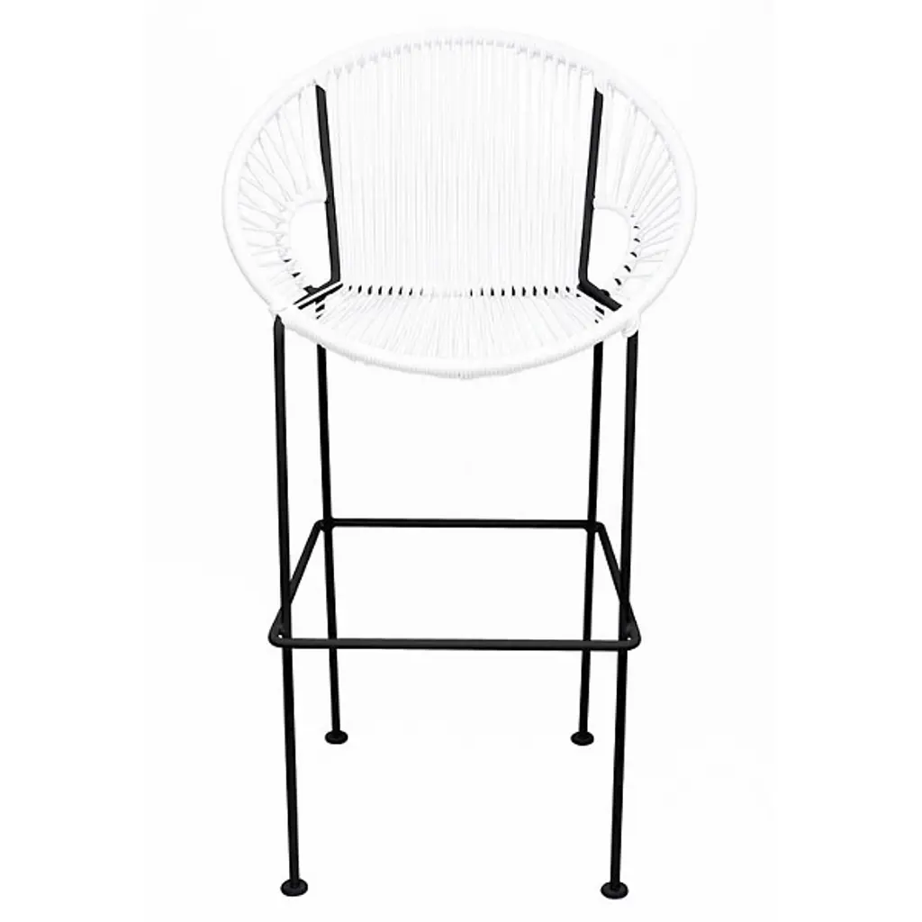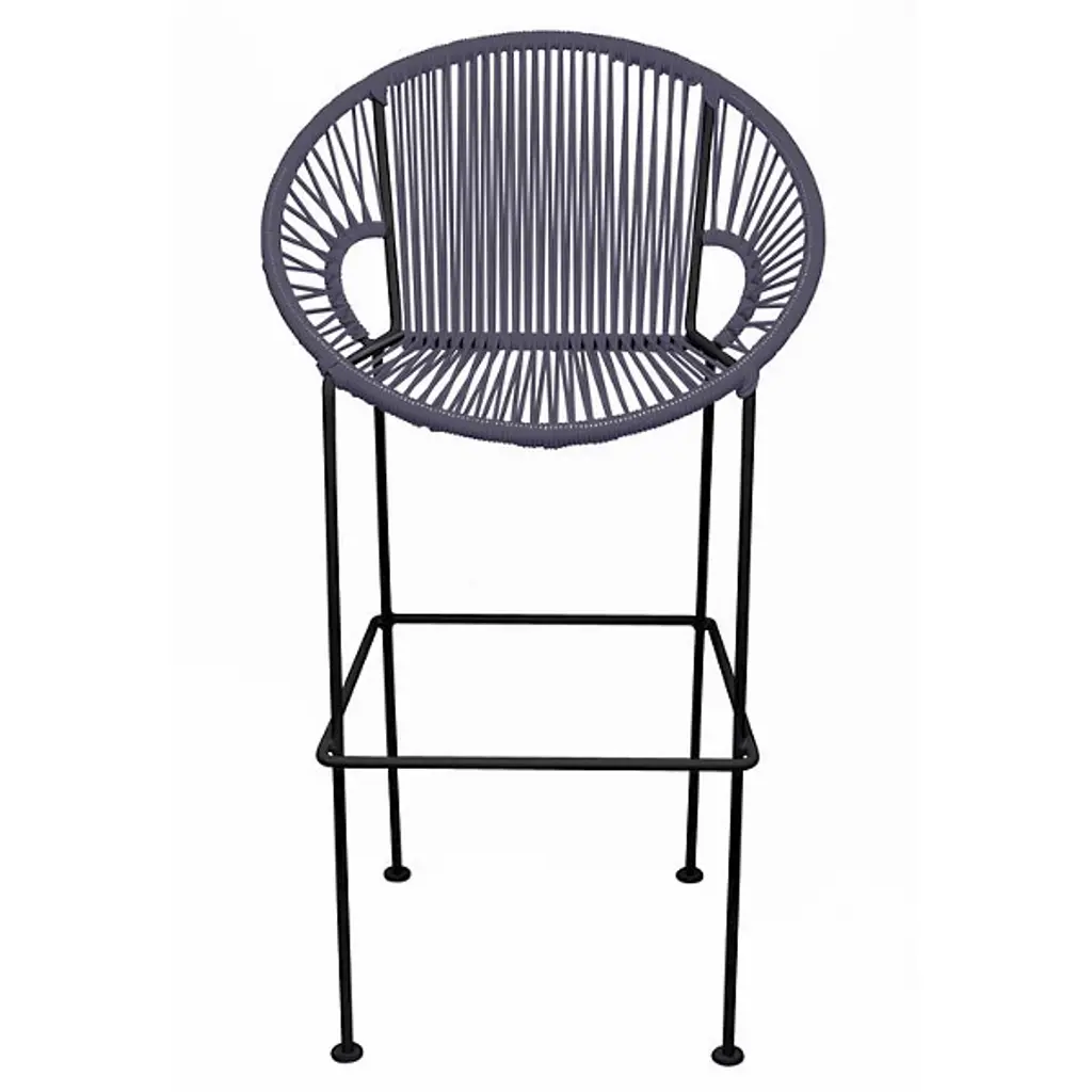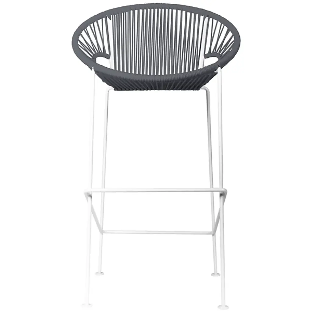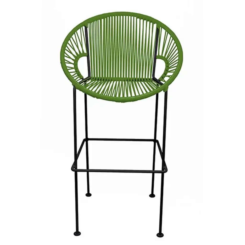The cool style of the Concha Chair gets taken to new heights in the Innit Designs Puerto Stool. This bar height stool features a distinctive and impressively comfortable seat made out of hand-woven strands of vinyl. It sits atop a tall powder-coated steel frame. Durable, easy to clean and weatherproof, this stool is great indoors and out.