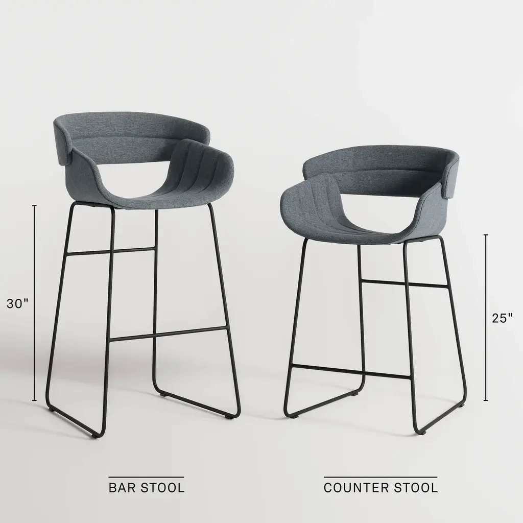 An upholstered seat and back work the curves and overlap just so to create a chair that invites you to sit down and stay awhile. The channel stitch detail may not improve the aerodynamics, but it sure does looks swell. With a color coordinated powder-coated steel sled base. Also available in dining chair.
