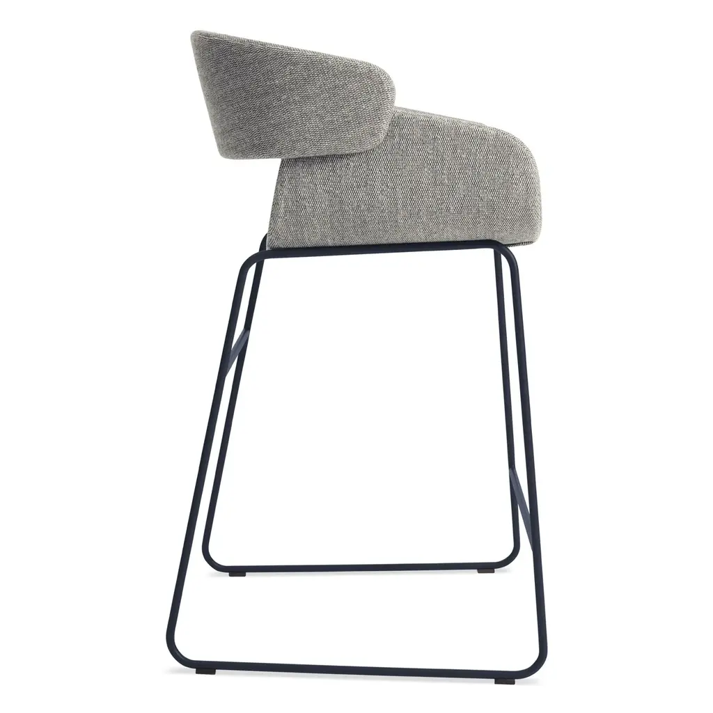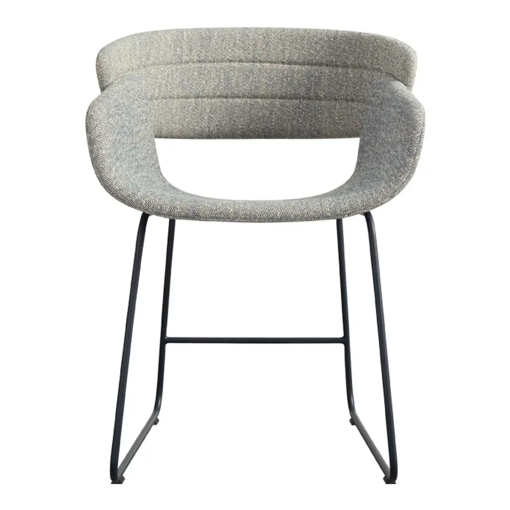 An upholstered seat and back work the curves and overlap just so to create a chair that invites you to sit down and stay awhile. The channel stitch detail may not improve the aerodynamics, but it sure does looks swell. With a color coordinated powder-coated steel sled base. Also available in dining chair.