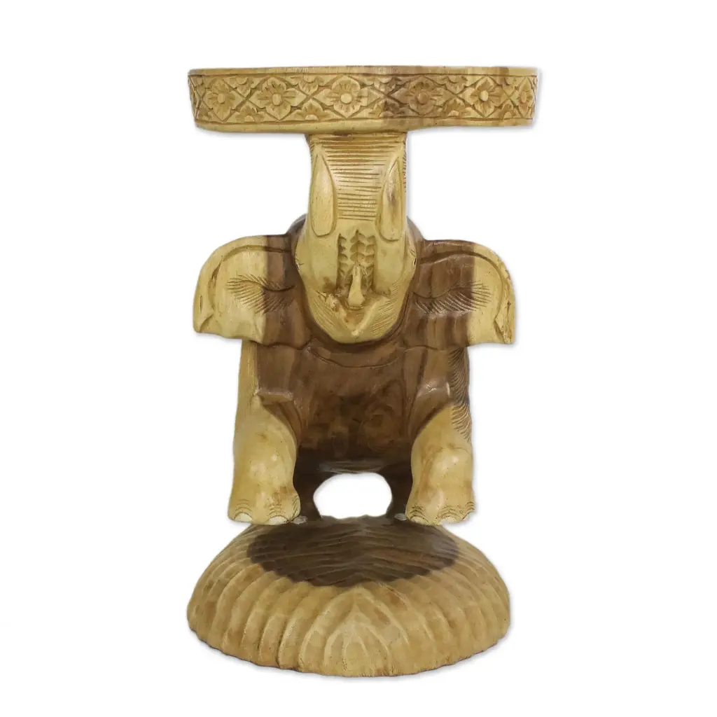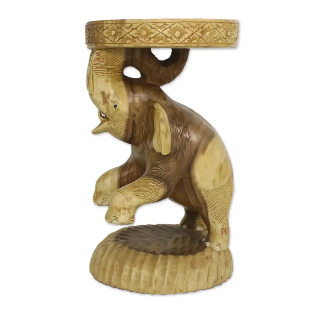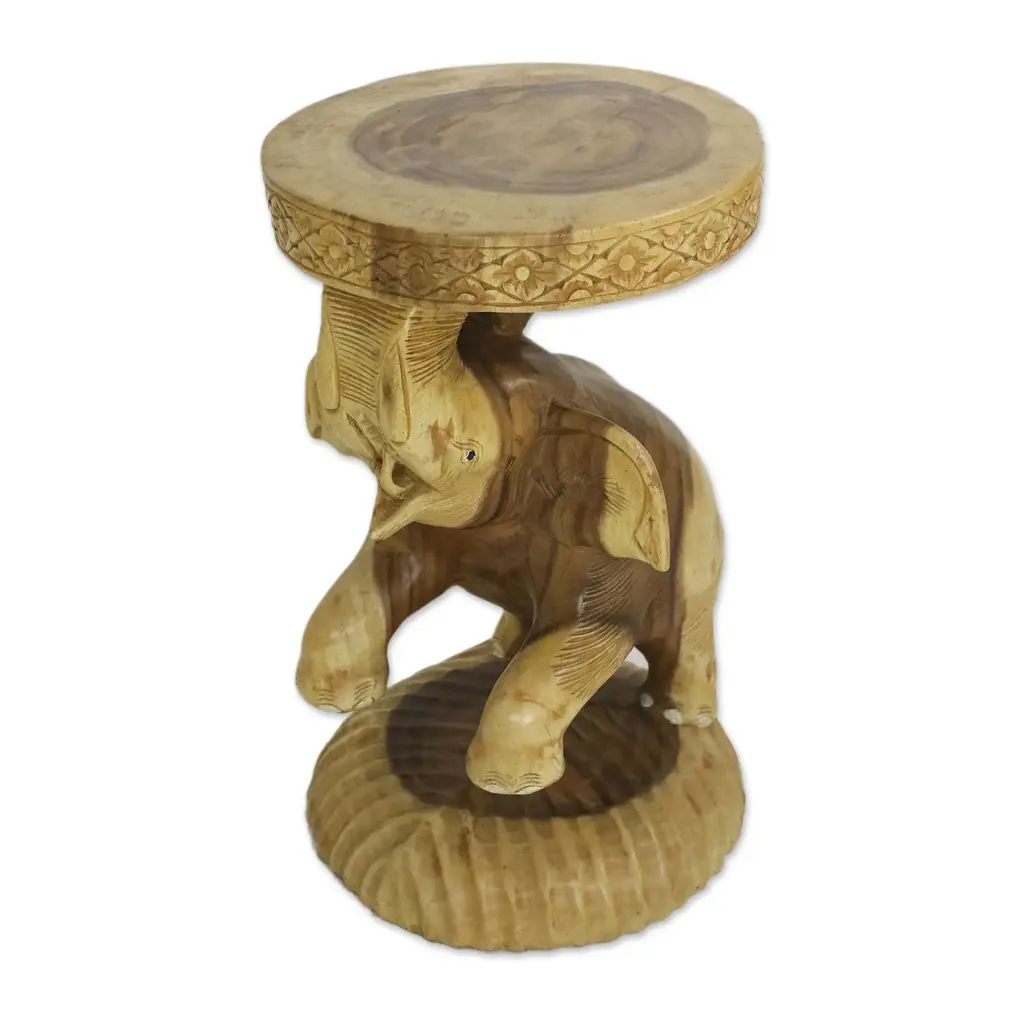 Trunk raised in salutation, a friendly elephant is hand-carved of raintree wood in this stool from Thailand. Amporn works with local artisans, who give the stool a finish that accentuates the natural grain of the wood.