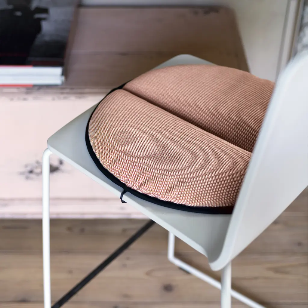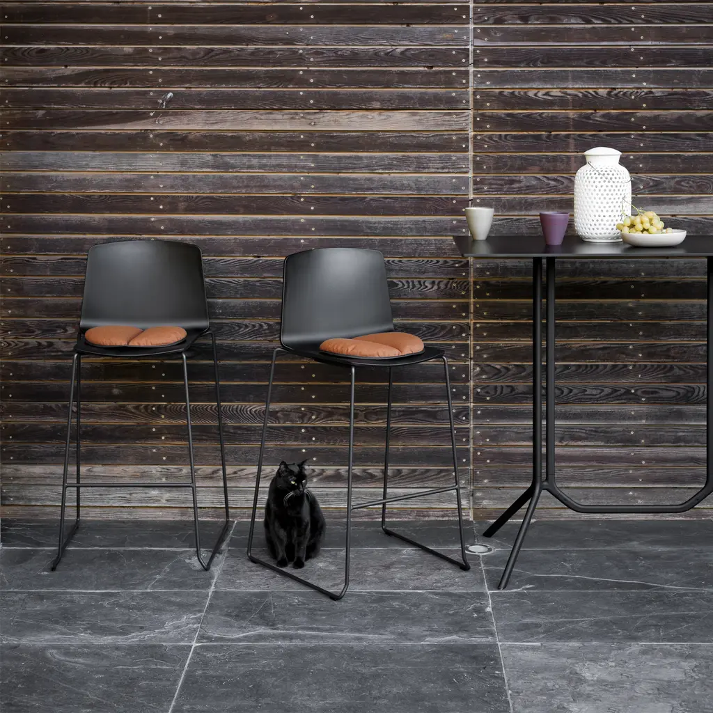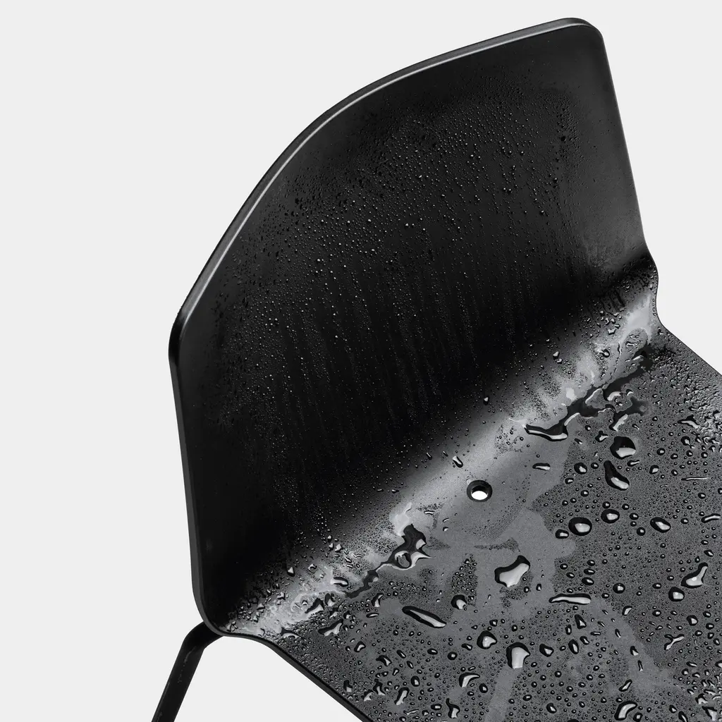 Stackable chair with a distinct and essential style, with a curved plywood structure or, alternatively, in injection-moulded reinforced polypropylene. The frame is available in many versions: with solid wood legs, also demonstrating high-quality craftsmanship, with four legs, or on a tubular metal slide frame with or without armrests. In addition, two new stools are available, also stackable, in two different heights. The structure is also available in a padded version, upholstered either entirely or at the front in a choice of high-quality fabrics and leather, allowing many colour combinations to be created with the frames. On request, Rama can be fitted with a water outlet hole and complemented with a removable Lips cushion for extra comfort and further colour options.
