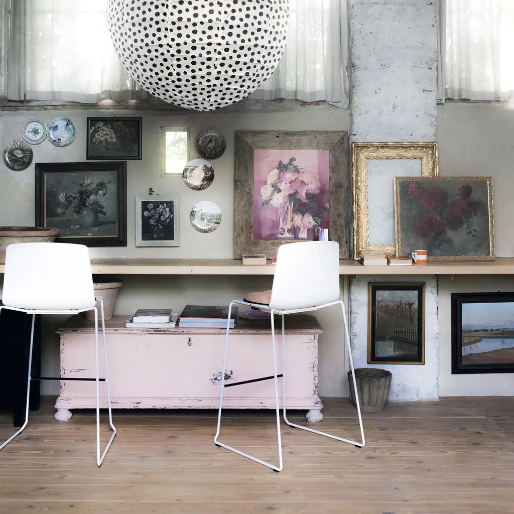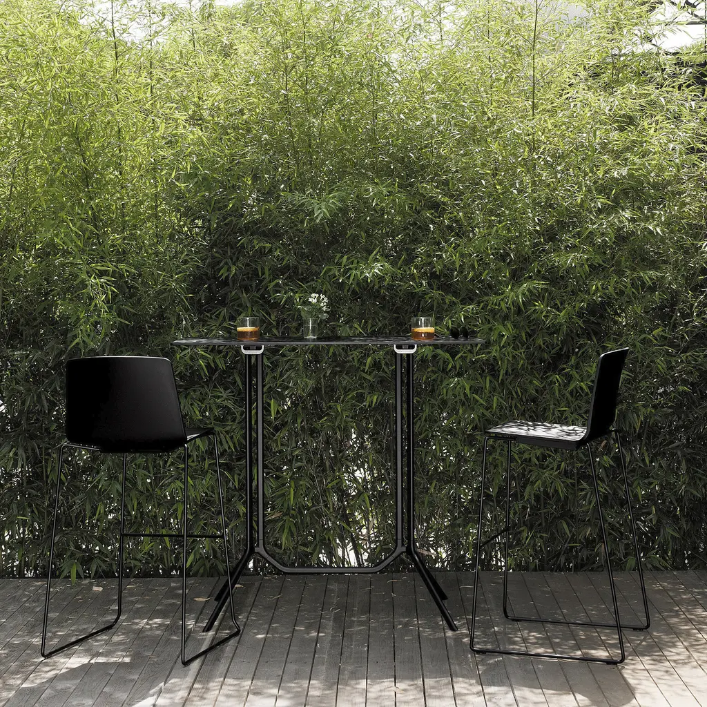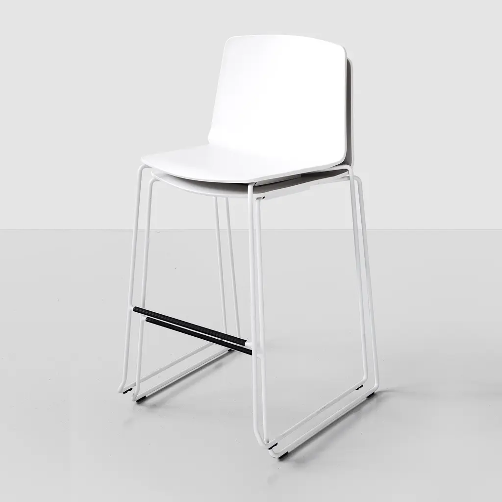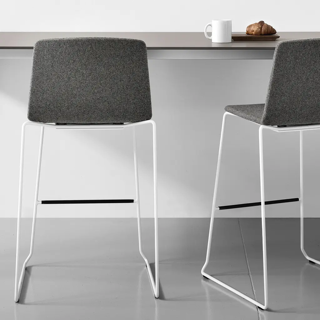 Stackable chair with a distinct and essential style, with a curved plywood structure or, alternatively, in injection-moulded reinforced polypropylene. The frame is available in many versions: with solid wood legs, also demonstrating high-quality craftsmanship, with four legs, or on a tubular metal slide frame with or without armrests. In addition, two new stools are available, also stackable, in two different heights. The structure is also available in a padded version, upholstered either entirely or at the front in a choice of high-quality fabrics and leather, allowing many colour combinations to be created with the frames. On request, Rama can be fitted with a water outlet hole and complemented with a removable Lips cushion for extra comfort and further colour options.