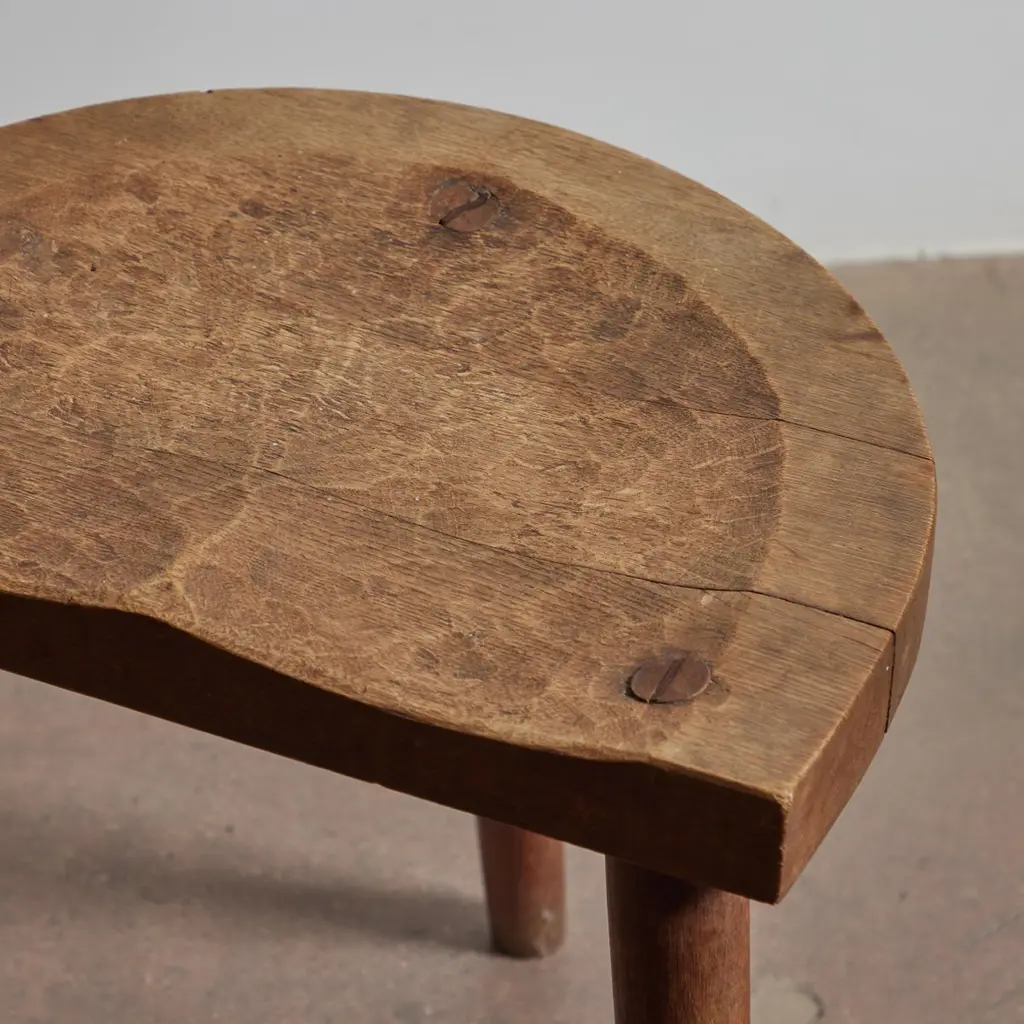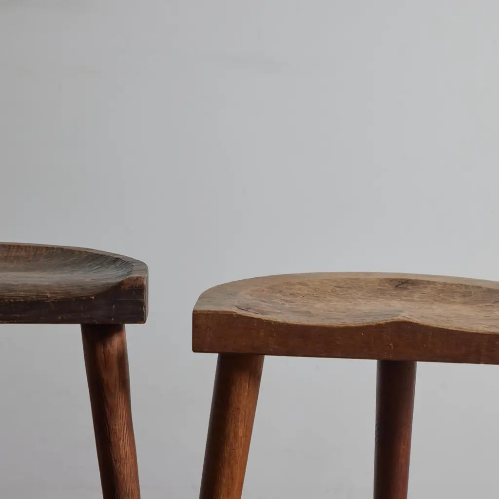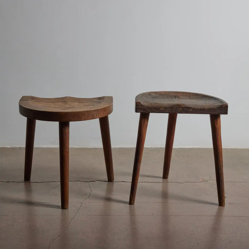 Hand gouged oak stools by Jean Touret for Ateliers Marolles. Made in France circa 1960s. Priced per item.Jean Touret moved to Pezay, a rural area near Marolles, in 1946. While there, he became highly conscious of the uncertainty that Industrial development would bring to the future of the local craftsmen. Believing strongly in the value of the artisan tradition, Touret decided to informally organize a local group of artisans into a collective, becoming their artistic director. Employing the talents of each member, he orchestrated the creation of furniture which embodied the circumstances of the epoch. The furniture designed by the Marolles group under Touret’s direction was guided by the concept of minimalism and a simplistic integrity achieved through the use of wood and iron and materials he considered to be organic and expressive. Each piece was conceived to serve an essential purpose, and was produced in limited edition. The Marolles group quickly expanded its development over the years and achieved enduring success. The collective is notable not only for its intense artistic fervor, but also for the huge risk they undertook in going against the trend of the times.