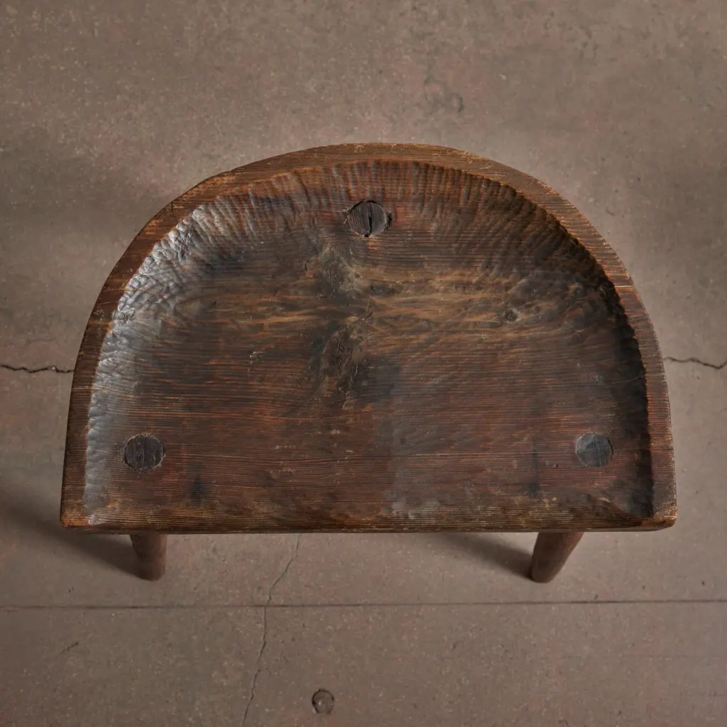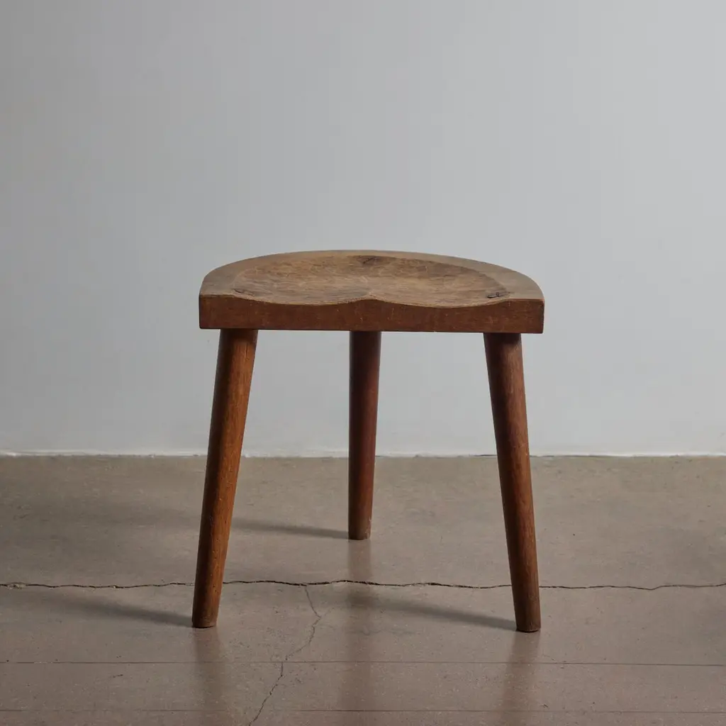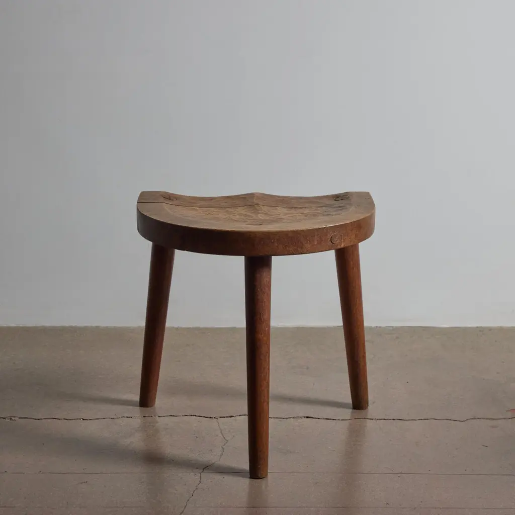 Hand gouged oak stools by Jean Touret for Ateliers Marolles. Made in France circa 1960s. Priced per item.Jean Touret moved to Pezay, a rural area near Marolles, in 1946. While there, he became highly conscious of the uncertainty that Industrial development would bring to the future of the local craftsmen. Believing strongly in the value of the artisan tradition, Touret decided to informally organize a local group of artisans into a collective, becoming their artistic director. Employing the talents of each member, he orchestrated the creation of furniture which embodied the circumstances of the epoch. The furniture designed by the Marolles group under Touret’s direction was guided by the concept of minimalism and a simplistic integrity achieved through the use of wood and iron and materials he considered to be organic and expressive. Each piece was conceived to serve an essential purpose, and was produced in limited edition. The Marolles group quickly expanded its development over the years and achieved enduring success. The collective is notable not only for its intense artistic fervor, but also for the huge risk they undertook in going against the trend of the times.