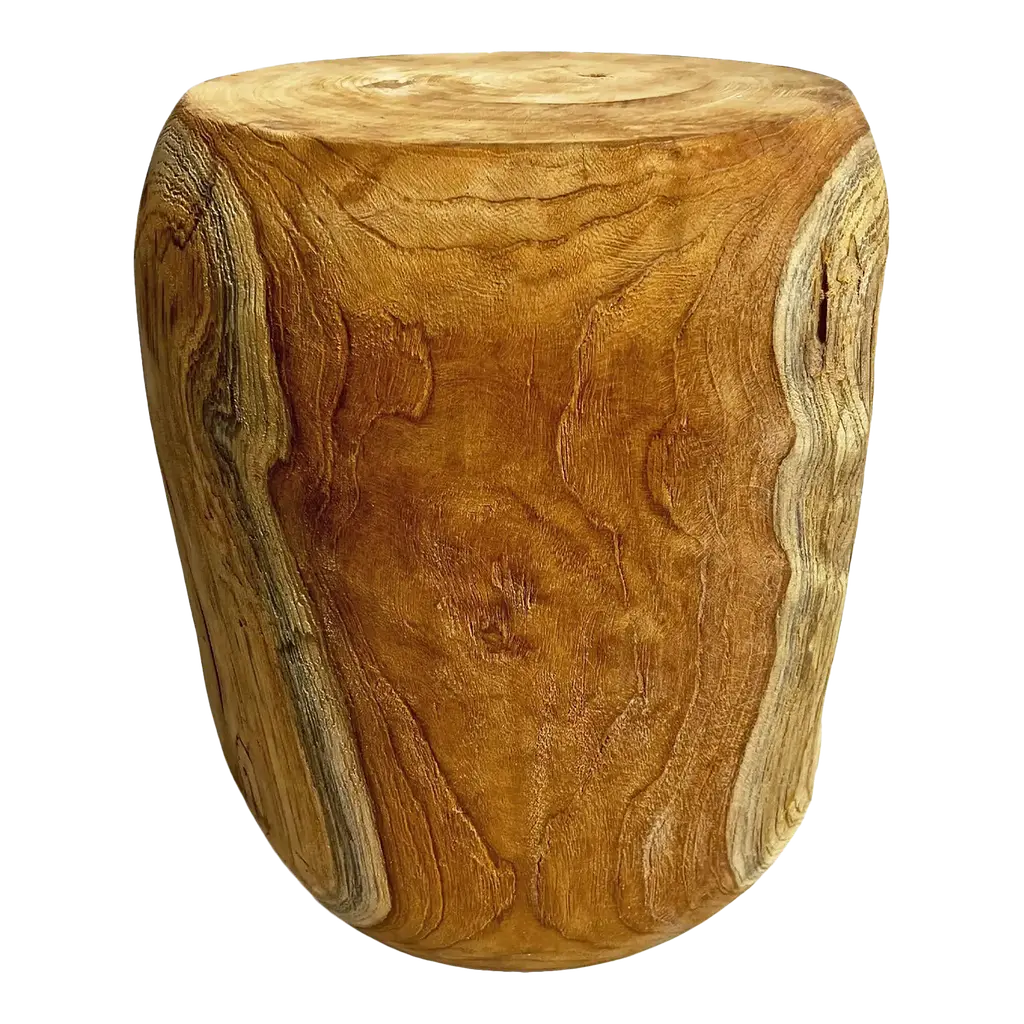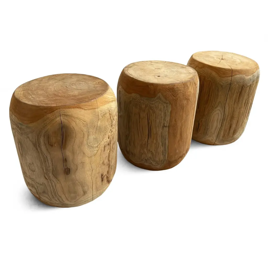 Raw natural hard wood finish solid acacia round drum style stool or side table. Beautiful rustic modern style perfect for many design interiors. Each unique in grain patterns and individual characteristics. Each is sold individually.
