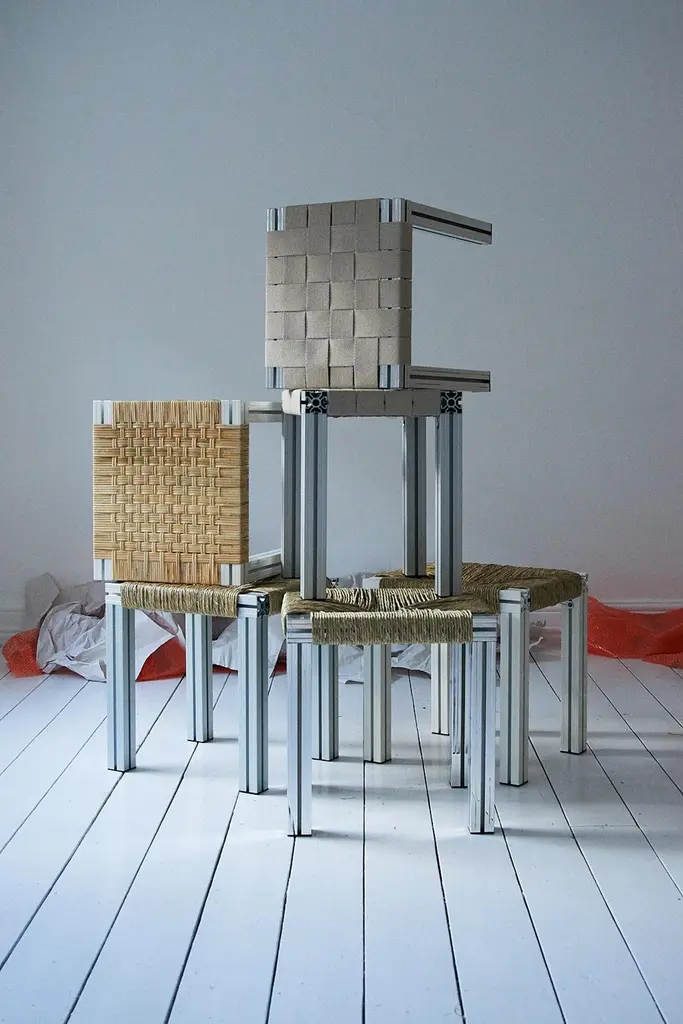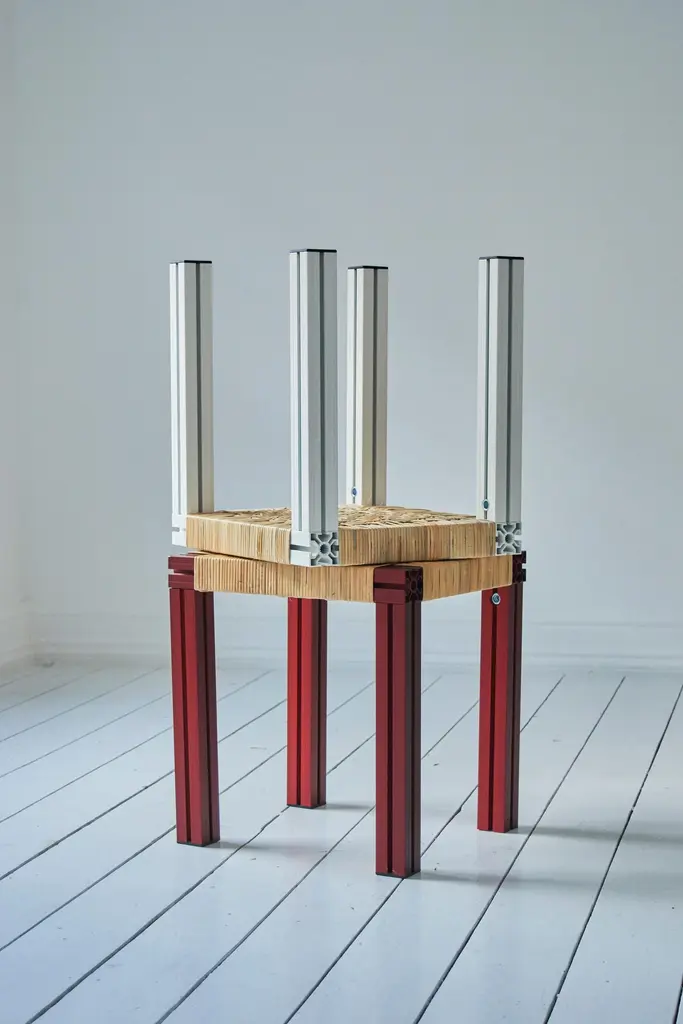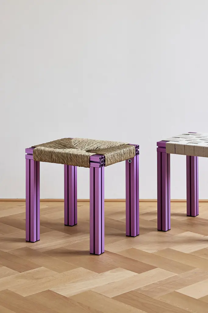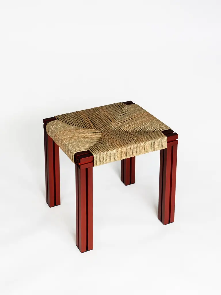 Originally realised for the Hepworth Gallery in Wakefield and inspired by Donald Judd and Børge Mogensen, Anodised Wicker marries industrially extruded and anodised aluminium with hand-woven cane wicker, rush envelope and flax webbing seats. The clinical and precise aluminium contrasts the warm and organic material. To this day we assemble the pieces in my studio in London and apply the cane, rush or webbing seating ourselves.The collection consists of this stool sized 380mm x 430mm x 450mm (W x L x H) available with a reel rush envelope seating (this listing), woven glossy lapping cane seating or a Scandinavian flax webbing, a longer bench also available with the same seating options and a cane woven armchair.The frame and legs can be finished in anodised red (this listing) or other anodising colours, powder coated (any colour) or mirror polished aluminium.