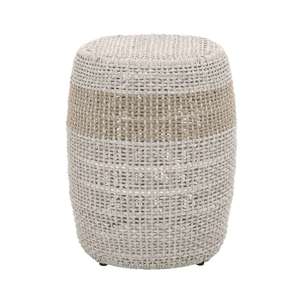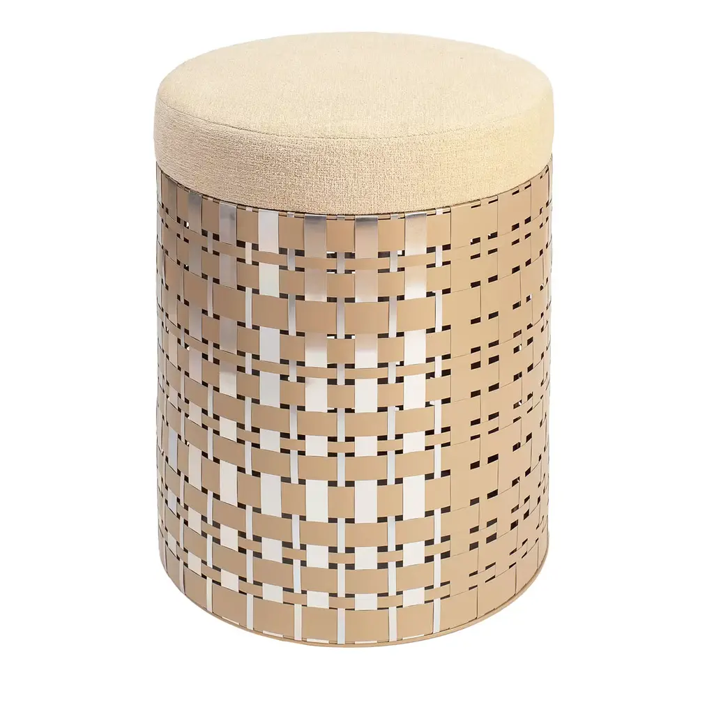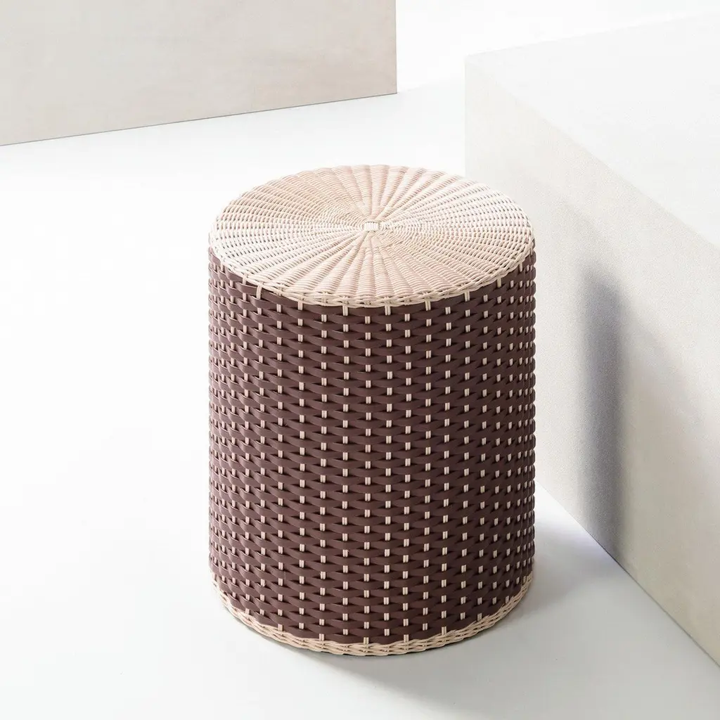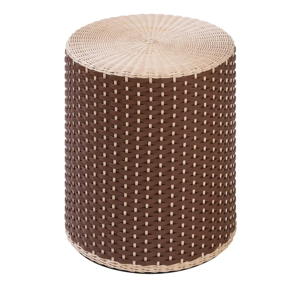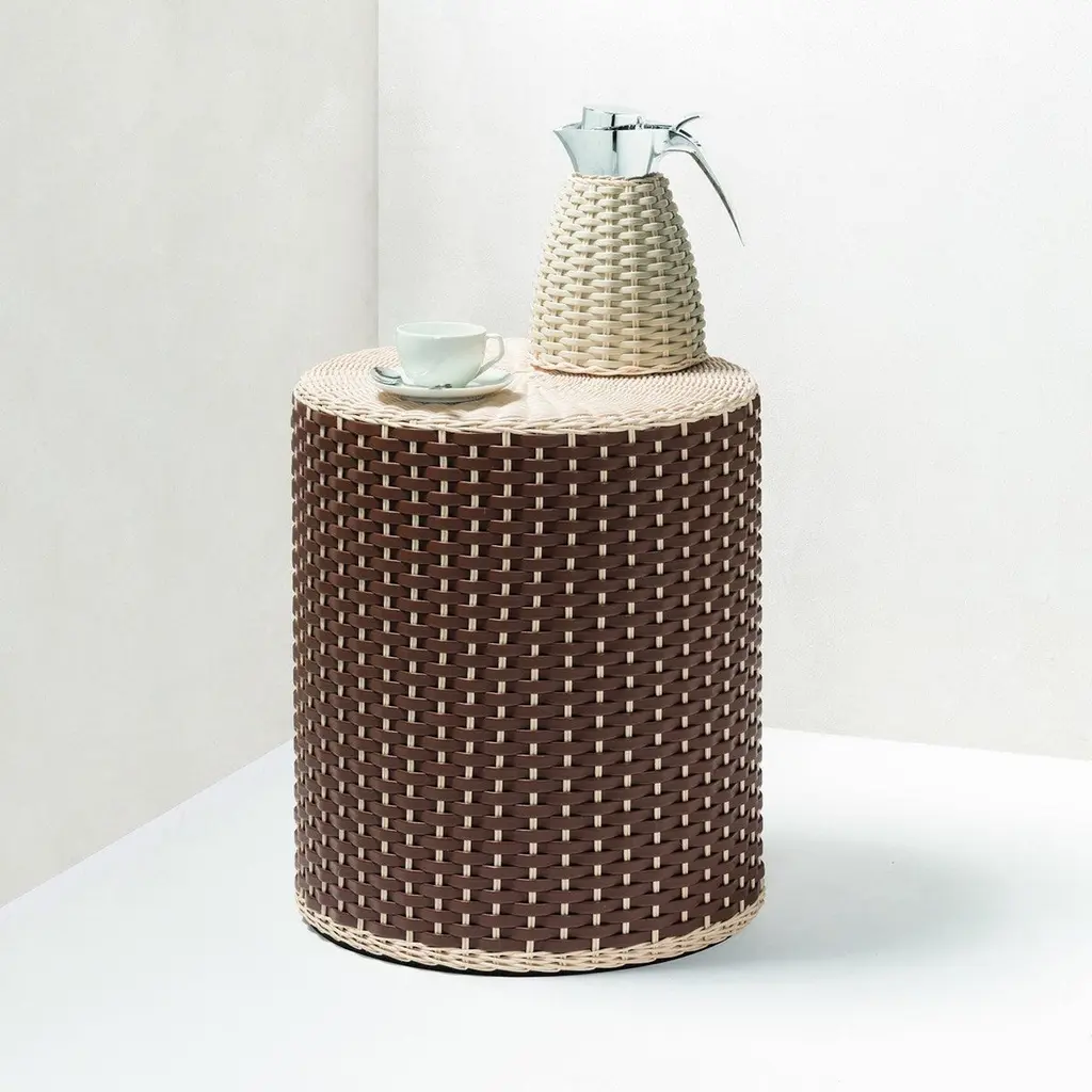 A superlative showcase of craftsmanship, this objet d'art can be used as a stool or side table thanks to its versatile cylindrical shape. Resting on a wooden structure, it is superbly covered with a handwoven upholstery composed of brown leather (also available with Napa leather) and natural rattan, adding a flexible and light flair to the piece.