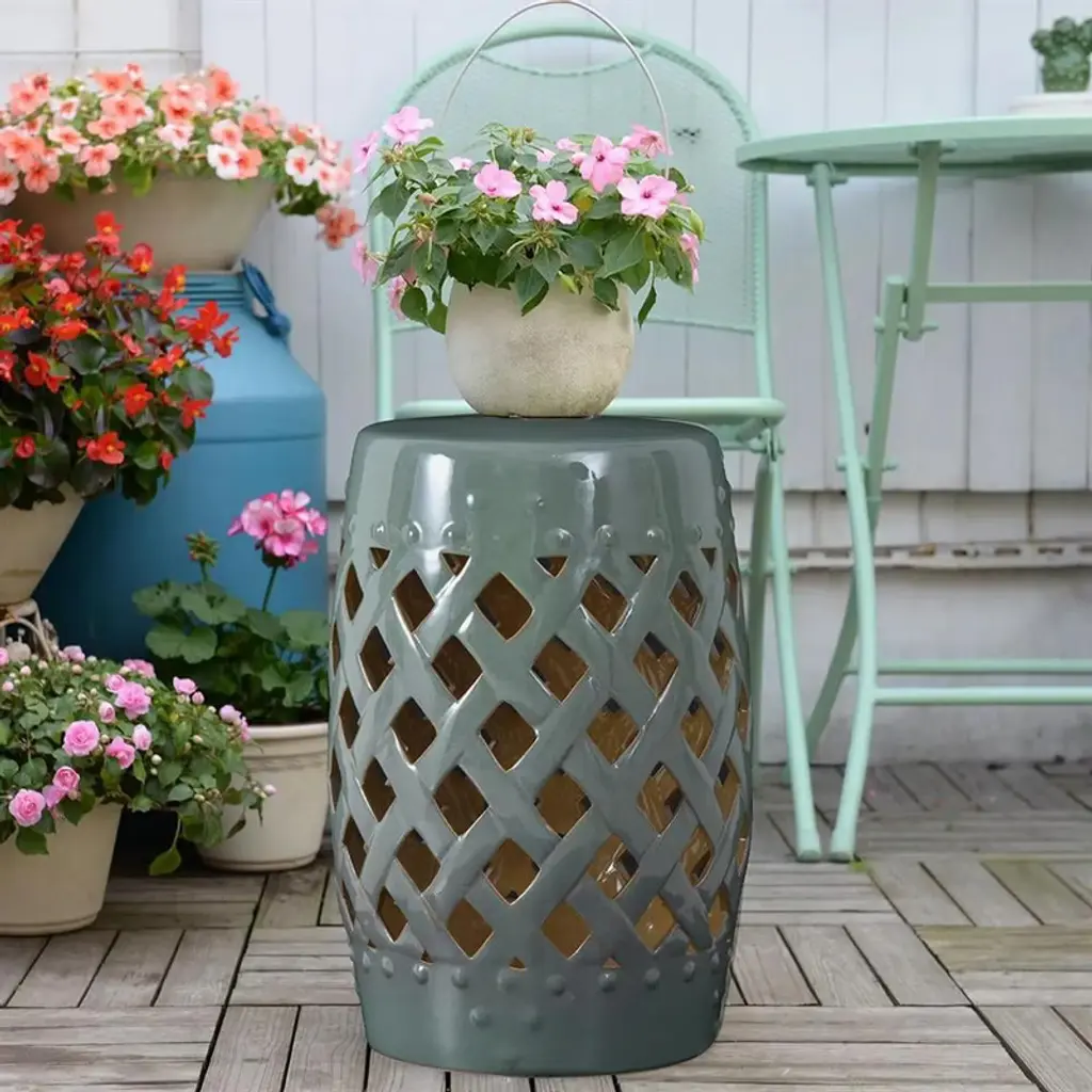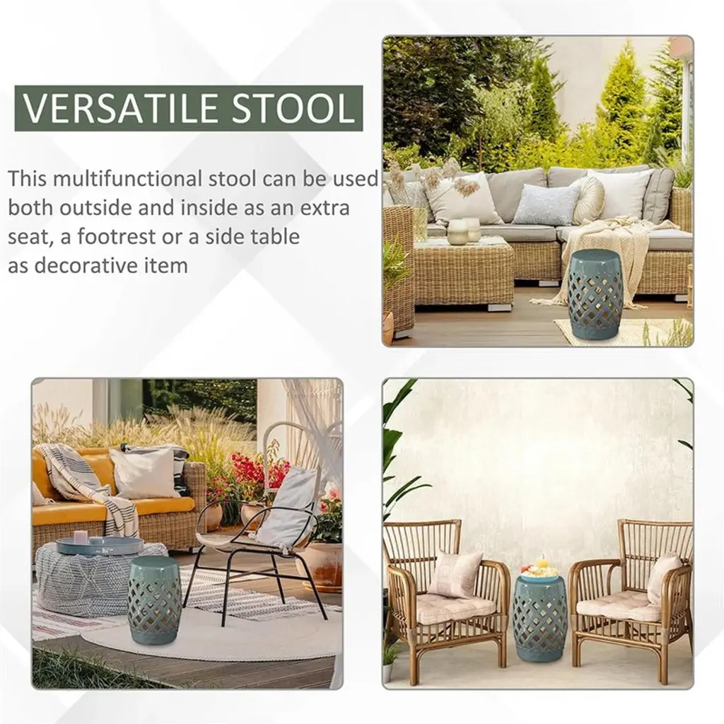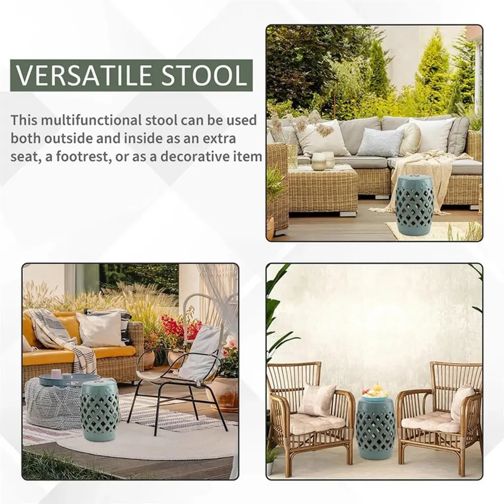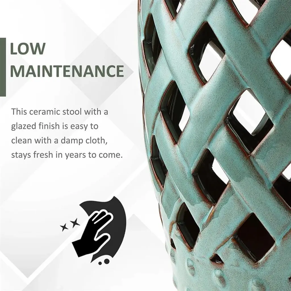 Add elegant design to your home with our interwoven stool. Our garden stool is fired at 1,200°C (that's 2,192 °F), so you know the ceramic will going to last for years everyday use season to season. A footrest that’s multi-functional and can belong in any room of your house, being used as a sitting stool, footrest, or even just accent garden art. With a glazed finish, cleanup is a breeze with a simple wipe of a damp cloth or towel. Get this cute, bright piece of furniture in your house.Features:- This ceramic stool is made of high-quality ceramic fired at temperatures of up to 1,200 °C to make it solid enough for daily outdoor use season after season- This multifunctional stool can be used both outside and inside as an extra seat, a footrest- Perfect for your garden, patio, deck, backyard, or anywhere that you want to add more elegance- Durable ceramic stool can support up to 300 lbs.- Features a bright finish, easy to clean with a damp cloth- No assembly requiredSpecification:- Color: Antique-Blue Green- Material: Porcelain Stoneware- Product Dimensions: 12.5" Dia x 18" H- Diameter of Seat: 10.25" Dia- Diameter of Bottom: 10" Dia- Weight Capacity: 297 lbs.- Net Weight: 12.5 lbs.Package Includes:- 1 x Ceramic Garden Stool; Resenkos Modern Garden Stool, Patio Stool Side Table,13" x 18" Ceramic Garden Stool, Decorative End Table, Antique Blue