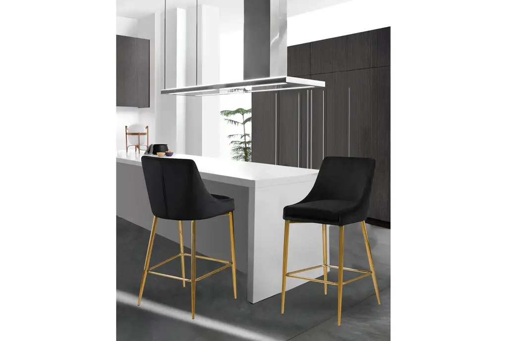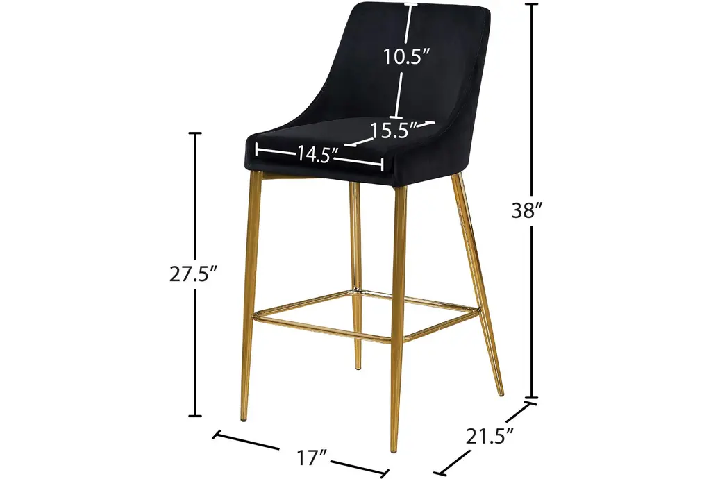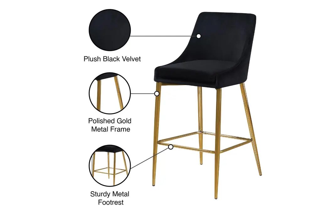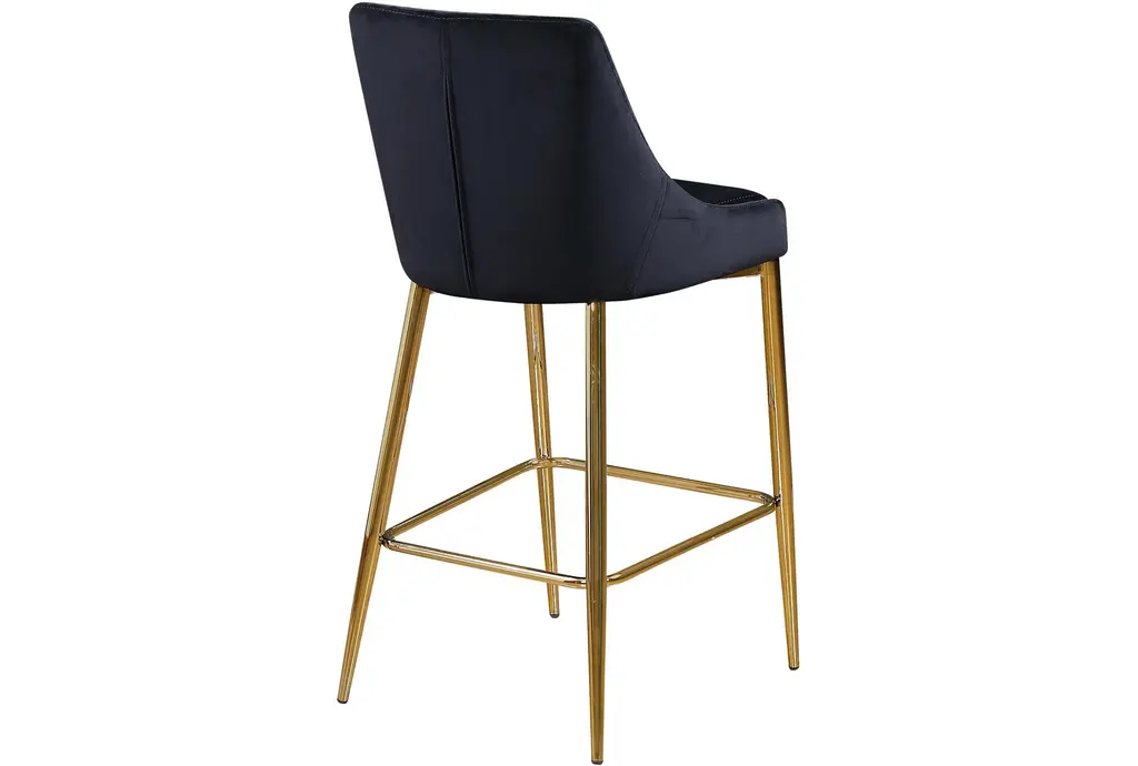 The Rina Black Velvet Upholstered Stool With Gold Finish Set Of 2 is perfect for your dining room or kitchen space. These stools combine modern style with comfort, featuring plush velvet upholstery and a polished gold finish that adds a touch of sophistication to any room.