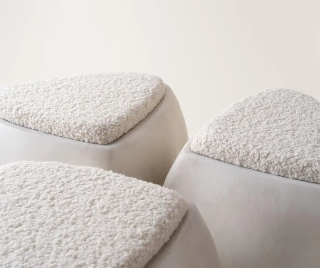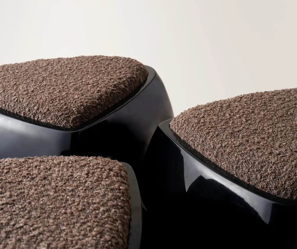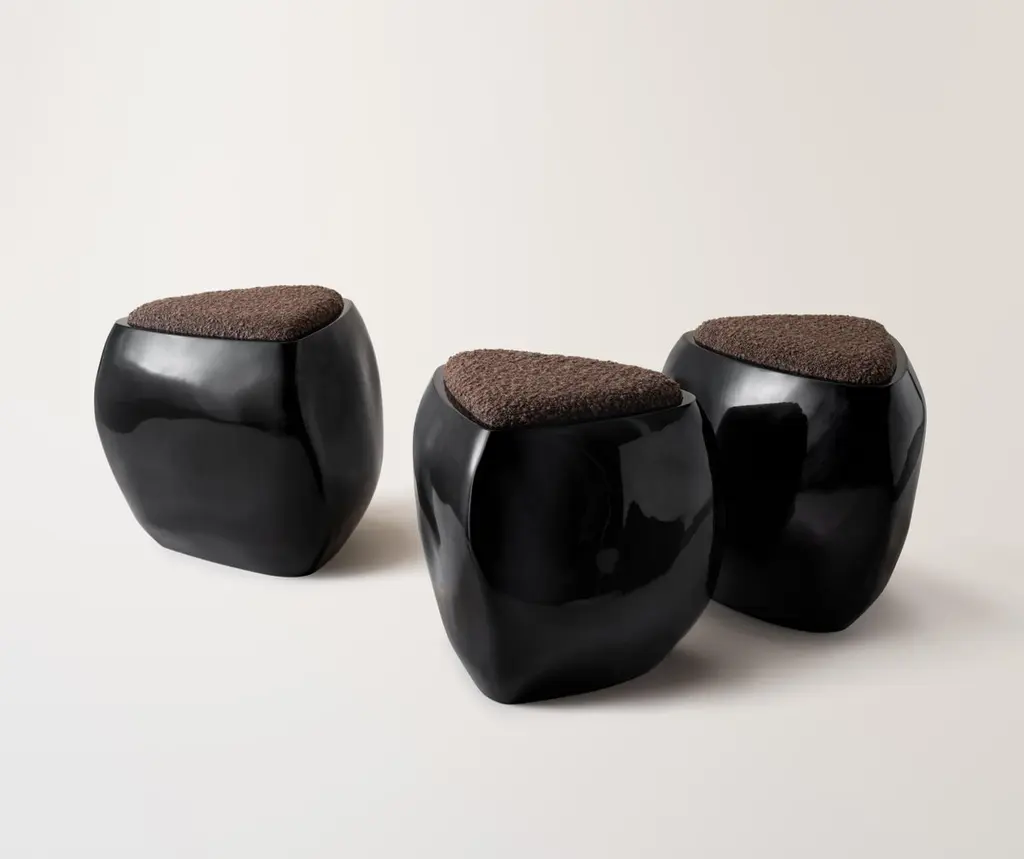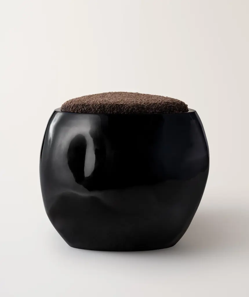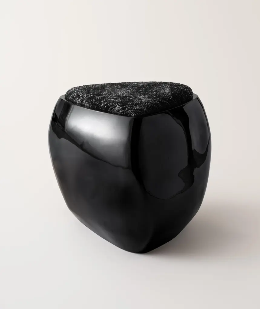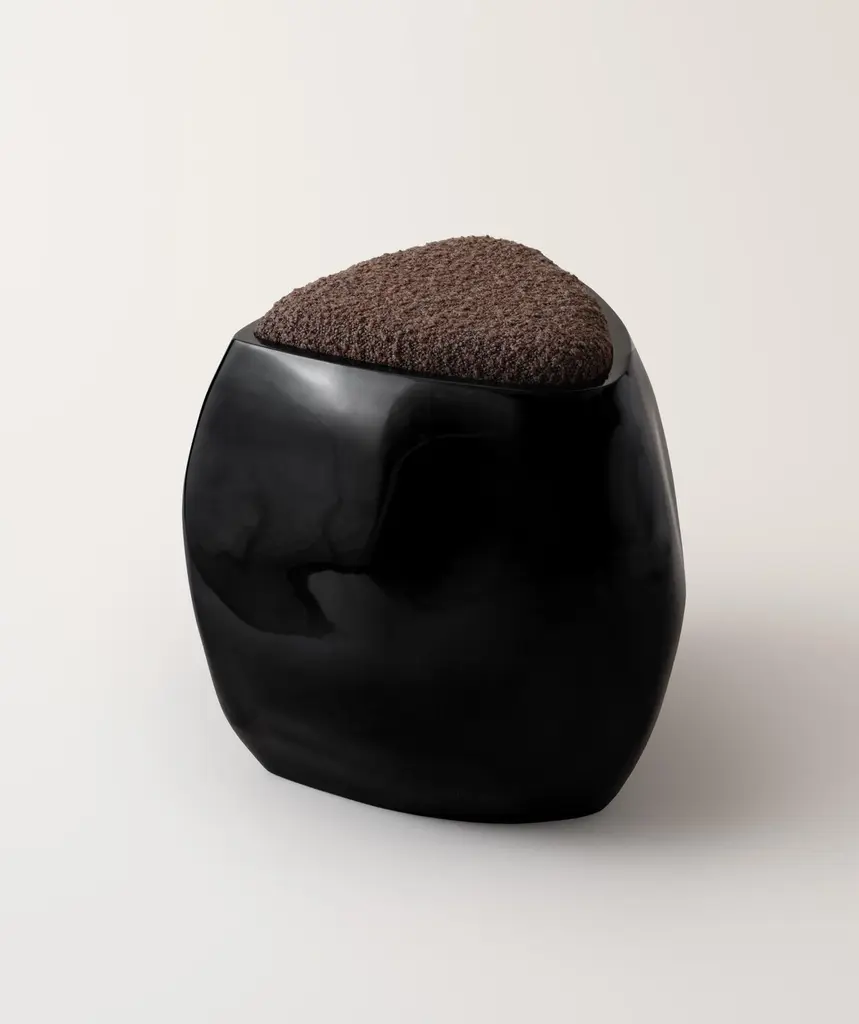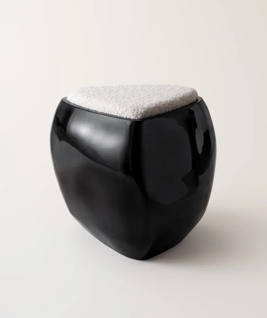 Inspired by stones shaped and polished by ever-evolving bodies of water, the River Stool presents a sculptural, asymmetrical form made up of soft curves and lines. The stool is expertly made by hand-layering fiberglass and gel coat over several days, evoking a sense of fluidity on a solid form.Priced with black high gloss finish and graded-in white boucle. Also available with COM (customer's own material) or COL (customer's own leather), please inquire for pricing.Available in an opaque black high gloss finish, matte black finish, or in a uniquely formulated cream finish combining both opaque and translucent movement. Made by hand in Pennsylvania.