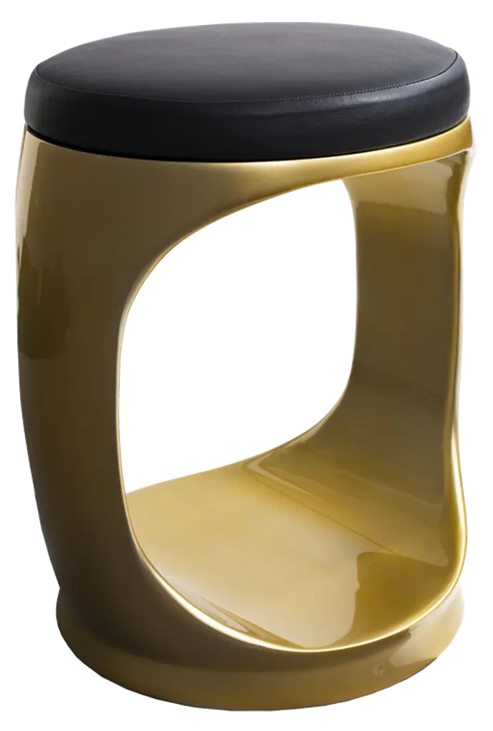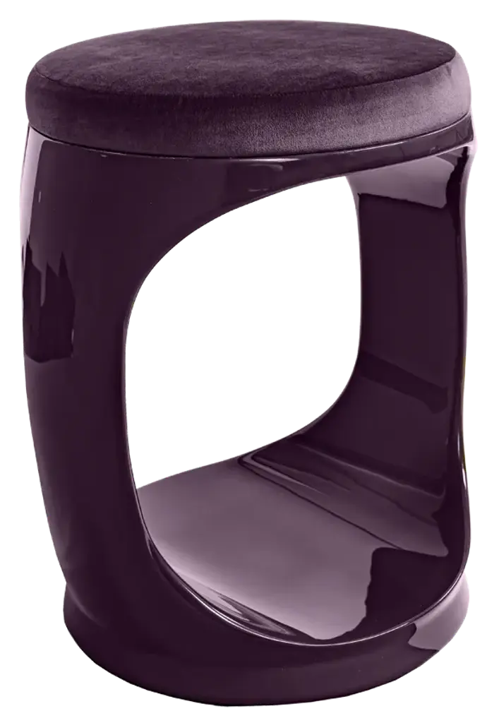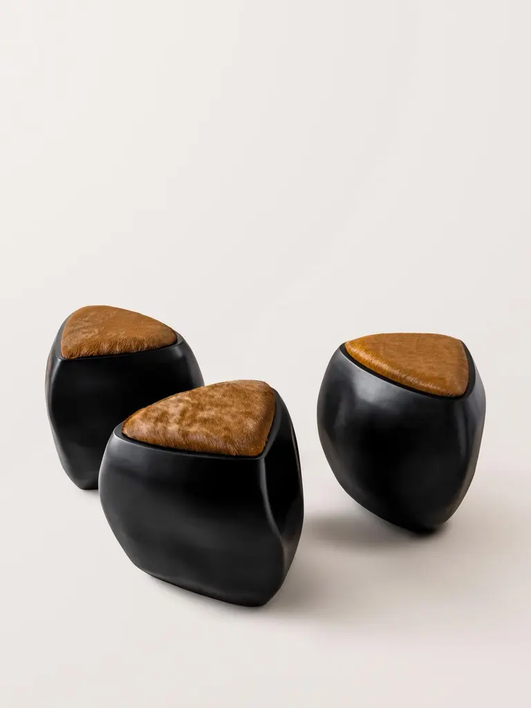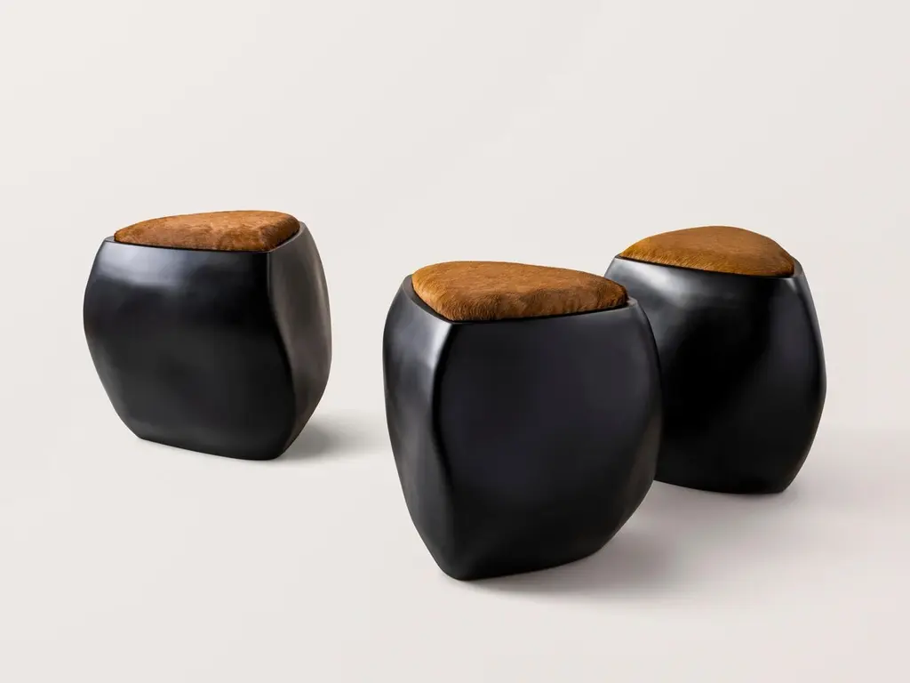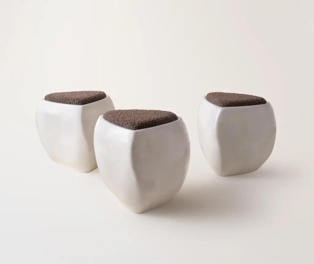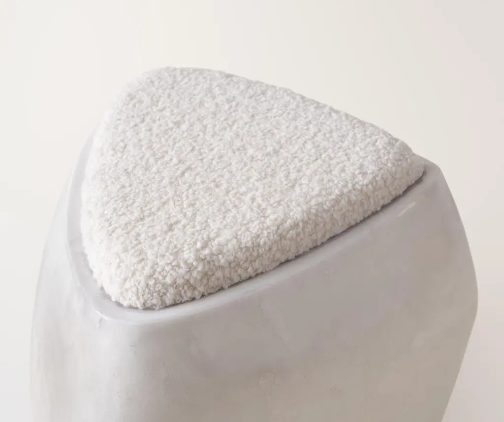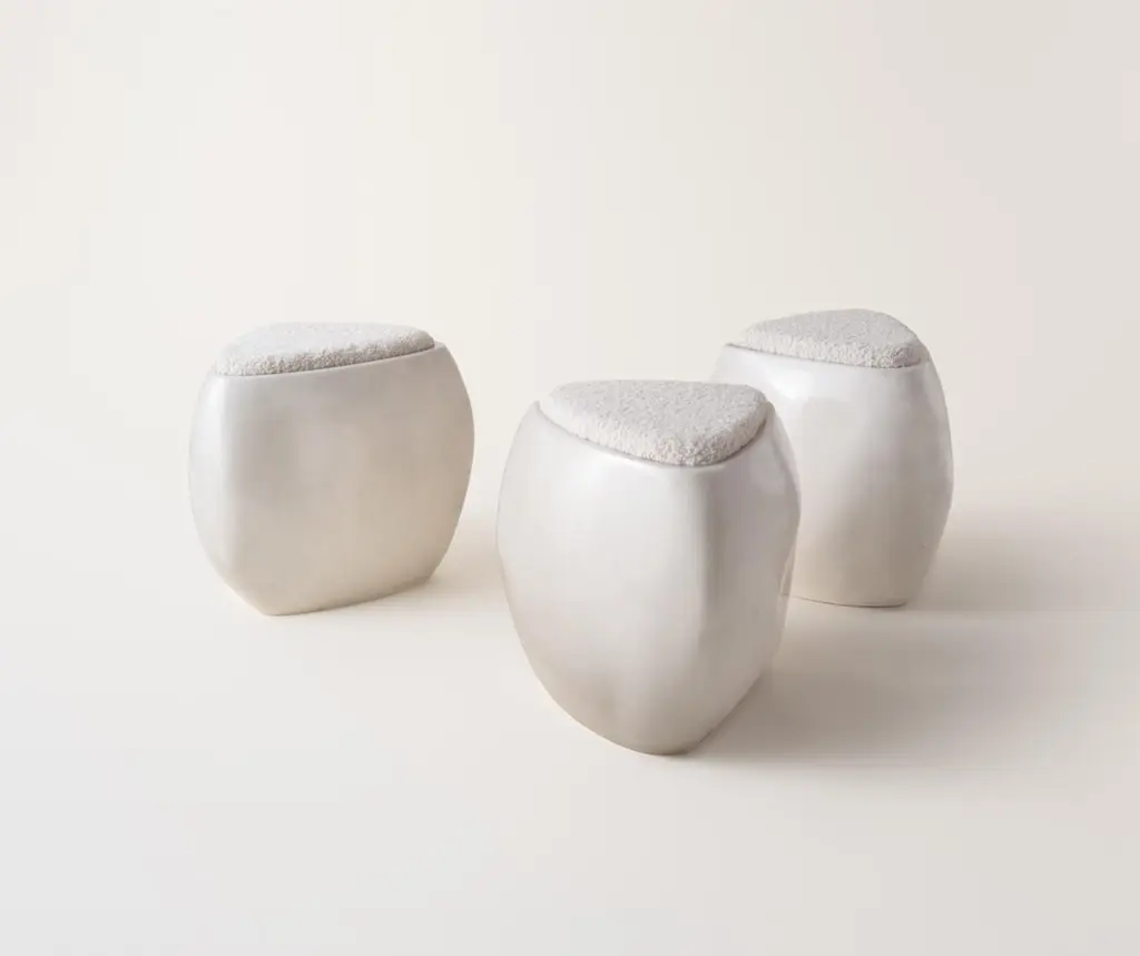 Inspired by stones shaped and polished by ever-evolving bodies of water, the River Stool presents a sculptural, asymmetrical form made up of soft curves and lines. The stool is expertly made by hand-layering fiberglass and gel coat over several days, evoking a sense of fluidity on a solid form.Priced with black high gloss finish and graded-in white boucle. Also available with COM (customer's own material) or COL (customer's own leather), please inquire for pricing.Available in an opaque black high gloss finish, matte black finish, or in a uniquely formulated cream finish combining both opaque and translucent movement. Made by hand in Pennsylvania.