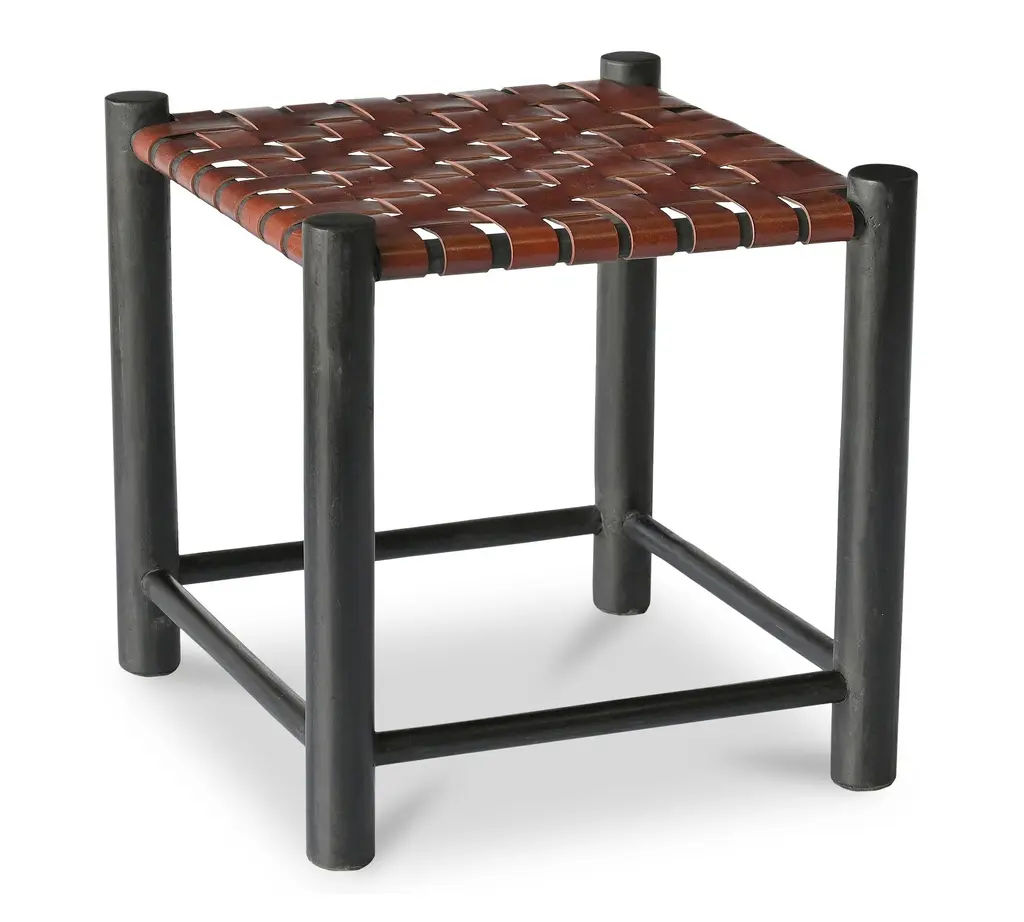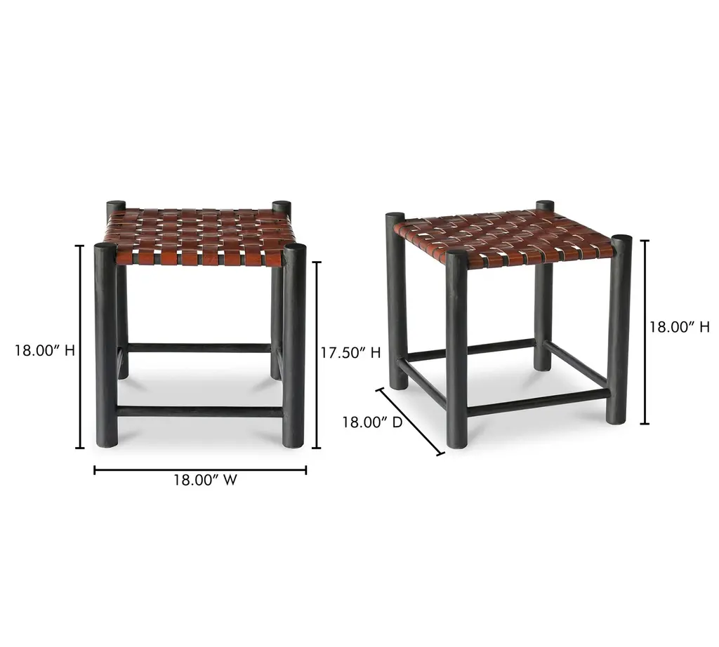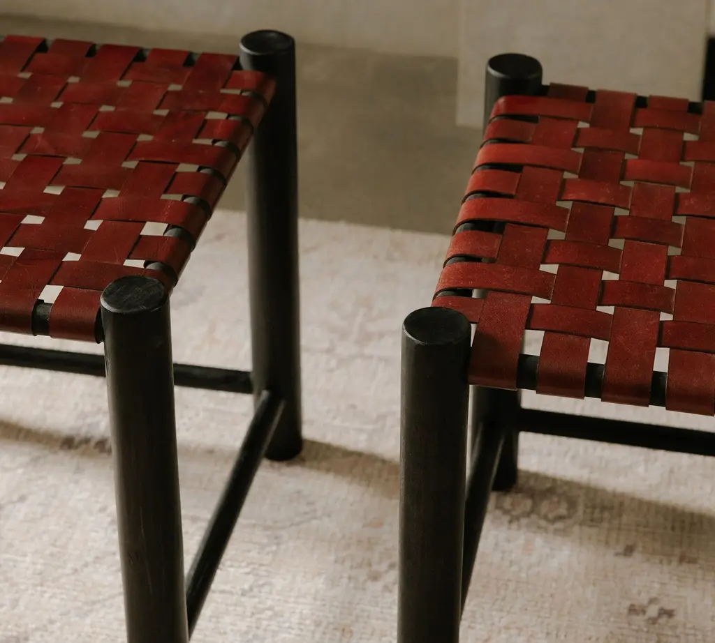 Rustic and refined, this stool will lend your space an aura of lived-in luxury. Chunky legs frame a seat woven from wide straps of top grain buffalo leather, which will lighten, soften, and patina with time and use. Crafted in solid mango, it also gives new life to wood sourced from orchard trees that are no longer able to bear fruit.