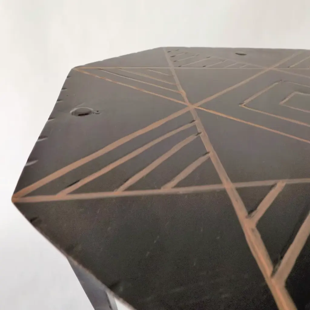 This exclusive metal stool blends elegance and modern design, making it versatile for any space, from kitchens to living rooms. Featuring a hand-engraved top with a Rombo motif inspired by Sardinian textile art, it reflects Eugenio Tavolara's 1950s designs. Its robust, black metal frame is both artistic and functional, highlighting geometric lines with intricate detail. Standing 40 cm tall, this stool showcases artisanal craftsmanship and cultural tribute in one unique piece.