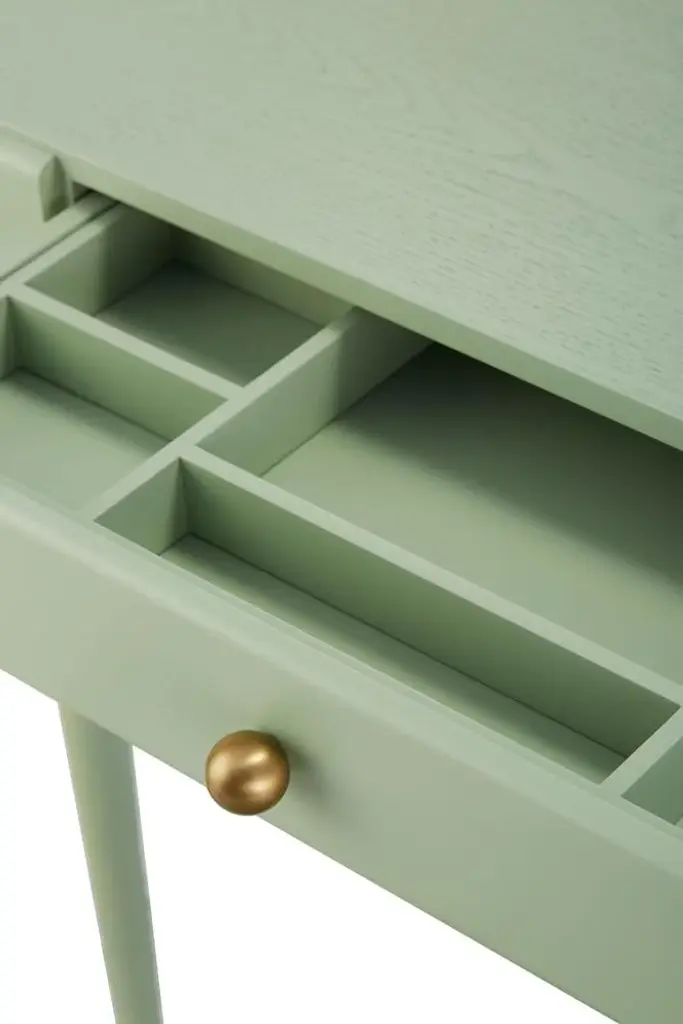 Rose selavy vanity desk with stool by thomas dariel, maison dada measures: vanity desk • w 94 x d 59 x h 139.5 cm stool • w 57 x d 43 x h 64 cm desktop in painted ash veneer • fronts in matte paint finish structure in mdf • metal legs with painted ash veneer fixed accessory compartments in painted ash veneer stool structure in painted mdf • seating upholstered in leather metal parts plated with champagne color finish central mirror • clear mirror sidemmirror • one side clear, one side magnifying