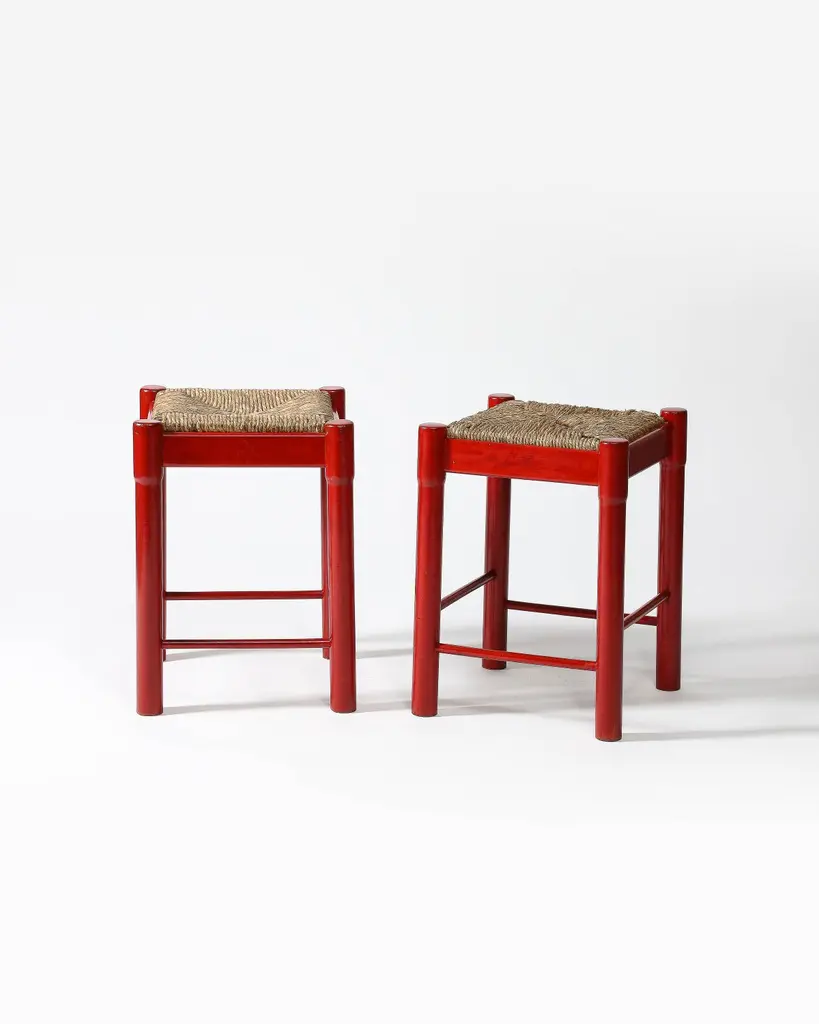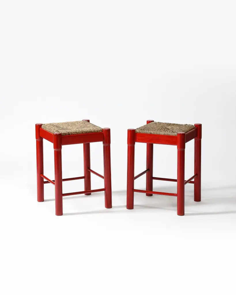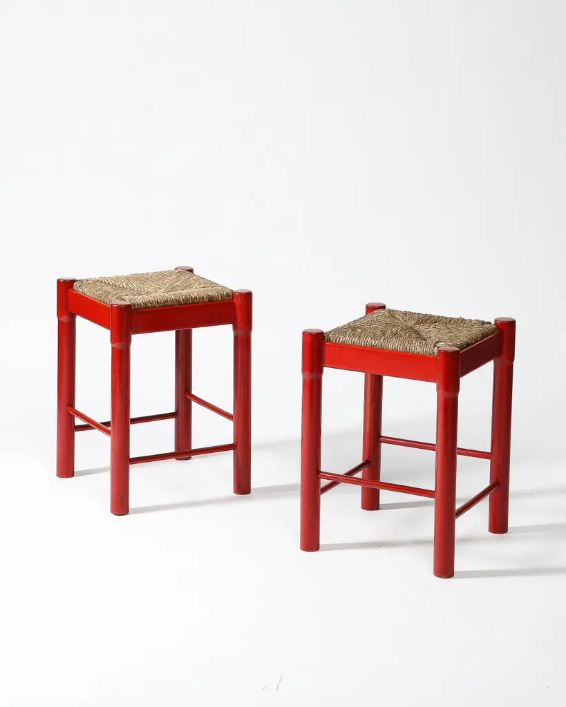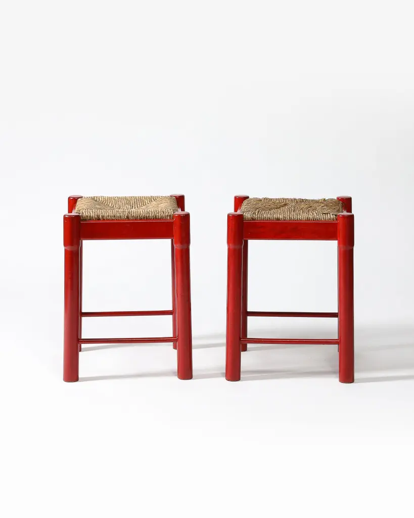 Priced Individually; two available.Bright, charming stools with hand-shaped bases and woven cord seats.