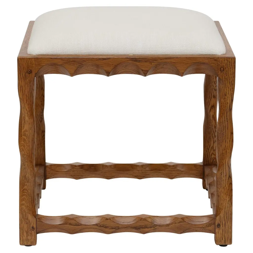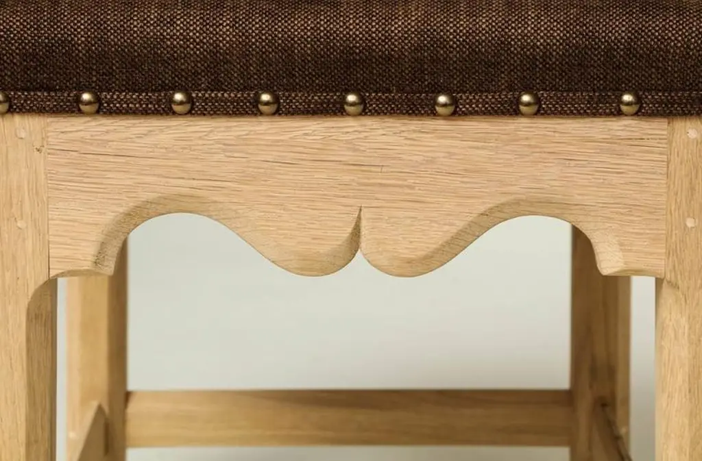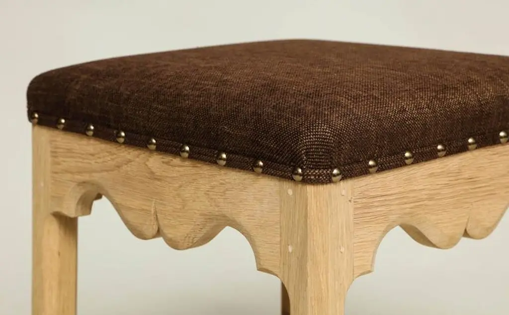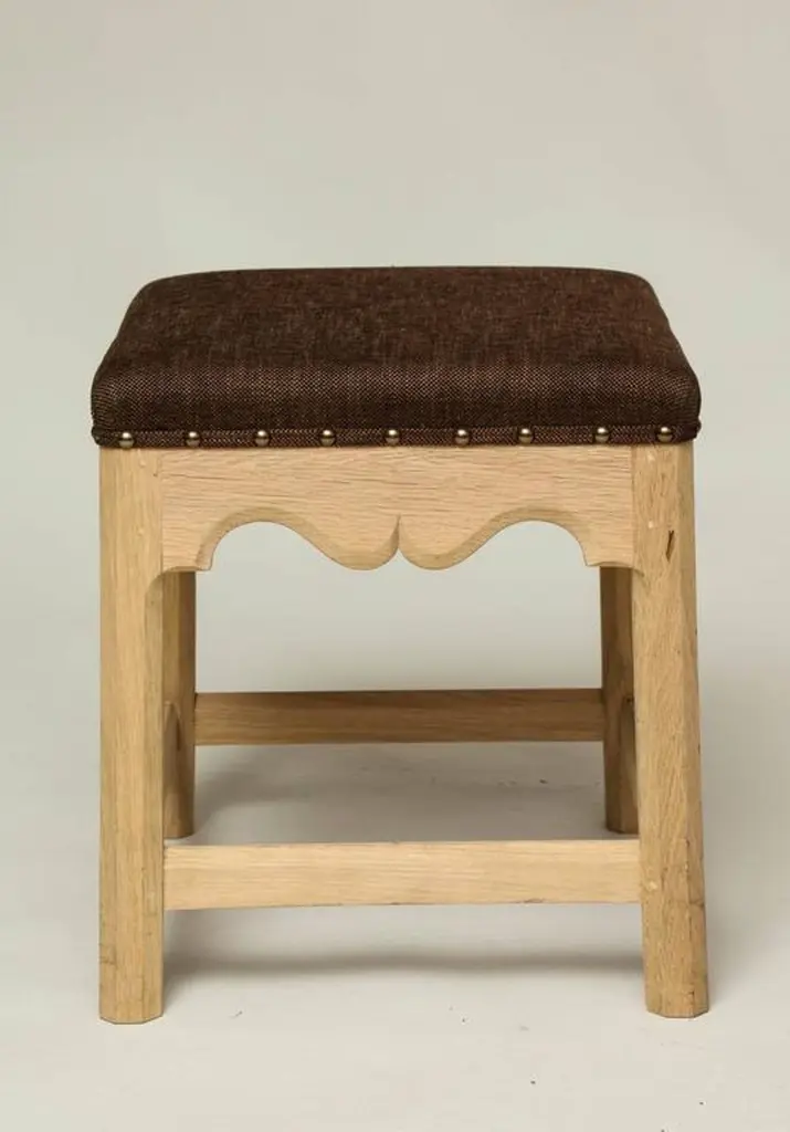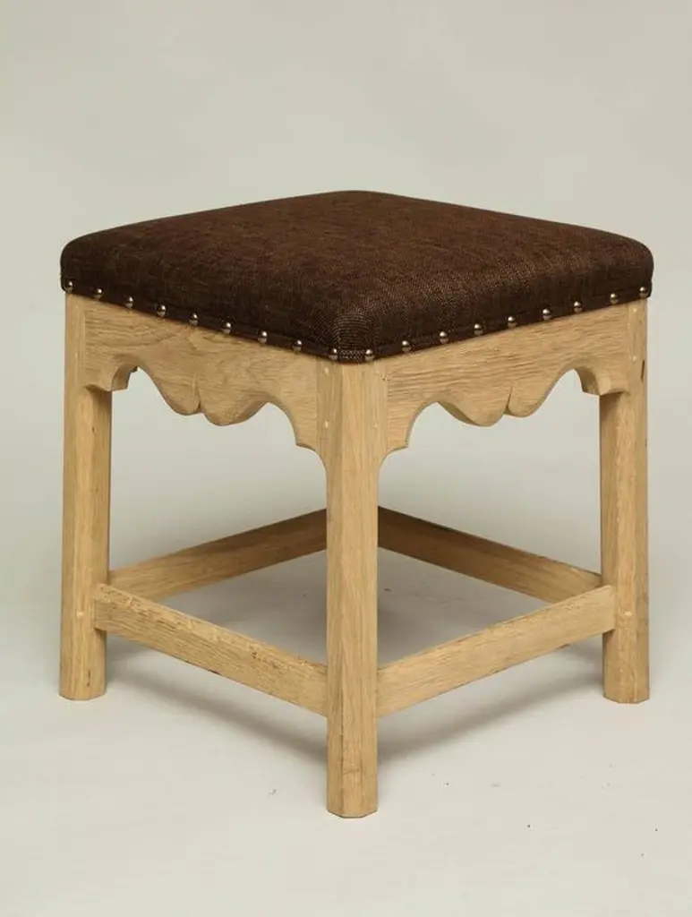 The "Russell" stool, a handcrafted recreation of one of Gordon Russell's earliest and most successful Cotswold School designs, crafted in white oak by Wooster and Essex having an upholstered seat over chamfered legs and stretchers, the aprons with Cupid's bow scalloping, featuring pegged construction and available in a variety of finishes, the example illustrated above in raw white oak with brown linen upholstery.Gordon Russell began making furniture after he returned from the First World War to the village of Broadway, where his family owned the famous Lygon Arms, an ancient coaching inn, and where he set up his workshop. His earliest furniture was in the Arts and Crafts style, such as the present stool, but he was truly a 20th century designer and embraced the use of technology when needed. "Teaching machines manners" is how he summed up his production. Wooster and Essex is reproducing the Russell stool exclusively for Yew Tree House. No returns on custom orders