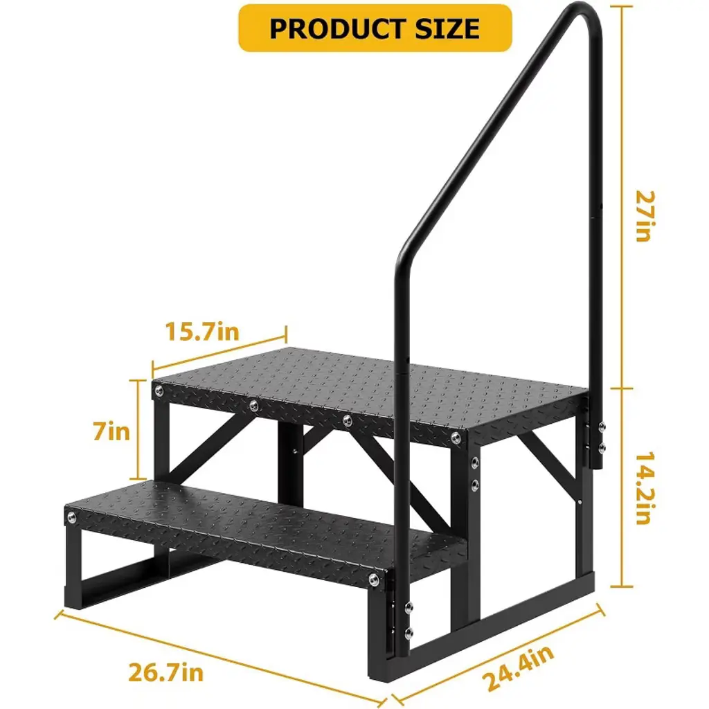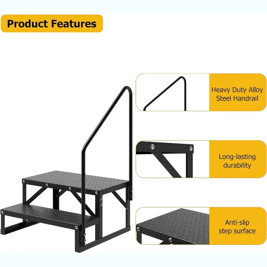 Enhance your outdoor living experience with our Portable RV Steps with Handrails, designed to offer maximum safety and convenience. With a remarkable load capacity of 660 lbs, these stairs are perfect for RV owners, mobile home dwellers, and hot tub enthusiasts. The anti-slip panels ensure that every step is secure, giving you confidence whether you're climbing in or out.The sturdy handrail provides extra support, making these steps ideal for individuals of all ages. Each step is engineered for durability, ensuring that they stand up to the rigors of outdoor use. The integrated wheels enable effortless mobility, allowing you to relocate the steps as needed with minimal hassle.Constructed for both function and safety, these steps are a game changer for outdoor accessibility. Whether you’re camping or enjoying your backyard, they provide a reliable solution for entering and exiting your space comfortably. Invest in your safety and convenience today with our portable RV steps, and enjoy worry-free outings every time!