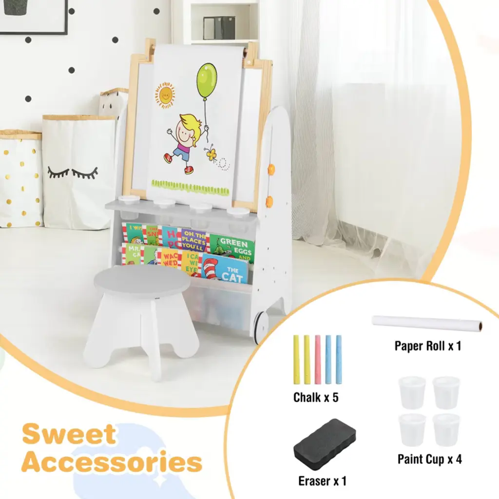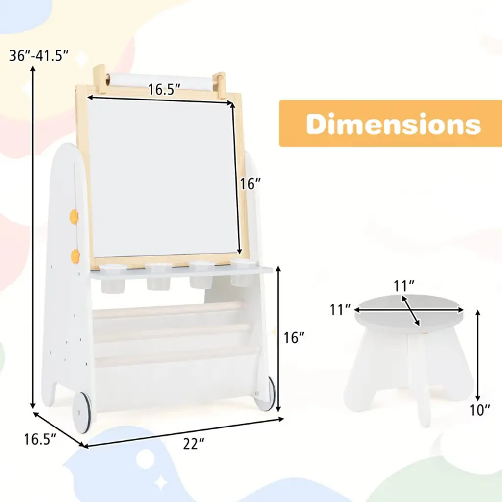 This four-in-one double-sided easel is specially designed for young artists aged 3 and above. One side is a magnetic whiteboard and the other side is a blackboard. Two cloth bags and a bottom storage rack provide ample storage space for art supplies and books. The spacious desktop is very suitable for painting, reading and writing. The easel adopts a height-adjustable design to ensure that children have a comfortable and ergonomic creative space during their growth. The easel is equipped with a stool, five pieces of chalk, four paint cups, an eraser and a paper roll.Color: Gray + White + Natural Material: MDF + Pine Wood Art Easel Size: 22" x 16.5" x 36"-41.5" (L x W x H) Whiteboard/Blackboard Size: 16.5"x 16" (L x W) Tabletop Size: 19.5"x 10"x 16" (L x W x H) Stool Size: 11"x 11" x 10" (L x W x H) Paper Roll Length: 10 ft Weight Capacity of Stool: 165 lbs Suitable Age: 3+ Years Old Net Weight: 21.5 lbs Package Includes: 1 x Kids Art Easel 1 x Stool 5 x Chalks 4 x Paint Cups 1 x Board Eraser 1 x Paper Roll 1 x User Guide