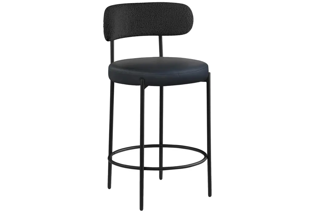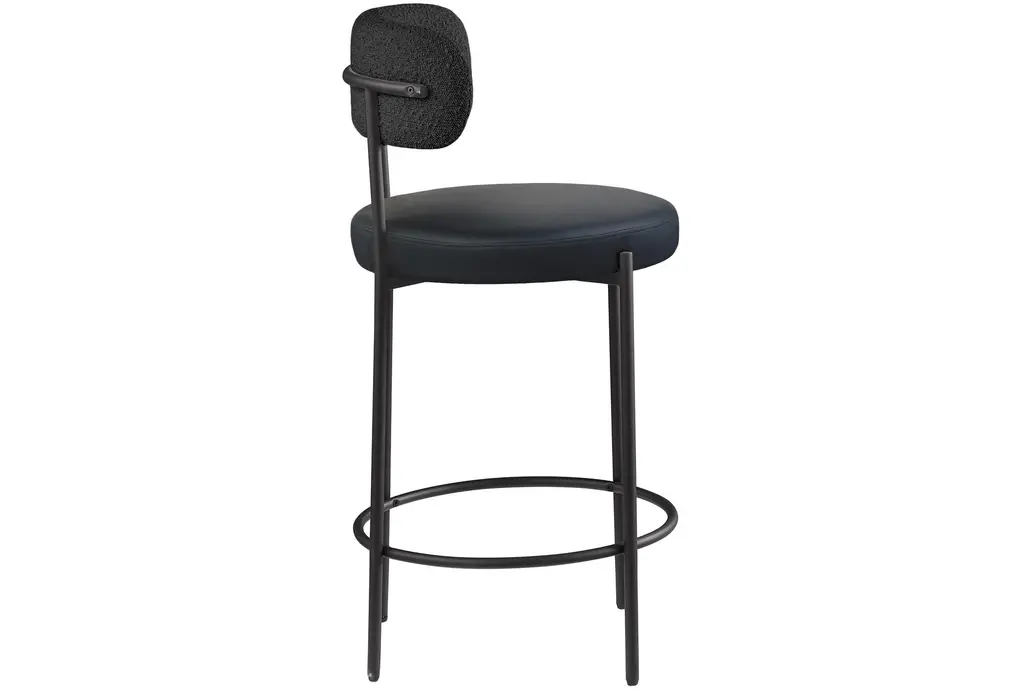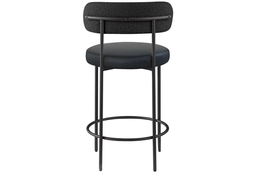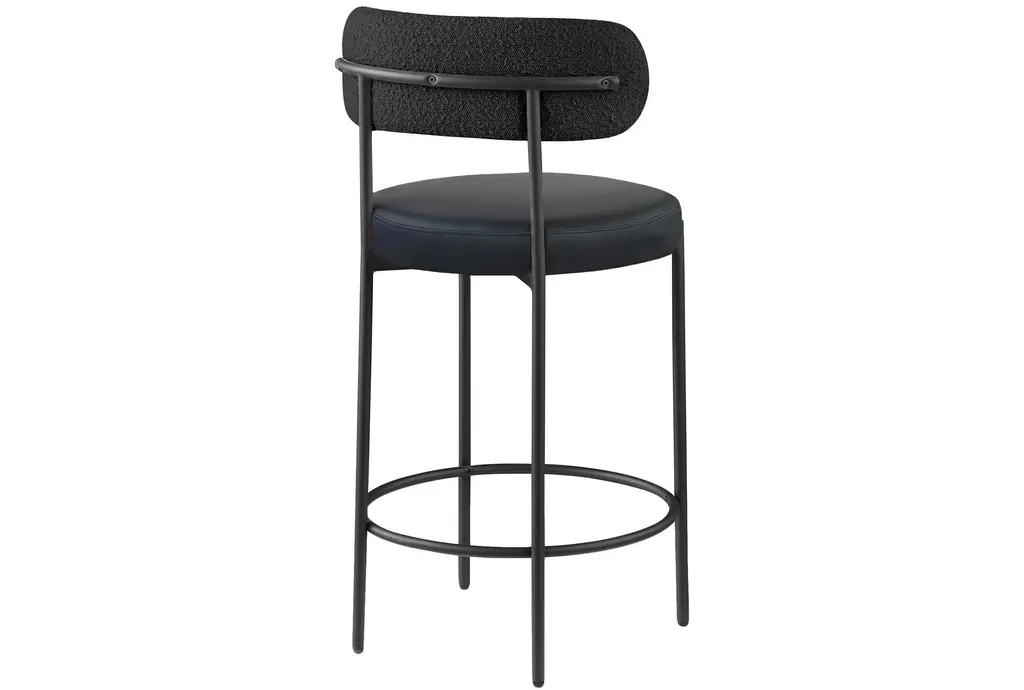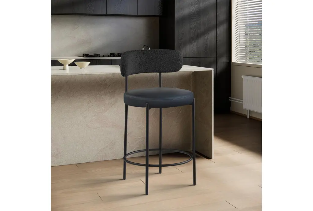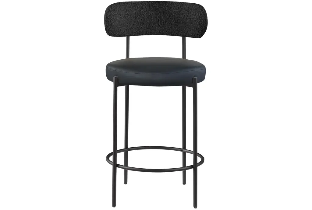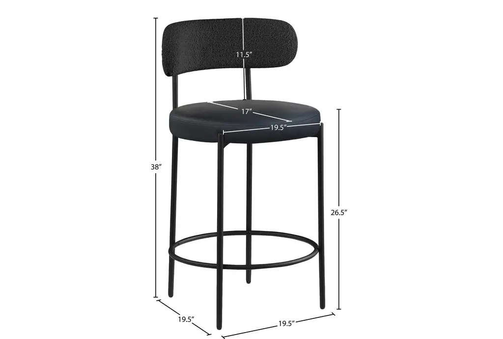 Enhance your modern living space with the Sagen Black Vegan Leather 38" Counterstool with Black Leg Frame Set of 2. These stylish counterstools feature a sleek design that seamlessly blends modern and mid-century modern aesthetics. The combination of vegan leather and boucle fabric offers a luxurious and comfortable seating experience.