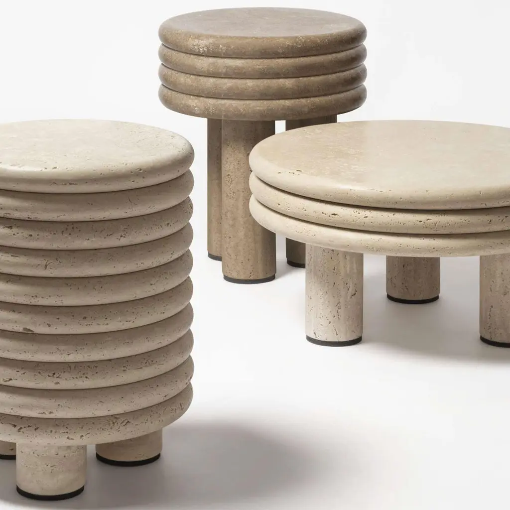 For nearly twenty years, the Giobagnara brand has combined traditional know-how and leading-edge technology to produce elegance of the highest standard. With luxurious creations available in a unique and virtually limitless color palette of leathers and suede, Giobagnara now boasts one of the most comprehensive offers of leather home accessories on the market.This line objects was inspired by the “stacked” shape often seen at the base of some buildings in Italy, as well as Salvatore Ferragamo’s celebrated heel. The Scala collection features a selection of furnitures such as stools, tables, end tables, nightstands and sideboards, as well as small interior decor and accessories such as centerpieces, boxes, lanterns and vases, which all have an identical recurring motif, layered and highlighted by deliberately thick legs, that lends a delicate graphic line. At times, a pure cylindrical shape stands alone; at others a duo or a trio form a stool or occasional table. The key to these pieces’ elegance is absolute precision of proportions. A choice of light, dark or muted colours creates the option to match or vary colours and contrasts. All made of travertine.
