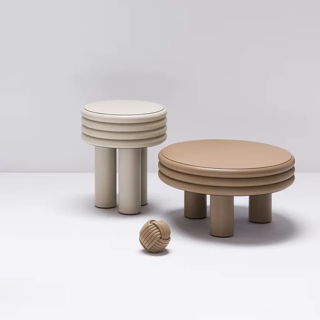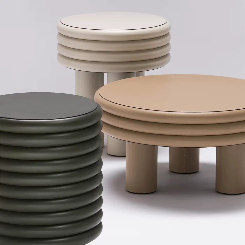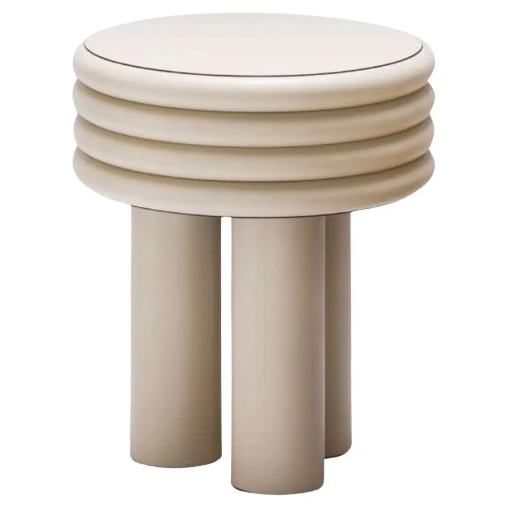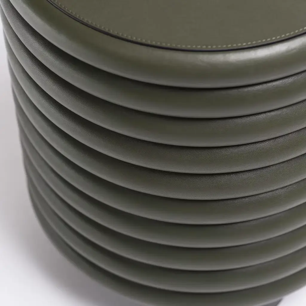 Part of the Scala Collection of furniture pieces, this stool is characterized by a stacked, circular shape entirely wrapped in dark green leather and supported by three short cylindrical legs. Italian shoe designer Salvatore Ferragamo's iconic stacked heel was the source of inspiration for this unique and dynamic design created by Stéphane Parmentier exclusively for Giobagnara.