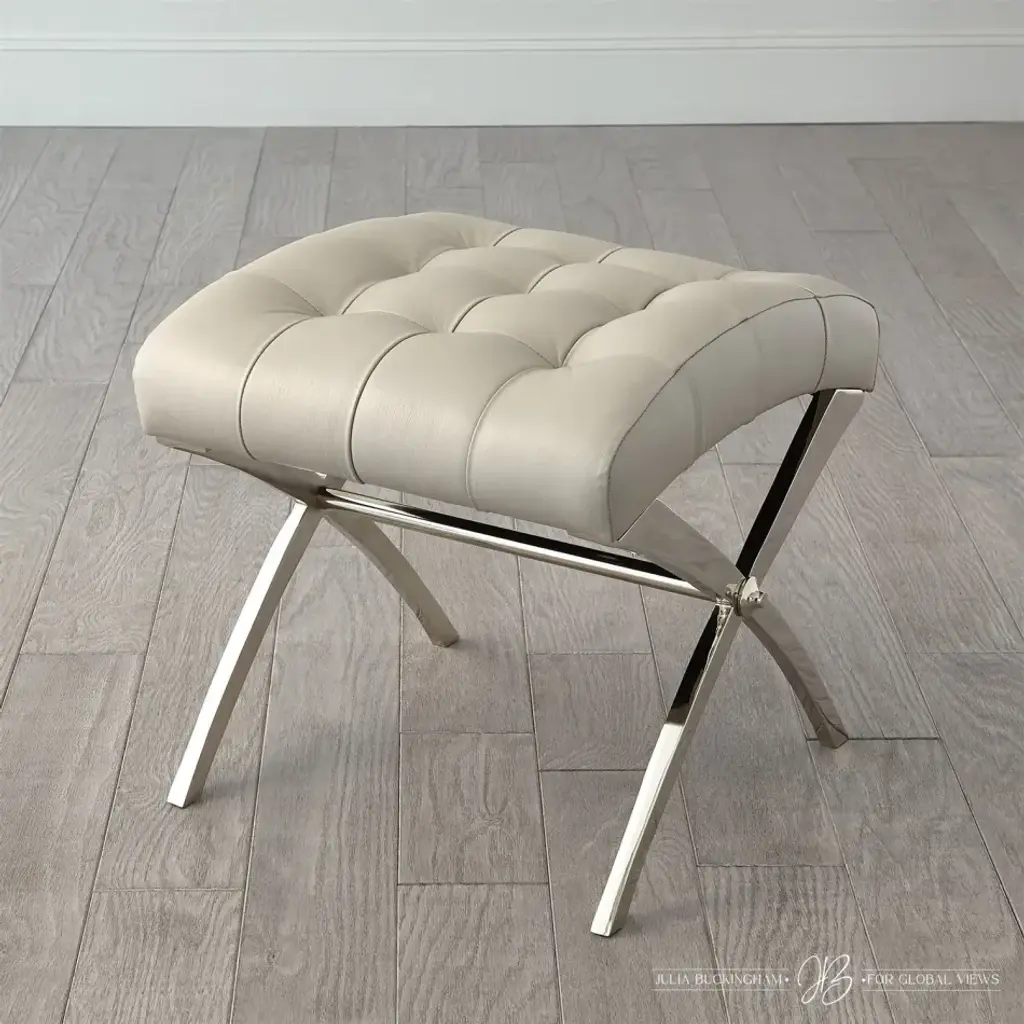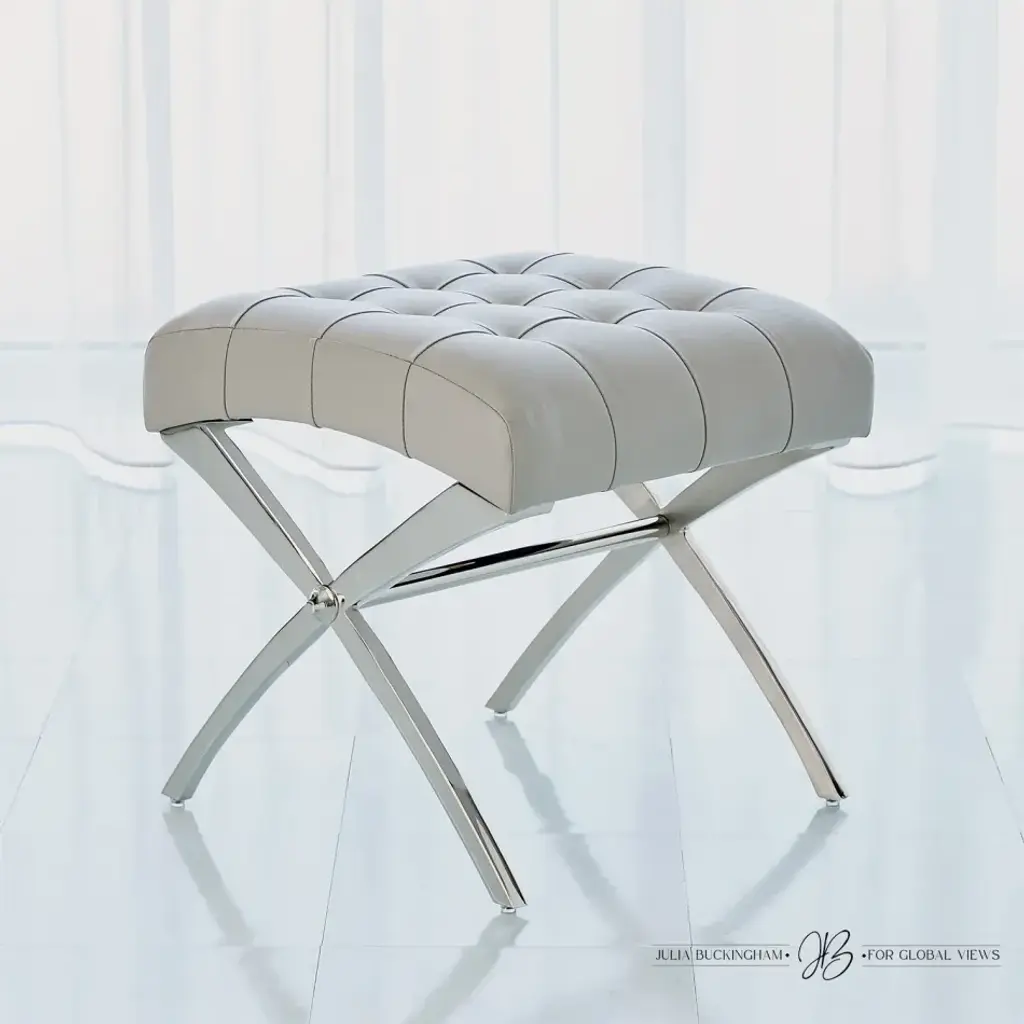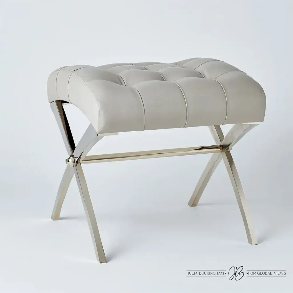 Tufted Gray leather and nickel have never looked so good. Pull up the Scarlet stool to a vanity, use as extra seating in your living room, or as an accent piece underneath a console. The Scarlet is modern in vibe and blends seamlessly with mid-century décor or with rustic wood pieces to create your own unique space. From a fashion forward perspective, Global Views offers accessories, furniture, statement lighting, and an assortment of rugs and mirrors to add beauty and joy to your home.