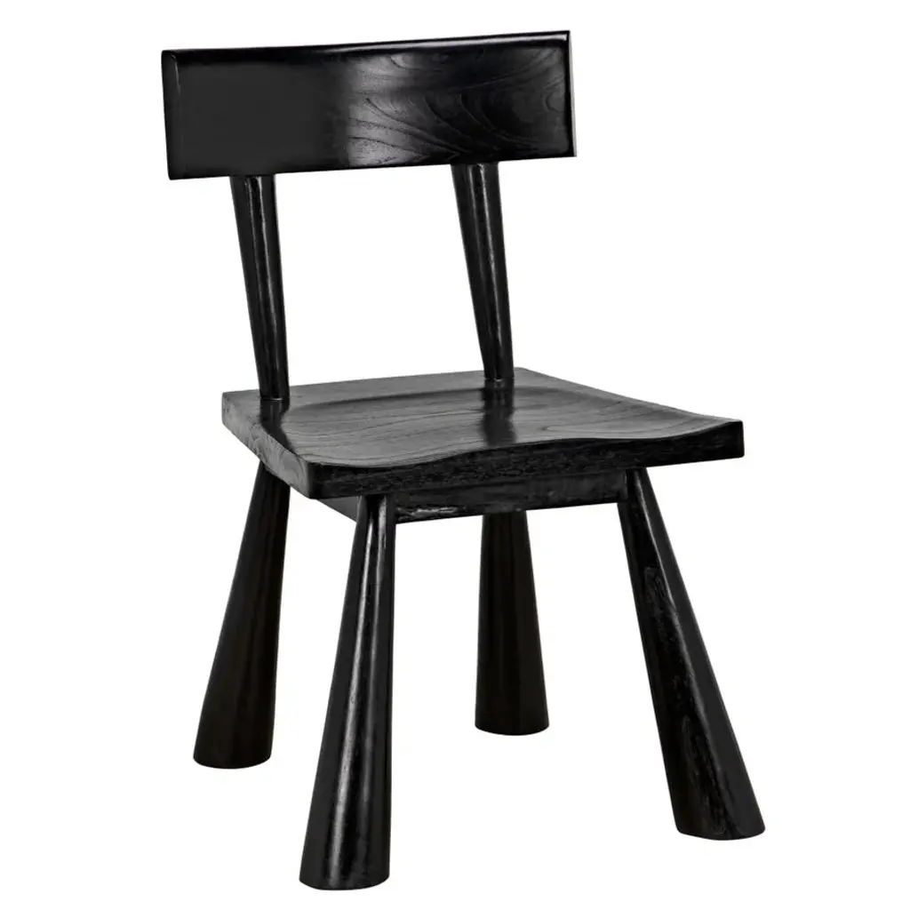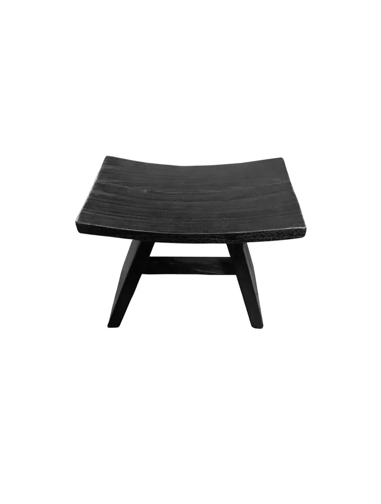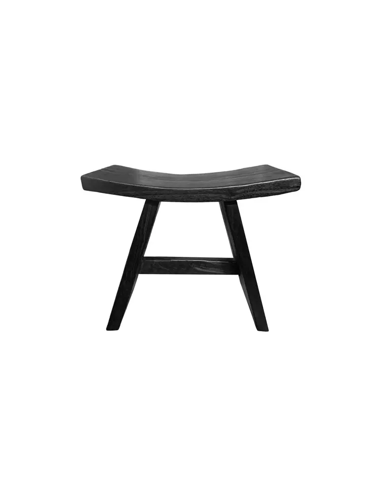 A wonderfully sculptural mango wood stool with angular legs and a curved seat. To achieve its rich black pigment the wood was burnt multiple times and then finished with a clear coat. Its neutral color and minimalist shape make it suitable for any space.