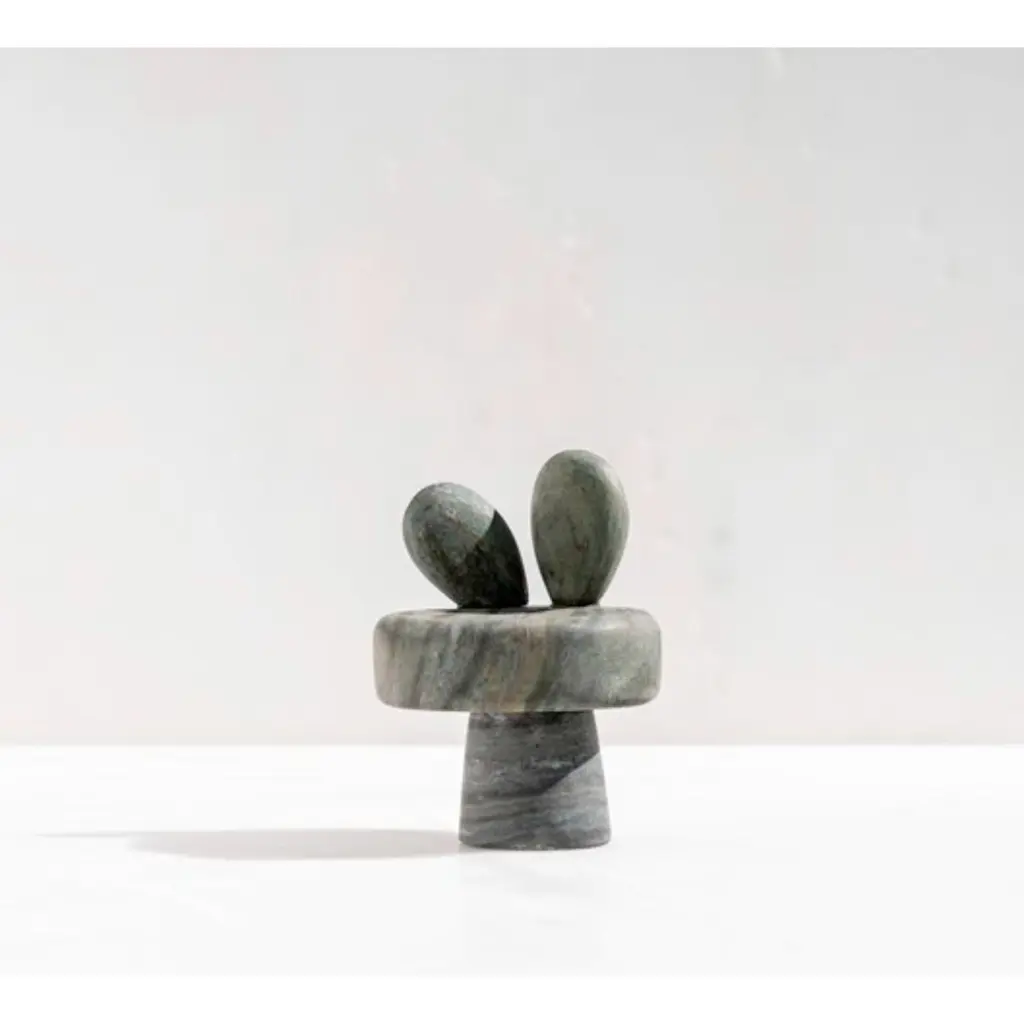 Sculptural Stool by ON.ENTROPYDimensions: W 58 x D 58 x H 59 cmMaterials: Green Marble.on• entropy is a marble atelier established in 2009 in Athens and London with a focus on metamorphosis. Expanding from object to space consciousness. Marble, an archetypal Greek material, takes on an unconventional role in on• entropy's designs; they encapsulate the contradiction of being heavy and compact and at the same time vulnerable, fragile and translucent. Its diverse character is the core of the atelier’s founding mission: to experiment with marble and its entropy; its potential for metamorphosis, embracing its inherent limitations. The result is the craftsmanship of intricate and delicate sculptures, evolving its diachronic qualities in an imaginative & contemporary way. Created and run by sisters Niki and Zoe Moskofoglou, on• entropy is the fruit of a 40-year long, family affair with marble in Greece. NM is an architect with an academic training in Design. Her work demonstrates an architectural detailing and instinct of how Space and Object can surpass mere function. ZM is a civil engineer with expertise in Sustainable Heritage. She cultivates her passion in the marriage of cultural and natural environment through academic research in Cultural Landscapes. NZM founded their design studio to reflect both art and craft. Pushing the boundaries of marble, their work begins with the human experience and an interaction with the senses; it demands contemplation.