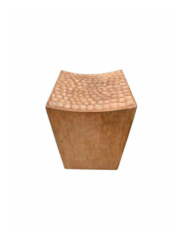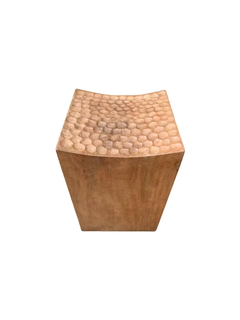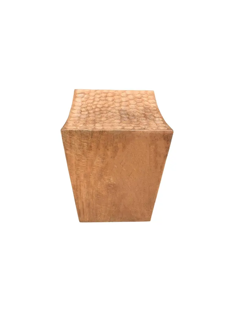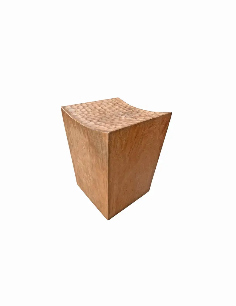 A wonderfully sculptural stool with mix of wood textures and shades. A uniquely sculptural and versatile piece, this chair was crafted from a single block of mango wood and has a smooth texture. Meticulously carved, sanded and smoothed to the perfect shape. Unique to this stool is the hand-hewn design that adorns the seat.