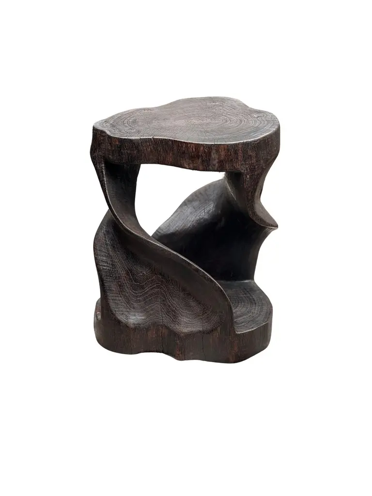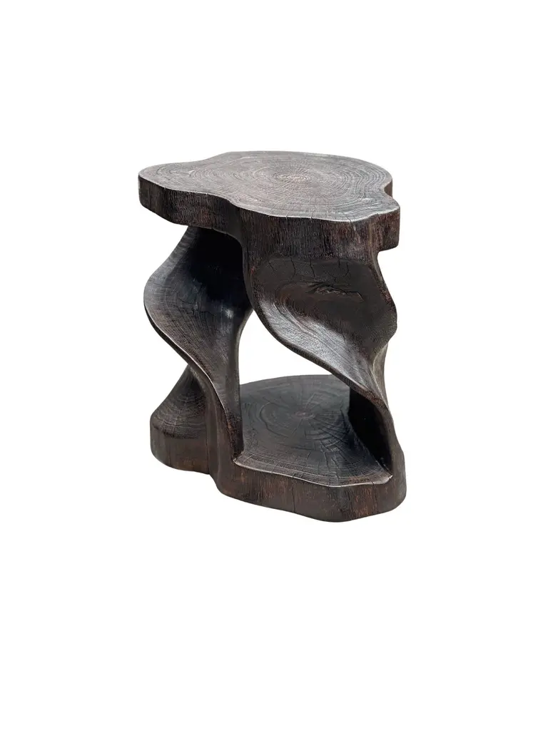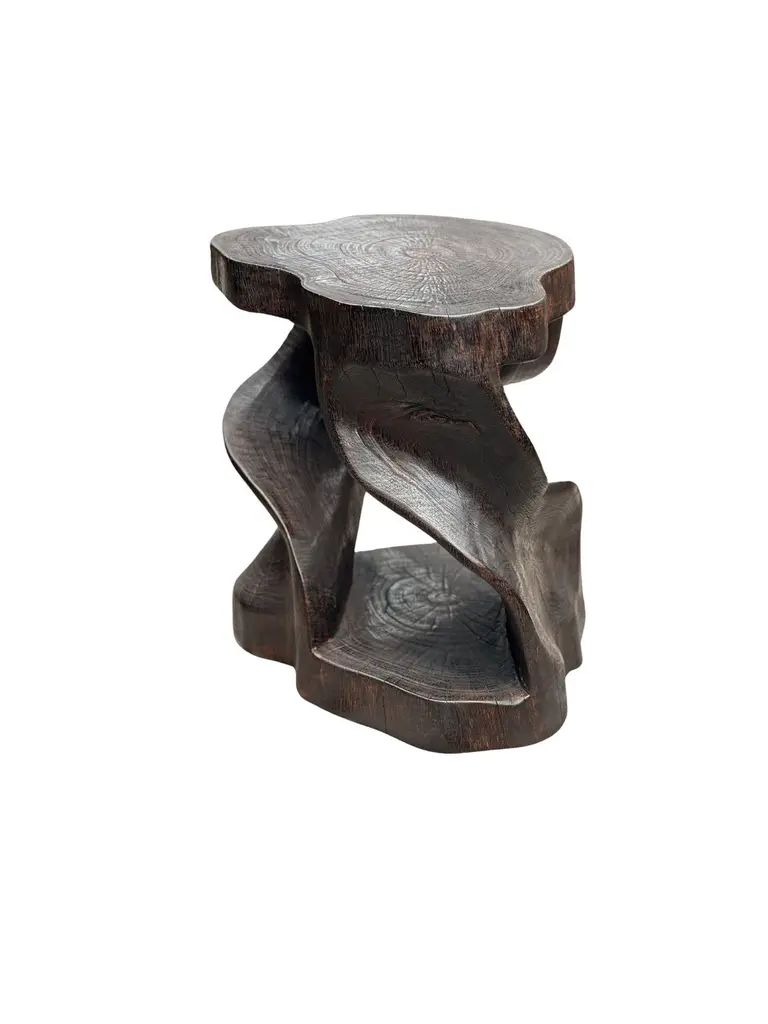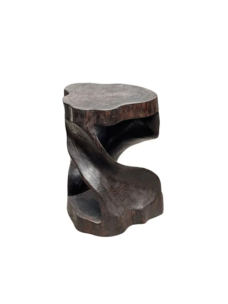 A wonderfully sculptural stool, with a mix of wood textures and shades. It features a spiral design, with an exposed core. A uniquely sculptural and versatile piece, this chair was crafted from a single block of mango wood and has a smooth texture. Meticulously carved, sanded and smoothed to the perfect shape. To achieve its color the stool was burnt multiple times & finished with a clear coat.