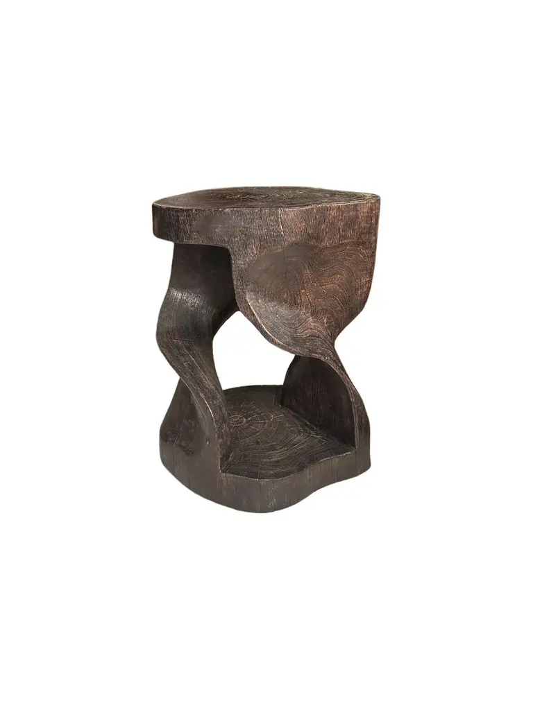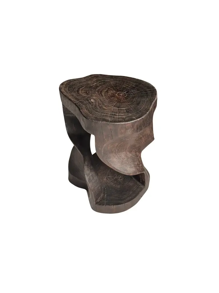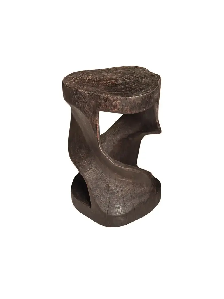 A wonderfully sculptural stool, with a mix of wood textures and shades. It features a spiral design, with an exposed core. A uniquely sculptural and versatile piece, this chair was crafted from a single block of mango wood and has a smooth texture. Meticulously carved, sanded and smoothed to the perfect shape. To achieve its color the stool was burnt multiple times & finished with a clear coat.