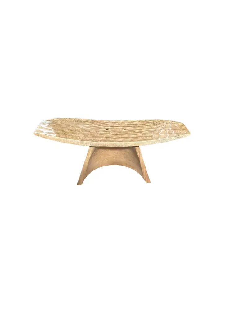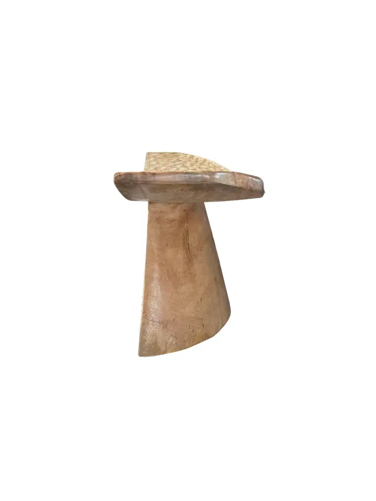 A wonderfully sculptural stool with a curved seat and hand hewn detailing. The stool's neutral pigment and subtle wood texture makes it perfect for any space. A uniquely sculptural and versatile piece. This stool was crafted from mango wood.