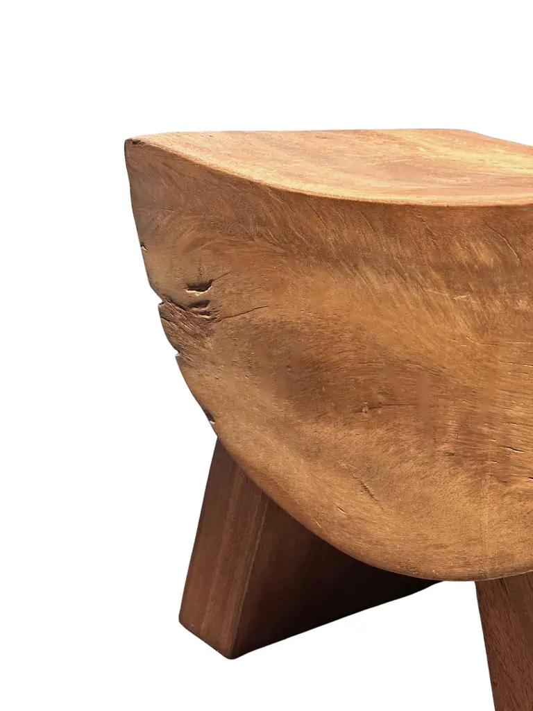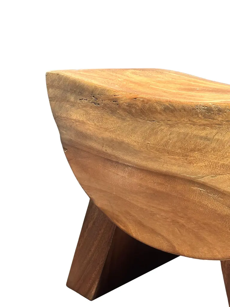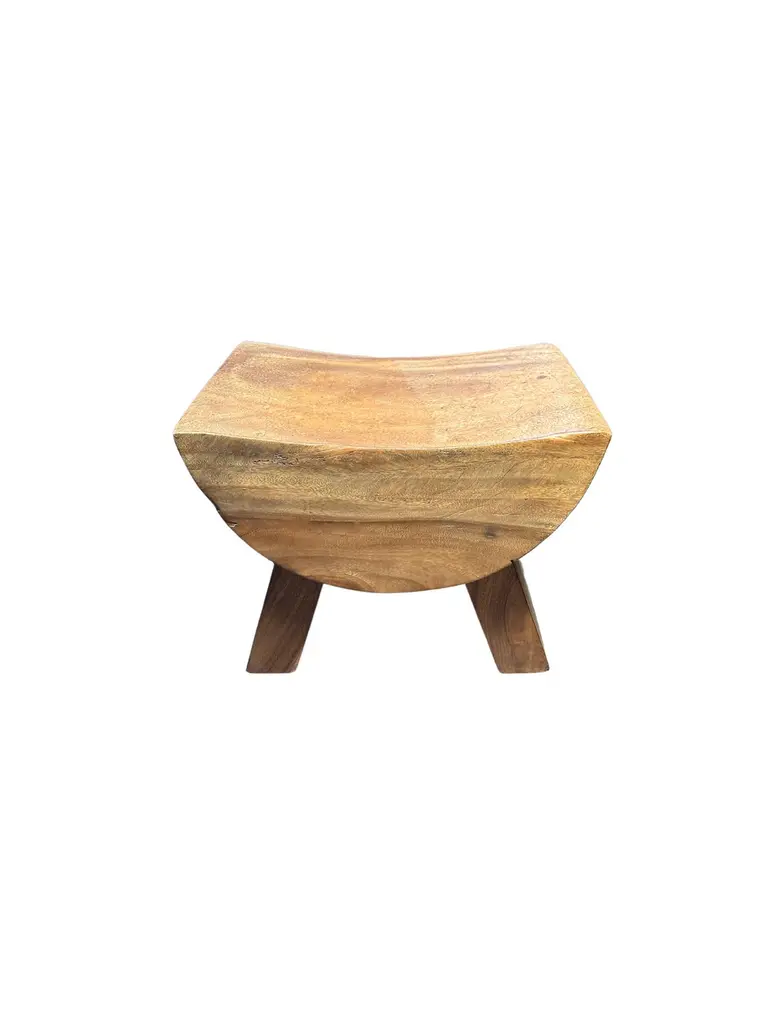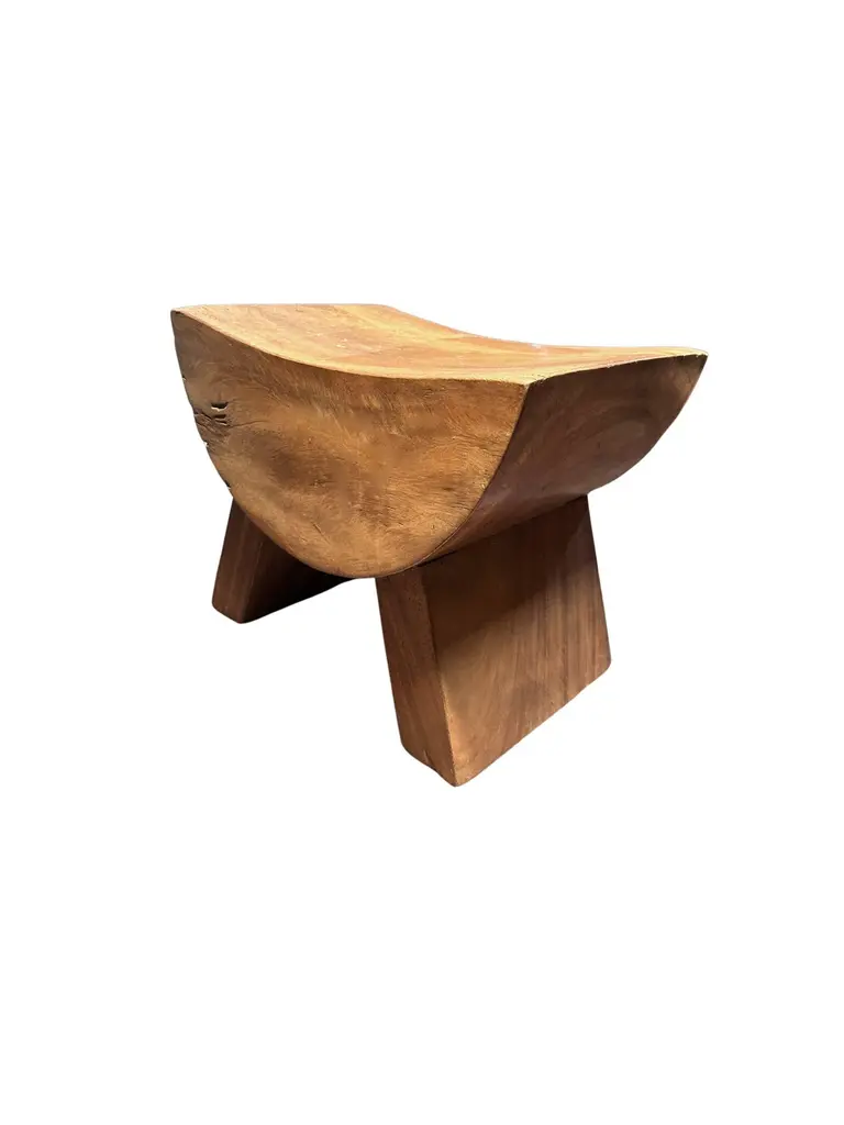 A wonderfully sculptural stool with a curved seat. The stool's neutral pigment and subtle wood texture makes it perfect for any space. A uniquely sculptural and versatile piece. This stool was crafted from Suar wood.