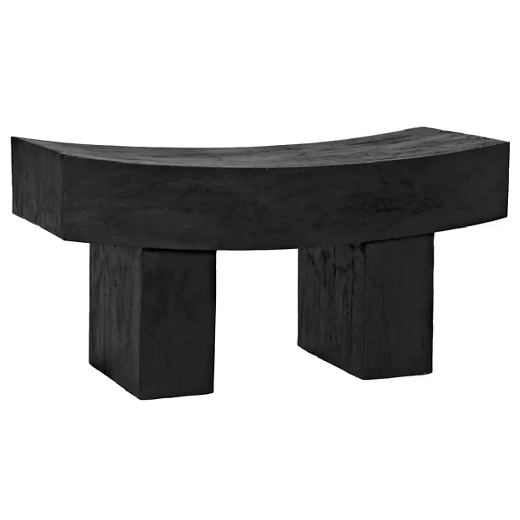 A wonderfully sculptural teak wood stool featuring a curved seat. The mix of wood textures and shades adds to its charm. Its neutral color and minimalist shape make it suitable for any space. To achieve its dark black pigment the wood was burned several times and finished with a clear coat.