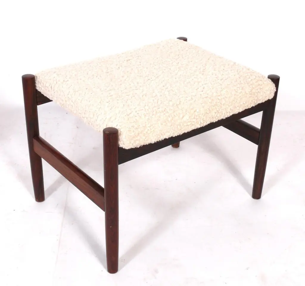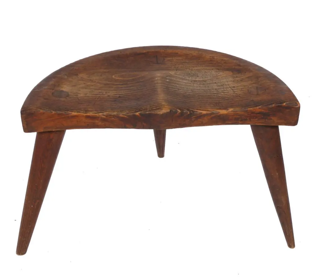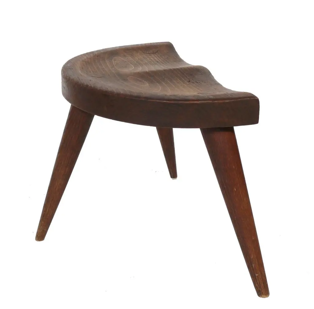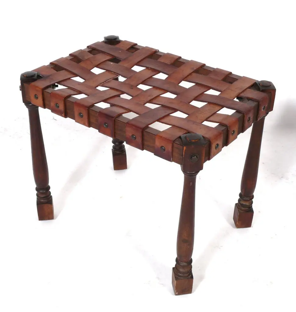 Selection of stools or ottomans. They are priced at $750 each. Clockwise from the top left, they are:1) Wood and leather strapped stool, probably Mexican, circa 1950s. It measures 17.5"H x 14.5"D x 21"W. SOLD2) Danish Modern rosewood and faux sheepskin stool, Danish, circa 1960s. It measures 15"H x 16"D x 21"W. SOLD3) Thebes stool with woven string seat, probably Asian, circa 1960s. It measures 15"H x 14.5"D x 14.5"W. 4) Rustic tripod milking stool, American, circa 1940s or earlier. It measures 12.25"H x 10.5"D x 18.25"W.