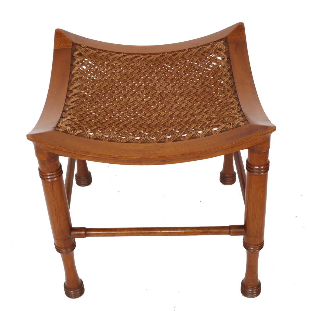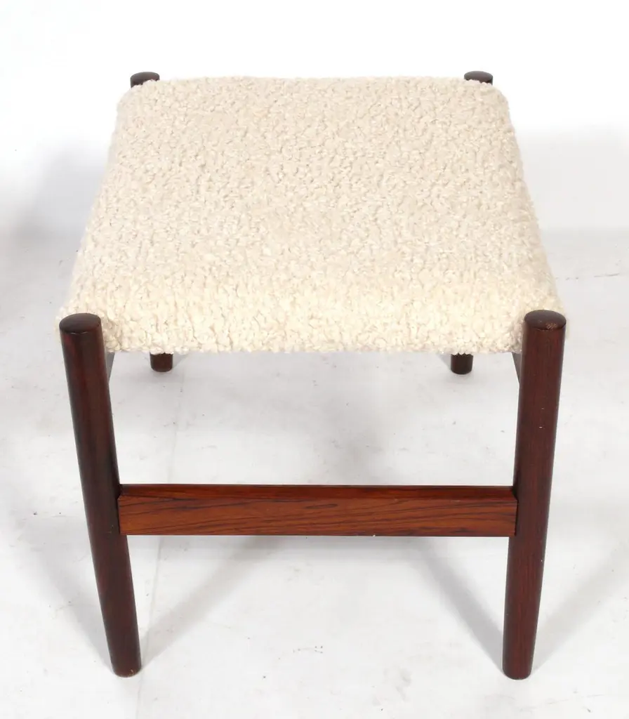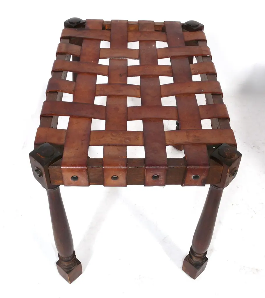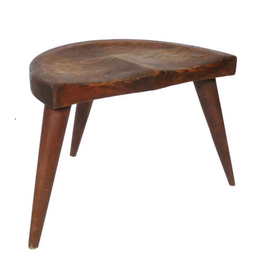 Selection of stools or ottomans. They are priced at $750 each. Clockwise from the top left, they are:1) Wood and leather strapped stool, probably Mexican, circa 1950s. It measures 17.5"H x 14.5"D x 21"W. SOLD2) Danish Modern rosewood and faux sheepskin stool, Danish, circa 1960s. It measures 15"H x 16"D x 21"W. SOLD3) Thebes stool with woven string seat, probably Asian, circa 1960s. It measures 15"H x 14.5"D x 14.5"W. 4) Rustic tripod milking stool, American, circa 1940s or earlier. It measures 12.25"H x 10.5"D x 18.25"W.