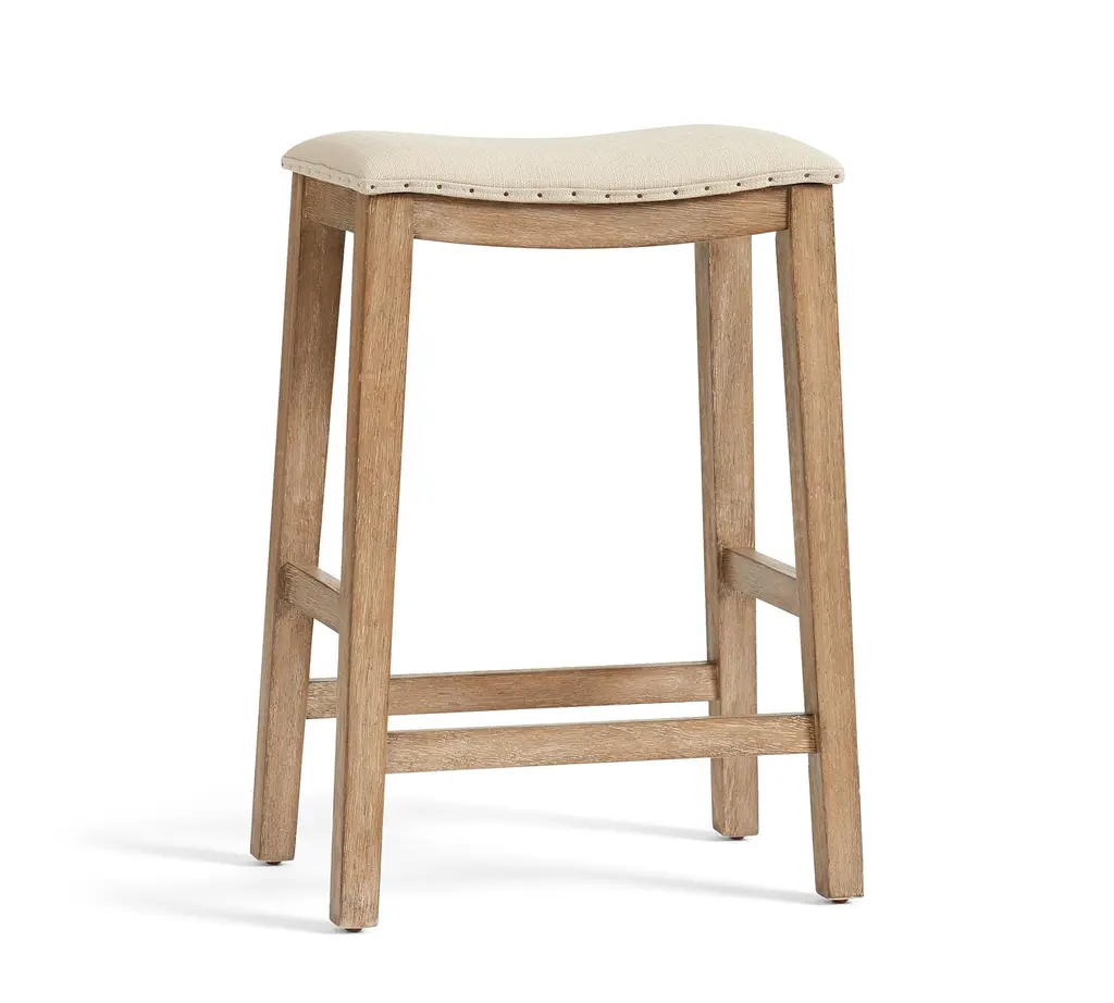 This stylish counter stool fits in almost anywhere – whether in a kitchen nook or a corner work space. It’s topped with a slightly dipped cushioned seat for comfort and sits on a sturdy Weathered Gray wood base. Upholstered in Oatmeal Brushed Crossweave, it’s detailed with a gimp around the edges and trimmed with pin nailheads.