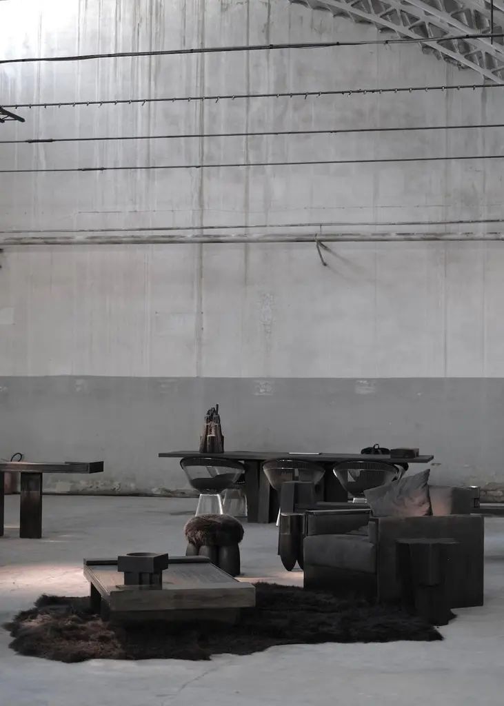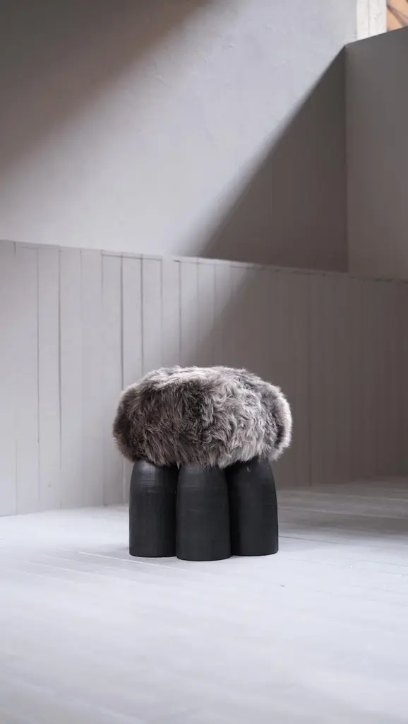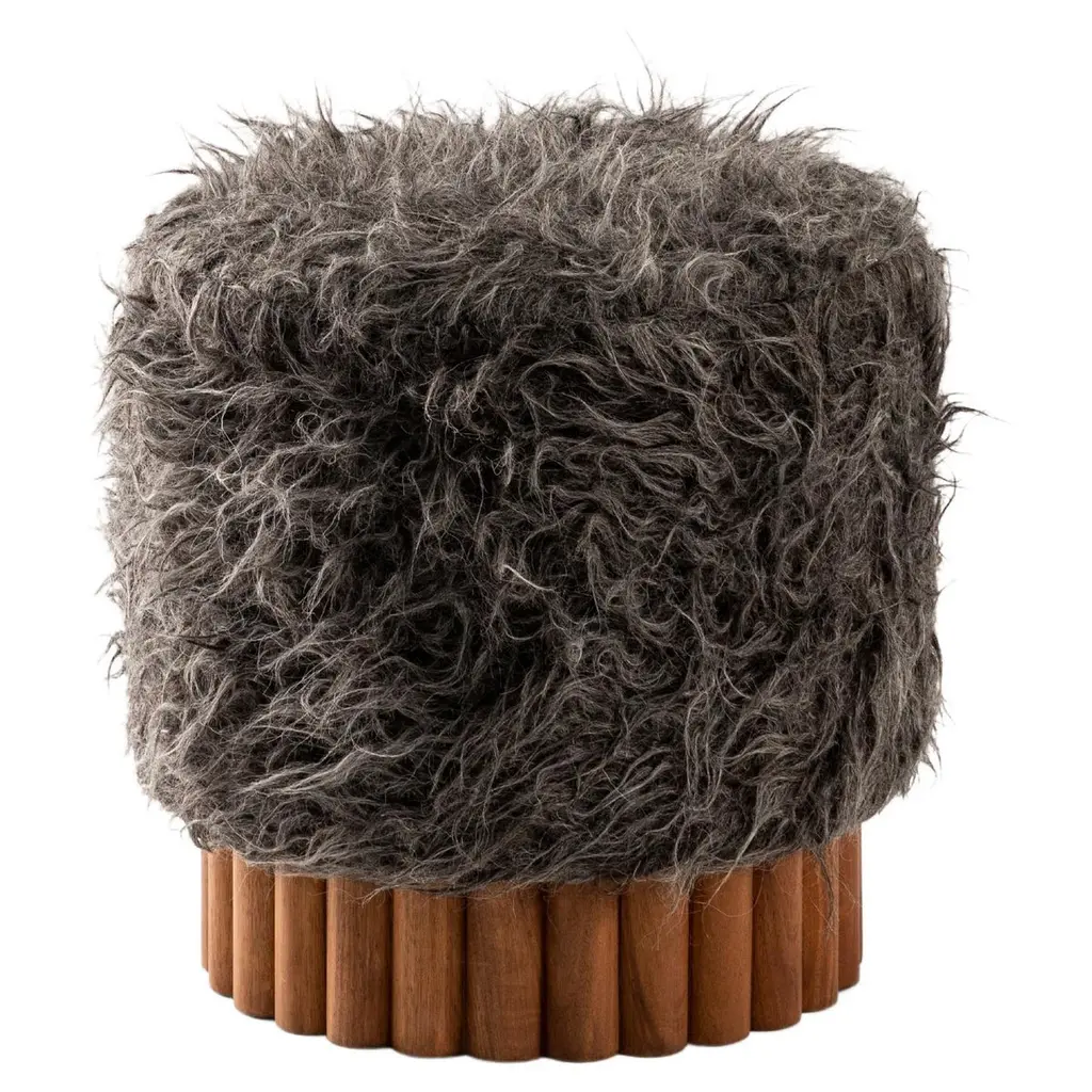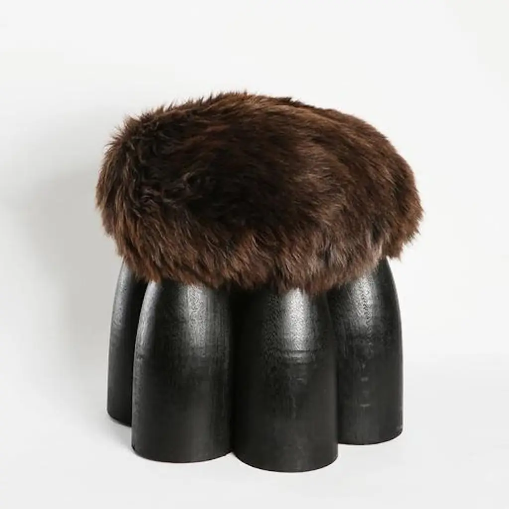 Senufo ottoman, unique signed stool, Arno DeclercqIroko wood and sheepskin by Carine BoxyMeasures: L 45 cm x W 45 cm x H 40 cm L 17.7” x W 17.7” x H 15.7”Material: Iroko woodMade by handSigned by Arno DeclercqArno DeclercqBelgian designer and art dealer who makes bespoke objects with passion for design, atmosphere, history and craft. Arno grew up in a family with parents who like to work with beautiful brands and objects.His father studied at the Royal Academy of Arts Fashion Department, he worked for Bikkembergs and made his own fashion brands, but has also collected tribal arts for more than 20 years. His mother, who worked with his father from the beginning, bought a shoe store in 2010 where they sold brands as Rick Owens, Ann Demeulemeester, Maison Martin Margiela. With the interest in beauty he learned from his parents, Arno studied interior design, after learning a lot about materials and with great knowledge of history he designed interiors and opened his own gallery for ethnographic art and design.The collection has come to the idea that there are too few interiors where they no longer have the big and static vases and candlesticks that the people had in big houses over 100 years ago. By focusing on architecture, ancient arts and design, after war buildings, defence buildings (bunkers and fortresses) and tribal arts, he created a collection that became a Classic.Each piece is unique because it is entirely handcrafted by him. Made of tropical hardwood called Iroko this he discovered after one of his many trips to West Africa interested in voodoo arts.In these strange tribal arts, the wood "Iroko" is used in many objects, according to their culture, the ancestors lives in these trees, and they also call this tree "the king of the forest".Arno also combines this with Belgian oak that dried for more than 30 years, wood that was provided for the many furniture makers in Mechelen.By treating these objects through the Yakusugi technique or another mentioned "Shou Sugi Ban" an ancient Japanese technique where the objects are burned to protect the wood from weathering and subsequently fixed to get a patina look as long as possible. This gives each object a unique texture.