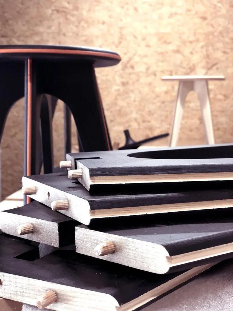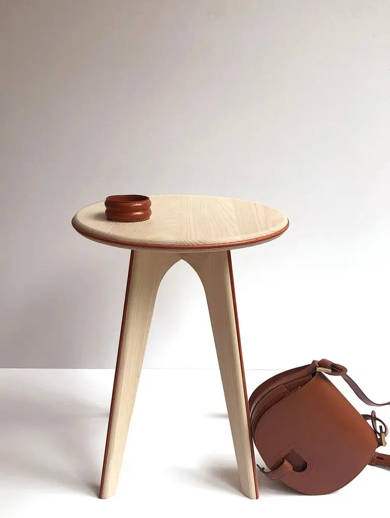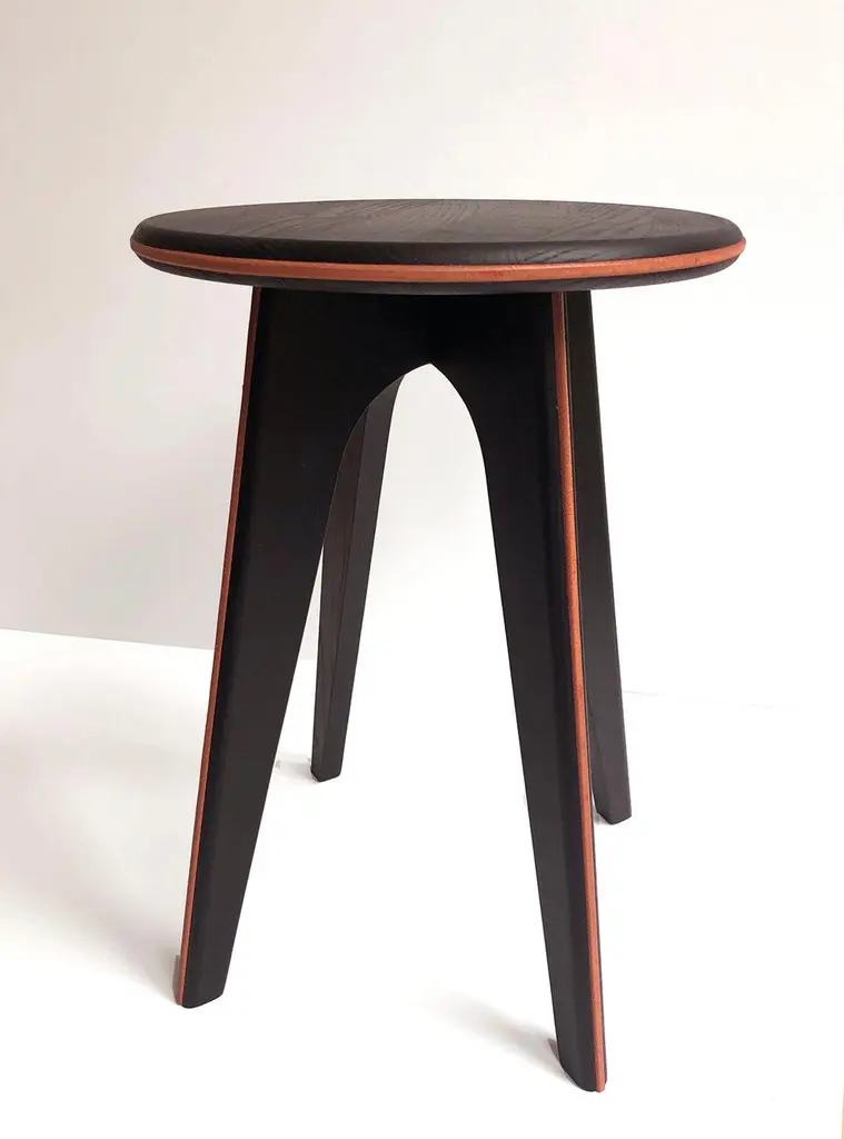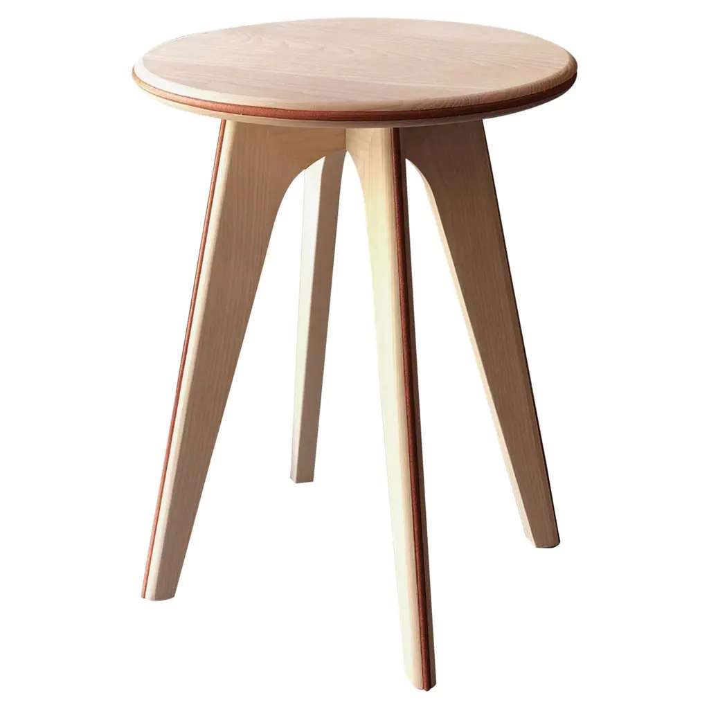 Set of 2 Ash and Orange Leather ASSY Stools by Mademoiselle JoDimensions: Ø 35 x H 43 cm (each).Materials: Black stained/bleached ash and orange leather.Available in two wood colors and several designs. Please contact us.At the border between design and goldsmithing, the ASSY stool sets the tone. Poetic ASSY and Nordic ASSY, inlaid with brass in theseat, are available in different designs to match your personality.ASSY rounded leather, highlighted with leather cord, can be used as a stool or as a small side table. ASSY combines the ancient techniques ofmarquetry and goldsmithing with today's techniques, laser for brass and milling machine for wood routing. The setting is done by hand. The fine details are the result of precision work done by hand.This simple object is a perfect and useful work of art that is chosen by heart and taste, and kept over time. An object with an aesthetic and sentimentalvalue.ASSY is a singular and poetic product, with a touch of spice.Trained as a stylist at La Cambre, I have worked for 25 years to create trends, colours and fabrics for the world of lingerie. Architecture has always been my passion and as such, object design has become an obvious path for me.My approach is based on intuition, with a fascination for the material and the intention to offer something beautiful and different. My vision delicately intertwines heritage and technology, aiming to offer creations at the right price, designed to last and be transmitted, while trying to produce as local as possible and to highlight our know-how.A responsible commitment for a sustainable product.We offer products produced with great care in Belgium and Europe. Useful creations that make you smile, creations you pass on, objects that will have multiple usages in their different lives following the imagination of their owner.