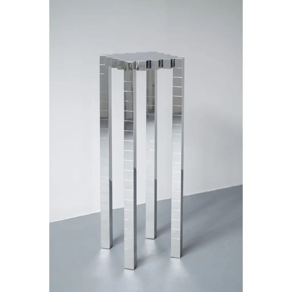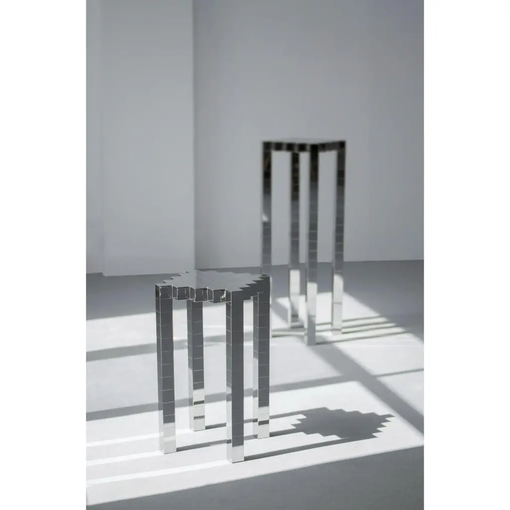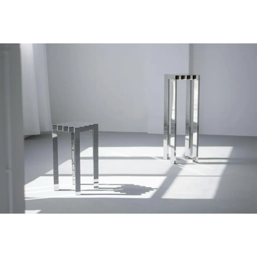 Set of 2 black ocean 2 and 3 stools by The ShawDimensions: D32.5 x W 32.5 x H97 cm //D32.5 x W 32.5 x H60Materials: Stainless SteelWeight: 28 kgB L A C K O C E A N I opened my eyes, it was still dark, the black water touched my face gently . The sky was still grey, clouds torn by wind and flew away one after another. All these things were peaceful and special.THESHAW is the private studio brand created by Shaw Liu in 2017. It aims to shape new styles in aesthetic and conception with modern perspectives using ordinary materials and finest craftsmanship, to describe the spirit and artistry of the products in the frame of freedom and minimalism, and to create exquisite and contemporary visual installation products, while embodying her understanding of the divine thinking and spiritual world.Shaw Liu created the private art studio and the brand “THESHAW” in 2017.The artist has been creating new mannerism works combining modern aesthetic perspectives with various thinkings. The brand is a fusion of future, spatial and three-dimensional elements, and spares no effort to express the feeling of divinity, spirituality, and religion.