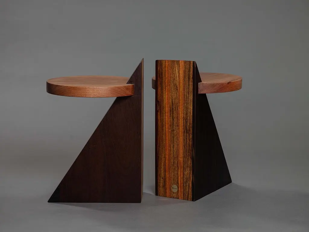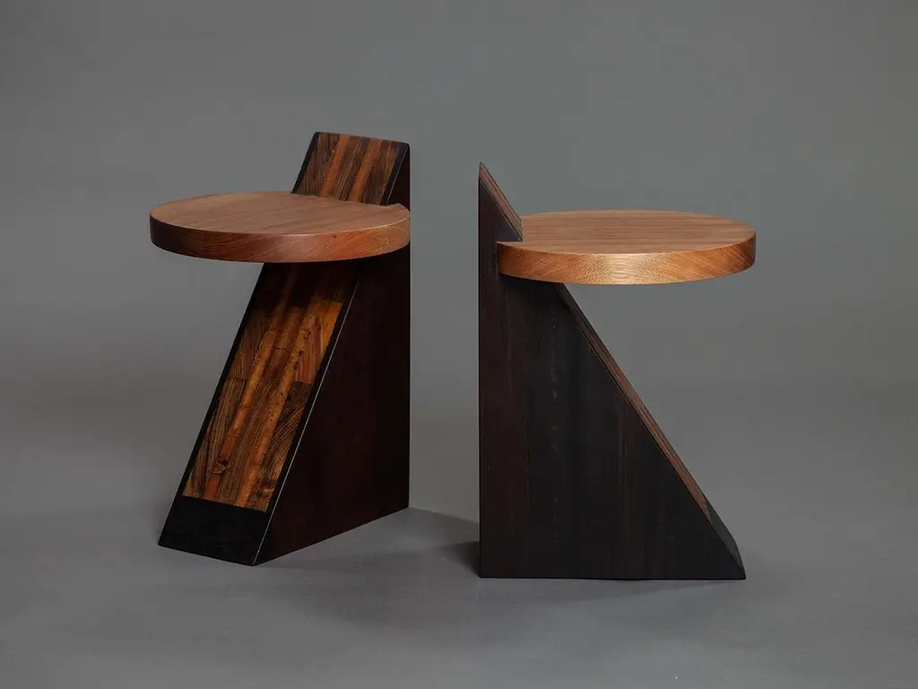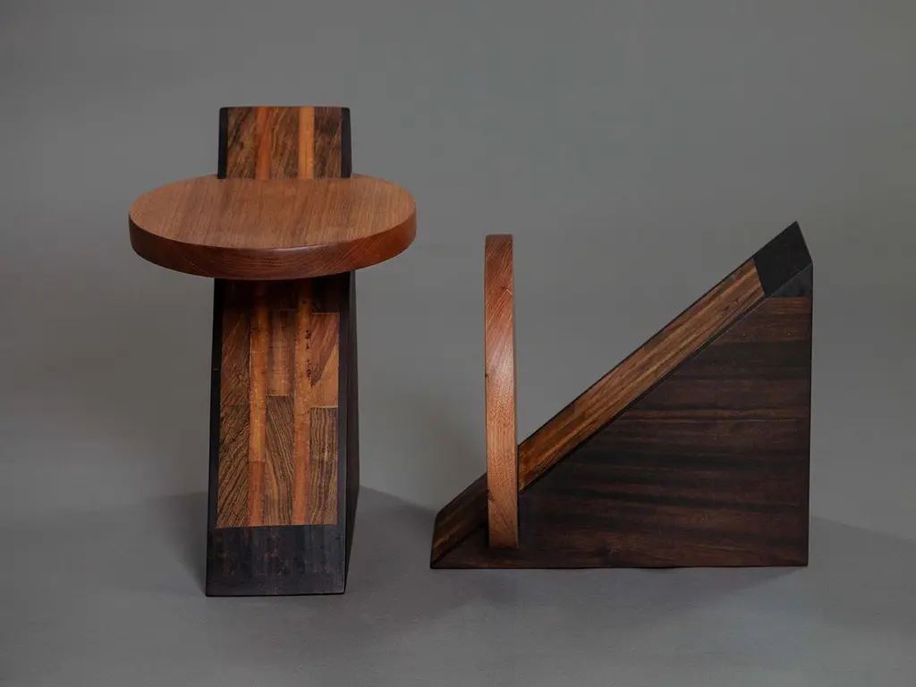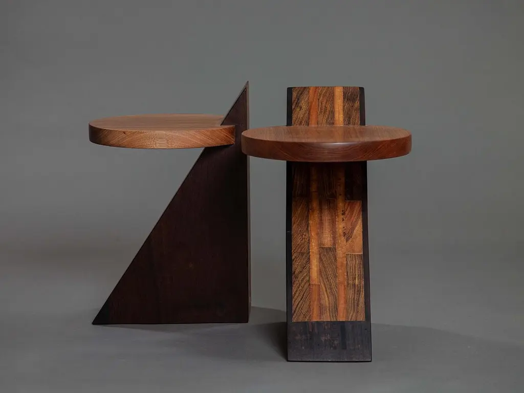 The Inácio stool plays with geometric shapes, aiming to create a sensation of movement and fluidity. It is made entirely from leftover solid wood from other projects, which would normally be discarded. Can also be used as a side or coffee table. As they are natural materials, wood, straw and leather may have different tones and textures than those shown in the photos.