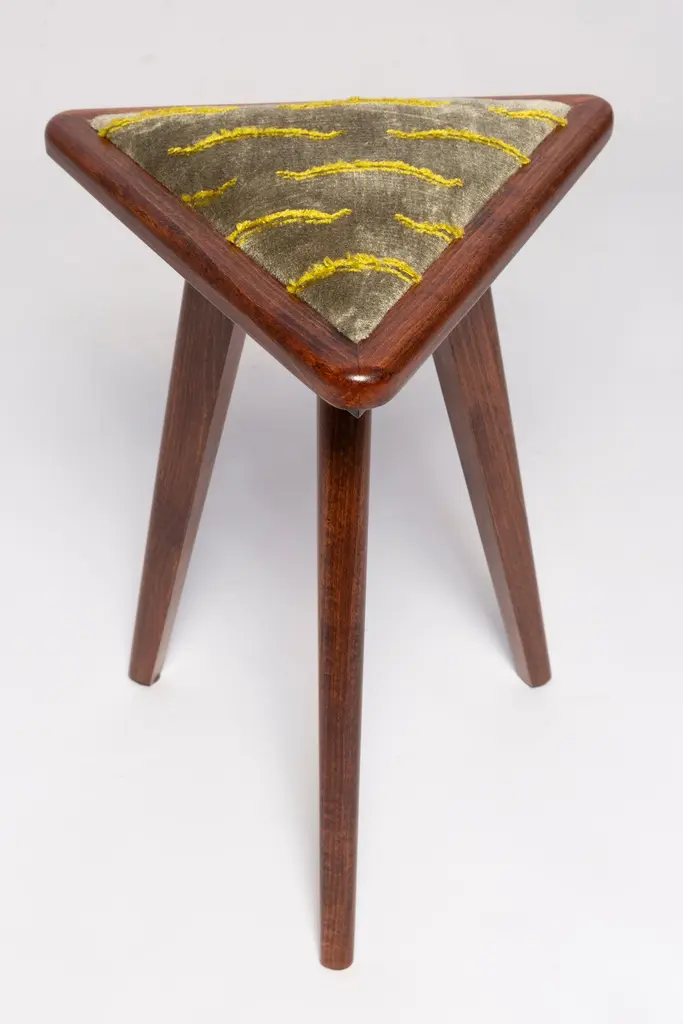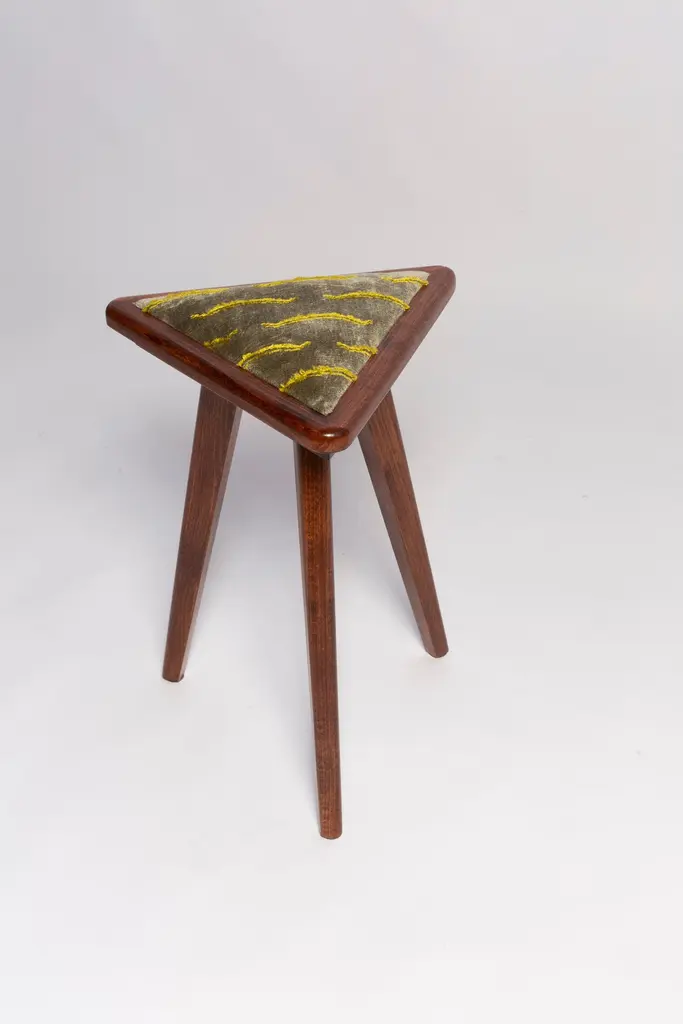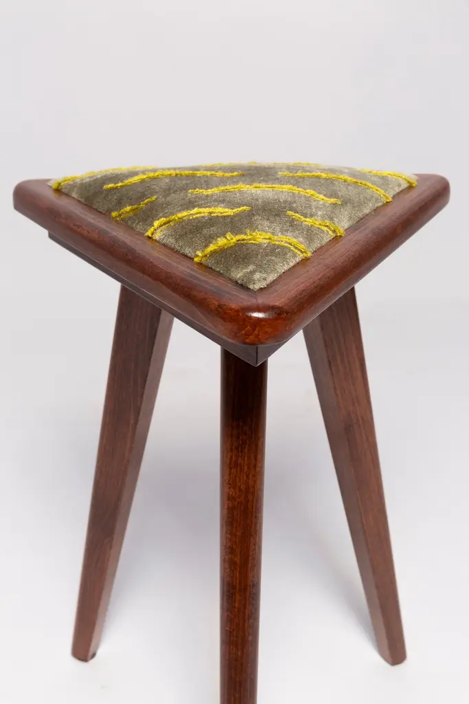 Stools inspired by 60s style. The stools consists of an upholstered part, a seat and wooden legs narrowing downwards, characteristic of the 1960s style. They are absolutely unique. We can prepare them also in another wood and boucle color. Designed in 2022 in Poland. About the fabric:The warp and weft of an ideaA velvet jacquard that pays a visual and tactile homage to the tiger’s coat. Embellished by luminous yarns recalling light reflections in a jungle, which further enhance its beauty. Ideal for medium/intensive upholstery applications.A tiger can conceal its presence whenever the need occurs. But equally effective is this animal’s capacity to rivet our attention with its magnetic gaze. The same character traits are present in this lavish and hypnotic jacquard weave, which celebrates the appearance and tactile sensations of its skin. The wavy lines gently animating the velvet ground are reminiscent of the marks on this majestic creature’s skin. Such precious yarns, chosen to recall the bright reflections of the Sundarbans forest light, provide a worthy representation of a wild and unique natural beauty.