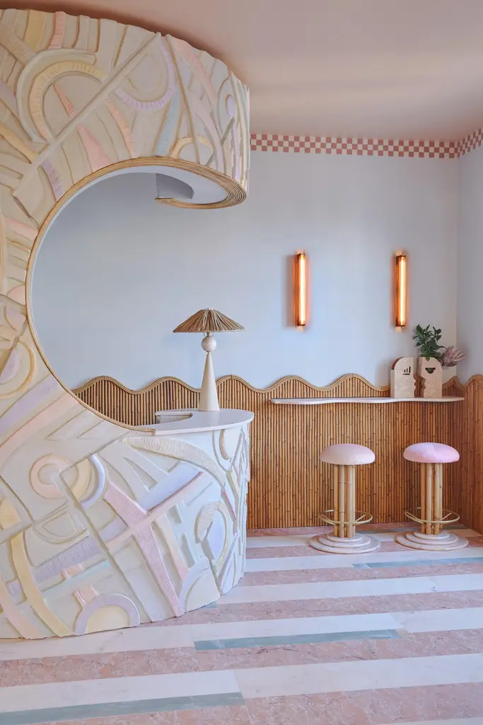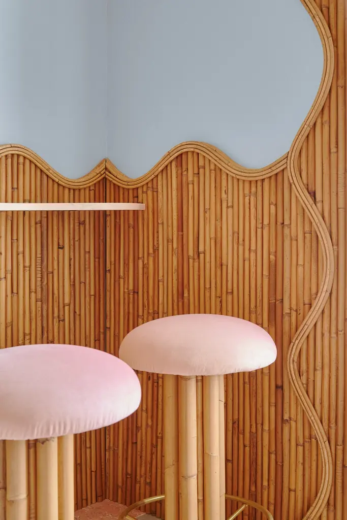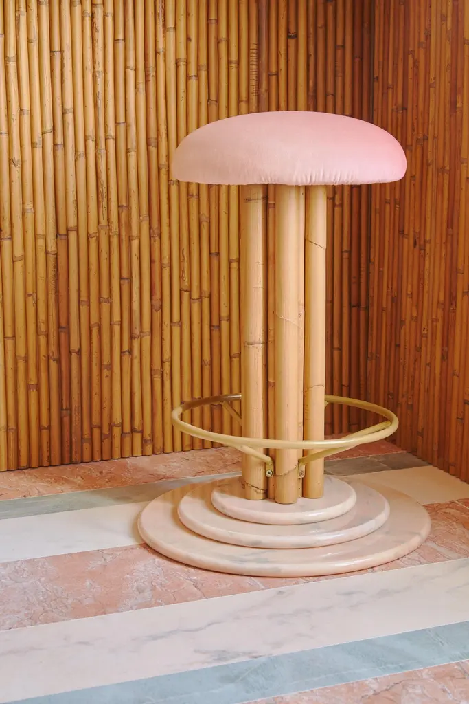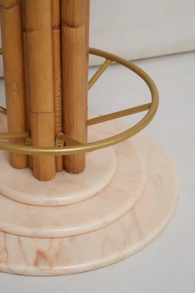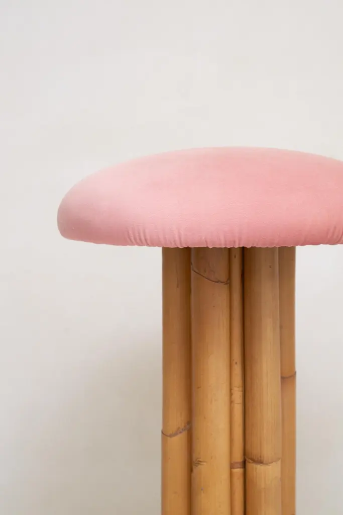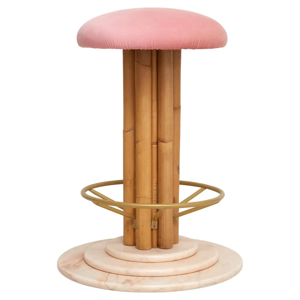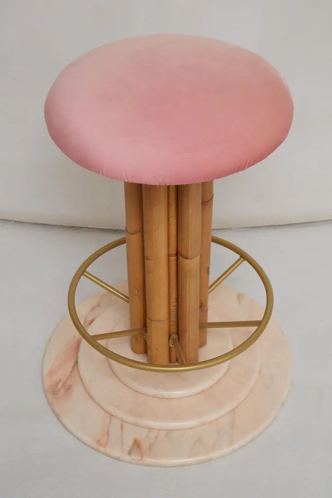 Set Of 2 Peaches Stools by Patricia Bustos de la TorreDimensions: D 38 x W 38 x H 84 cm.Materials: Rattan, pink Portuguese marble, velvet and iron. Taburete Peachy is sexy and sensual but round and surprising. A bomb of color and textures that will impact like a projectile on any stage. Velvet in gradient from pink to yellow, rattan tubes without natural pillar also in theform of cartridge and brass are the perfect mix ready for detonation with a pink Portuguese marble base 3 discs.Patricia Bustos is an internationally renowned Spanish artist known for her work designing utopian pieces and spaces. Her creative gaze becomes an act of rebellion and her projects are full of a disruptive narratives that evolves with social trends. Her work is imbued with deep meaning because of her endless curiosity for the human being and its concerns such philosophy, language, architecture, art and nature. Her objects are handcrafted and aim to become cult pieces. Her work seeks to evokeaesthetic emotion trough a unique story behind every design. That is why wonder is the cornerstone of her work. The indelible memory that inspires us eternally comes from wonder. Through a bold use of color and an unexpected combination of shapes and materials, she is looking for contrast. Her pieces are distinguished by translucent or reflective elements juxtaposed with handmade or raw materials. As a result, her proposal achieves an atypical and fascinating balance at the same time. In her own words: "The purest beauty lies at the boundary between craftsmanship and utopia".