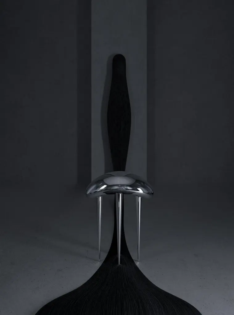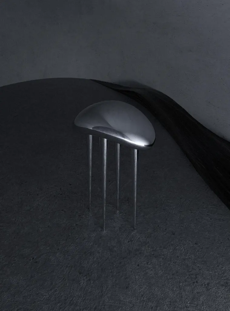 Set of 2 run through Me III Stools by the AsyncDimensions: D47 x W30 x W58 cm each Materials: Stainless Steel.