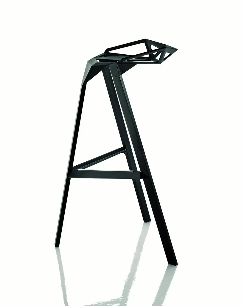 A die-cast aluminium shell made up of many small, perforated and triangular faces. Chair_One is in a certain sense built like a football, i.e. with a series of flat ele- ments joined one to the other at angles to create a three-dimensional shape. All this is achieved by exploiting the potential of die-casting which is a precise technology allowing complex three-dimensional shapes to be obtained from metal (in this case aluminium). The result is therefore a chair in which the spaces prevail over the solid parts to characterise its aesthetic quality. Chair_One has now become a classic of the future.Stool_One: legs in anodised aluminium or painted in polyester powder. Seat in die-cast aluminium treated with sputtered fluorinated titanium and painted in poly- ester powder. Suitable for outdoor use. Also available cushions in fabric (Kvadrat “Steelcut Trio” or “Steelcut 2”) or in leather for indoor use.