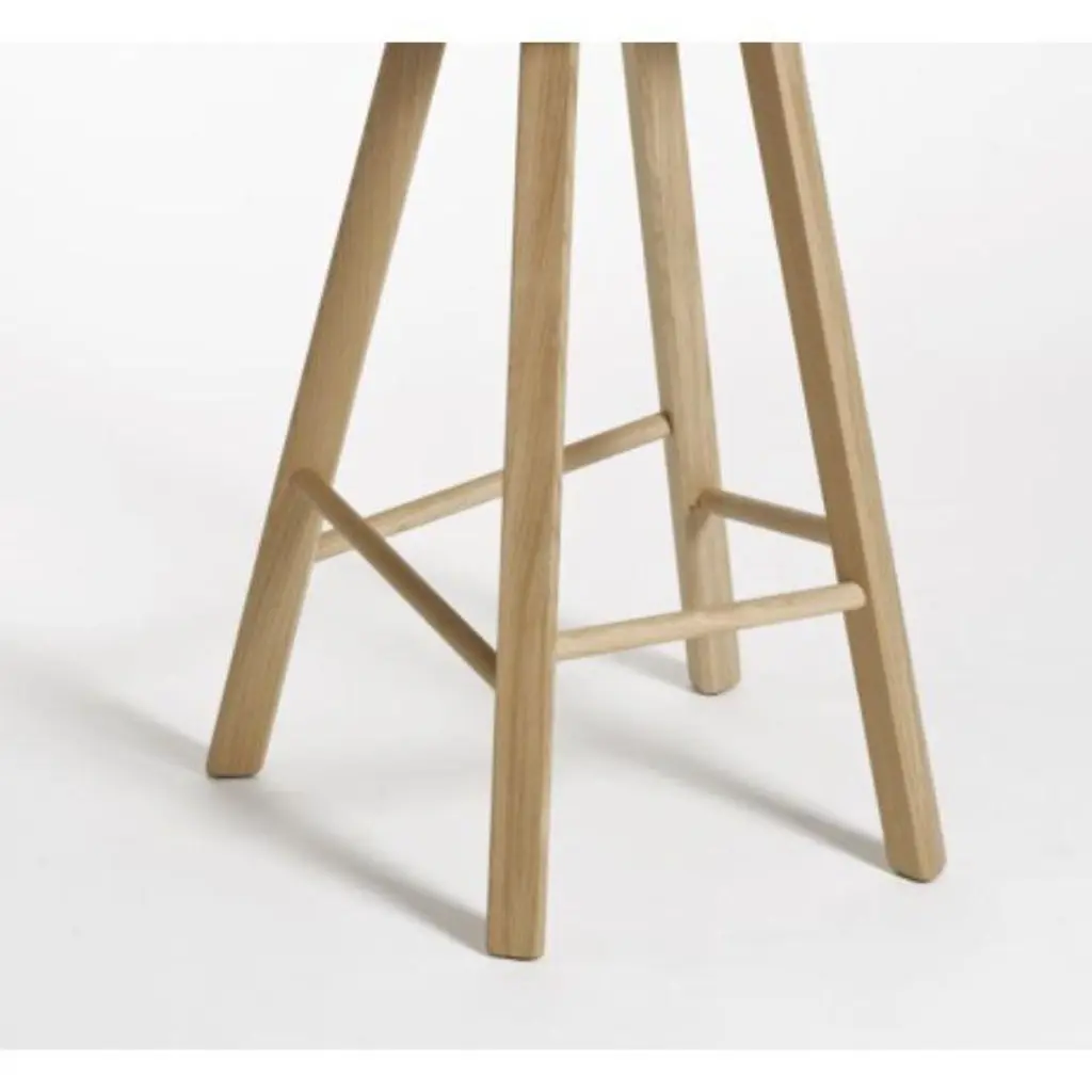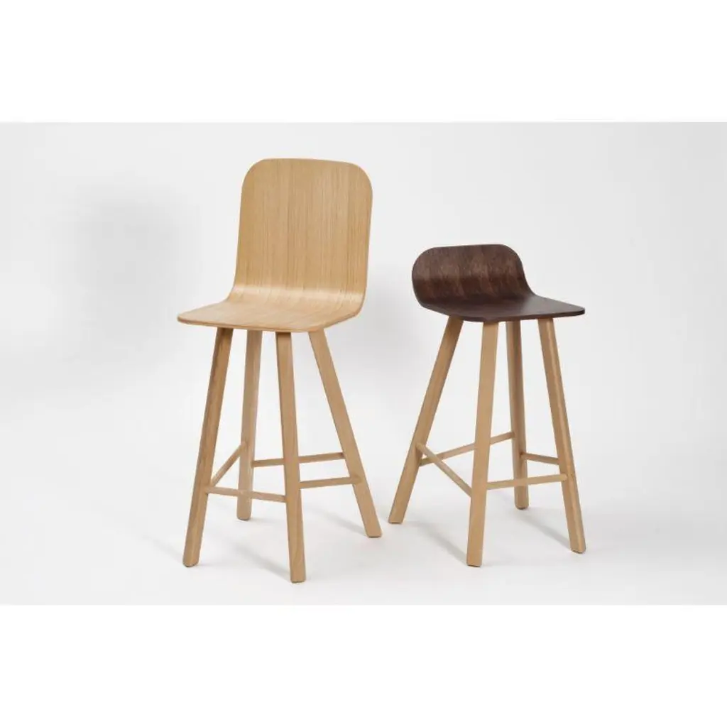 Set of 2, Tria Stool, Low Back, Leather Azul by Colé Italia with Lorenz & Kaz Dimensions: H.seat 67/77, H 79/89, D 52, W 48 cmMaterials: Plywood stool with low back leather or fabric upholstered; solid oak wood 4 legs;Also available: tria stool natural, high back, different materials,TC: C.O.M. fabric - send us your own materialCA: Cat A - Angel (polypropylene), Ganesha (synt. leather), Nord Wool (felt)CB: Cat B - Tiffany (polyestere), Lana (aquaclean)CC: Cat C - Velvetforthy (Velvet), Topia (wool), Novum (Wool), Opera (felt)CP: Cat P - Milano (full grain leather) Our iconic chair designed by German duo Lorenz + Kaz. Tria is a table chair, at the same time many people place it asa sculpture, as ornament in an entrance, a bedroom or in a living room. It recalls the impossible forms of Dutch graphicartist and engraver Maurits Escher, defining itself in a game of twists and elusive leak. The corolla-shaped shell can beused in two different seating positions, center or side, in this case with one armrest. The shell is composed of three equal elements in bent plywood assembled together and veneered with a special wood finishing ivory/ black stripes.It is also available in veneered oak, natural or stained open pore in different colors, as well as customized colors (min. 4units). Available with 3 or 4 solid wood legs, or 4 metal legs in different finishings. For a better back comfort if you useTria chair in center position, for dining or studying, you can add a back cushion specially designed for it, upholsteredand coated with a wide range of fabrics.Colé is a young Italian design brand, with a high-end production 100% made in Italy. Born from the experience of Matteo De Ponti, architect, who grew up in one of the most outstanding Milanese design families, and the artistic sensibility of Laura Macagno, degree in Economics and passionate of art and design. Our Mission is to create design icons, beautiful and comfortable pieces that can Stand the test of time, furnishing houses of international and sophisticated clients, and realized with craftsmanship, thus unique. “We love objects which own deep roots, excellent quality, and a strong evocative power. Archetypal forms dressed with new beauty without losing their classical composure”.Our expressive research is inspired by the utopian force of Italian eminences grises architects and designers of the ’50s, the Scandinavian design, the Bauhaus, ethnic handcraft and houses of famous writers of the XX century, all different as a style but united by the intense soul of those who worked and lived there.