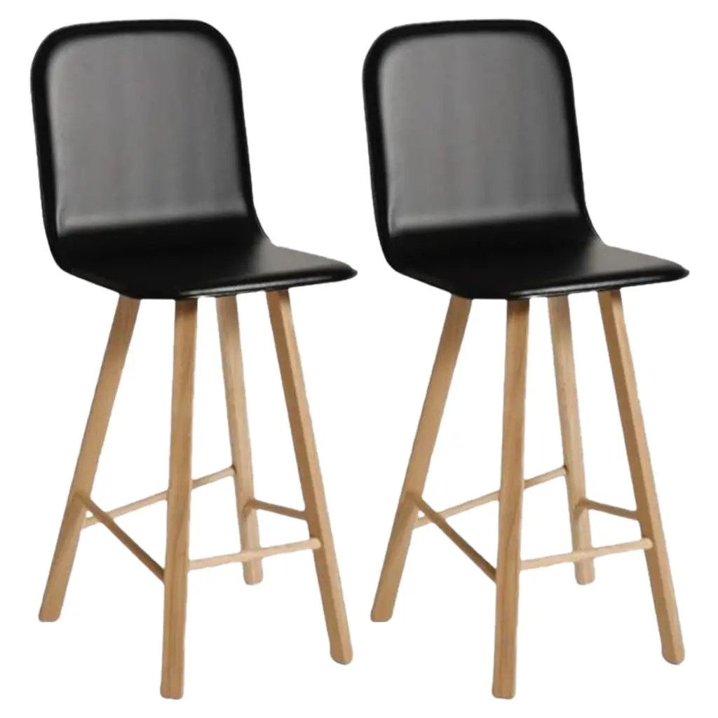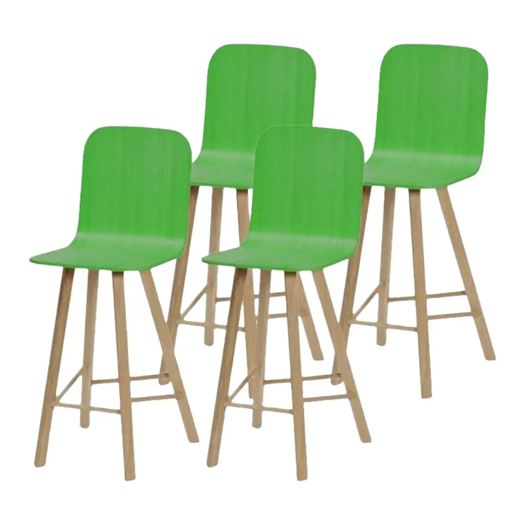 Set of 2, Tria stool, Tapparelle High Back Denim Green by Colé Italia (RAL color seat) with Lorenz & Kaz Dimensions: H.seat 67/77 (H.105/115) x D.52 x W.48 cmMaterials: Plywood Stool with High Back, Solid Oak Wood 4 legs; Also Available: Tria Stool Upholstered, Low backTC: C.O.M. fabric - send us your own materialCA: Cat A - Angel (polypropylene), Ganesha (synt. leather), Nord Wool (felt)CB: Cat B - Tiffany (polyestere), Lana (aquaclean)CC: Cat C - Velvetforthy (Velvet), Topia (wool), Novum (Wool), Opera (felt)CP: Cat P - Milano (full grain leather) Our iconic chair designed by German duo Lorenz + Kaz. Tria is a table chair, at the same time many people place it asa sculpture, as ornament in an entrance, a bedroom or in a living room. It recalls the impossible forms of Dutch graphicartist and engraver Maurits Escher, defining itself in a game of twists and elusive leak. The corolla-shaped shell can beused in two different seating positions, center or side, in this case with one armrest. The shell is composed of three equal elements in bent plywood assembled together and veneered with a special wood finishing ivory/ black stripes.It is also available in veneered oak, natural or stained open pore in different colors, as well as customized colors (min. 4units). Available with 3 or 4 solid wood legs, or 4 metal legs in different finishings. For a better back comfort if you useTria chair in center position, for dining or studying, you can add a back cushion specially designed for it, upholsteredand coated with a wide range of fabrics.Colé is a young Italian design brand, with a high-end production 100% made in Italy. Born from the experience of Matteo De Ponti, architect, who grew up in one of the most outstanding Milanese design families, and the artistic sensibility of Laura Macagno, degree in Economics and passionate of art and design. Our Mission is to create design icons, beautiful and comfortable pieces that can Stand the test of time, furnishing houses of international and sophisticated clients, and realized with craftsmanship, thus unique. “We love objects which own deep roots, excellent quality, and a strong evocative power. Archetypal forms dressed with new beauty without losing their classical composure”.Our expressive research is inspired by the utopian force of Italian eminences grises architects and designers of the ’50s, the Scandinavian design, the Bauhaus, ethnic handcraft and houses of famous writers of the XX century, all different as a style but united by the intense soul of those who worked and lived there.