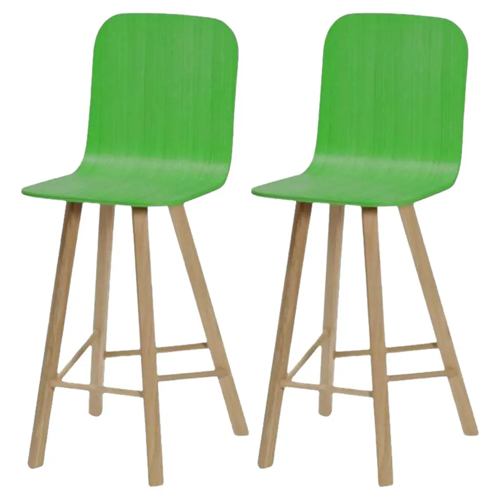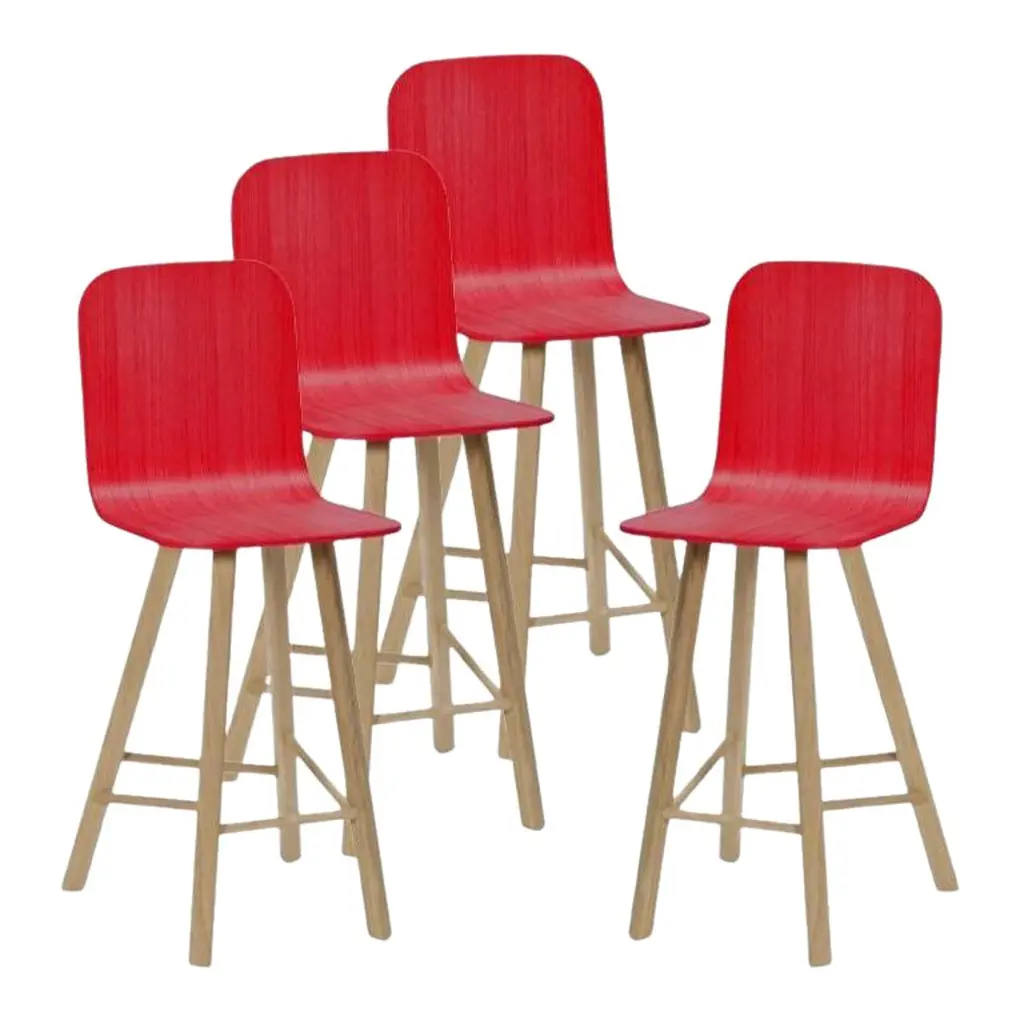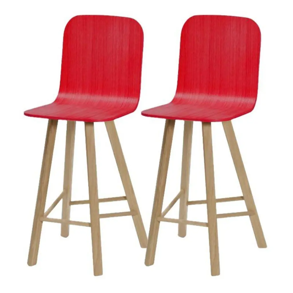 Set of 2, tria stool, tapparelle high back denim red by Colé Italia (RAL Color Seat) with Lorenz & Kaz Dimensions: H.seat 67/77 (H.105/115) x D.52 x W.48 cm.Materials: plywood stool with high back, solid oak wood 4 legs.Also available: tria stool upholstered, low back.TC: C.O.M. fabric - send us your own materialCA: Cat A - Angel (polypropylene), Ganesha (synt. leather), Nord Wool (felt)CB: Cat B - Tiffany (polyestere), Lana (aquaclean)CC: Cat C - Velvetforthy (Velvet), Topia (wool), Novum (Wool), Opera (felt)CP: Cat P - Milano (full grain leather) Our iconic chair designed by German duo Lorenz + Kaz. Tria is a table chair, at the same time many people place it asa sculpture, as ornament in an entrance, a bedroom or in a living room. It recalls the impossible forms of Dutch graphicartist and engraver Maurits Escher, defining itself in a game of twists and elusive leak. The corolla-shaped shell can beused in two different seating positions, center or side, in this case with one armrest. The shell is composed of three equal elements in bent plywood assembled together and veneered with a special wood finishing ivory/ black stripes.It is also available in veneered oak, natural or stained open pore in different colors, as well as customized colors (min. 4units). Available with 3 or 4 solid wood legs, or 4 metal legs in different finishings. For a better back comfort if you useTria chair in center position, for dining or studying, you can add a back cushion specially designed for it, upholsteredand coated with a wide range of fabrics.Colé is a young Italian design brand, with a high-end production 100% made in Italy. Born from the experience of Matteo De Ponti, architect, who grew up in one of the most outstanding Milanese design families, and the artistic sensibility of Laura Macagno, degree in Economics and passionate of art and design. Our Mission is to create design icons, beautiful and comfortable pieces that can Stand the test of time, furnishing houses of international and sophisticated clients, and realized with craftsmanship, thus unique. “We love objects which own deep roots, excellent quality, and a strong evocative power. Archetypal forms dressed with new beauty without losing their classical composure”.Our expressive research is inspired by the utopian force of Italian eminences grises architects and designers of the ’50s, the Scandinavian design, the Bauhaus, ethnic handcraft and houses of famous writers of the XX century, all different as a style but united by the intense soul of those who worked and lived there.