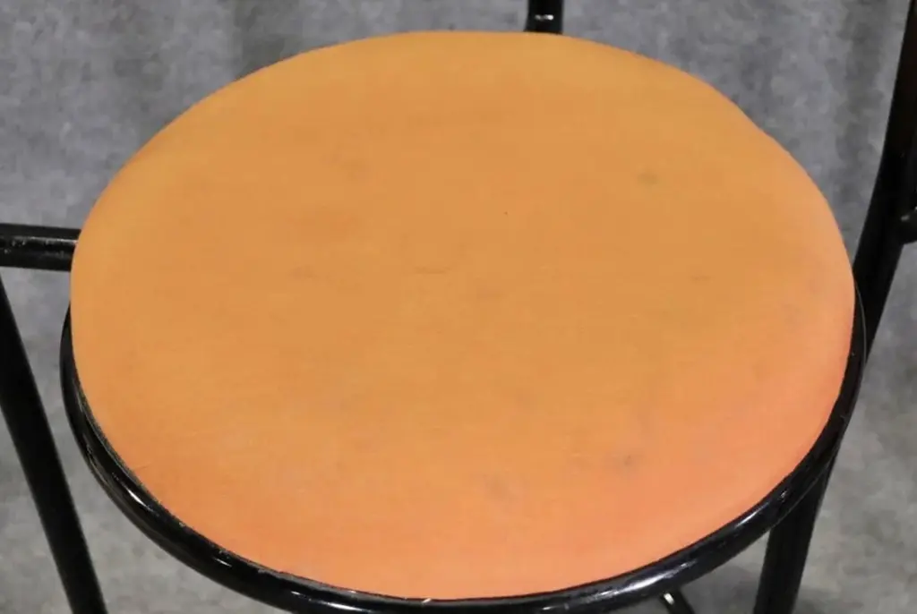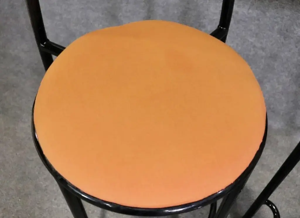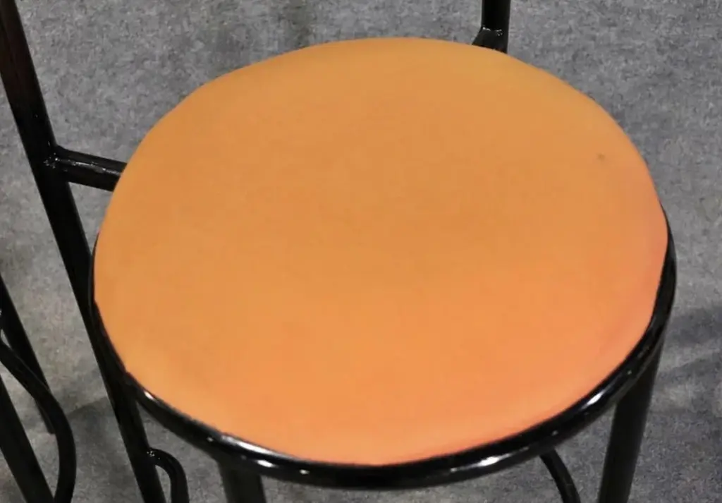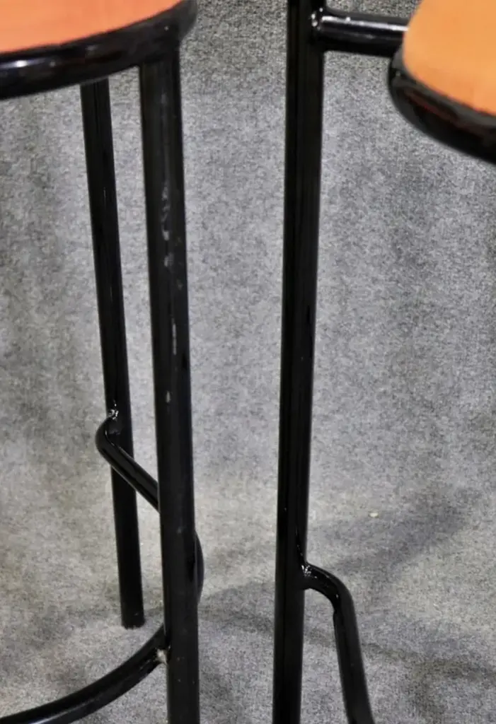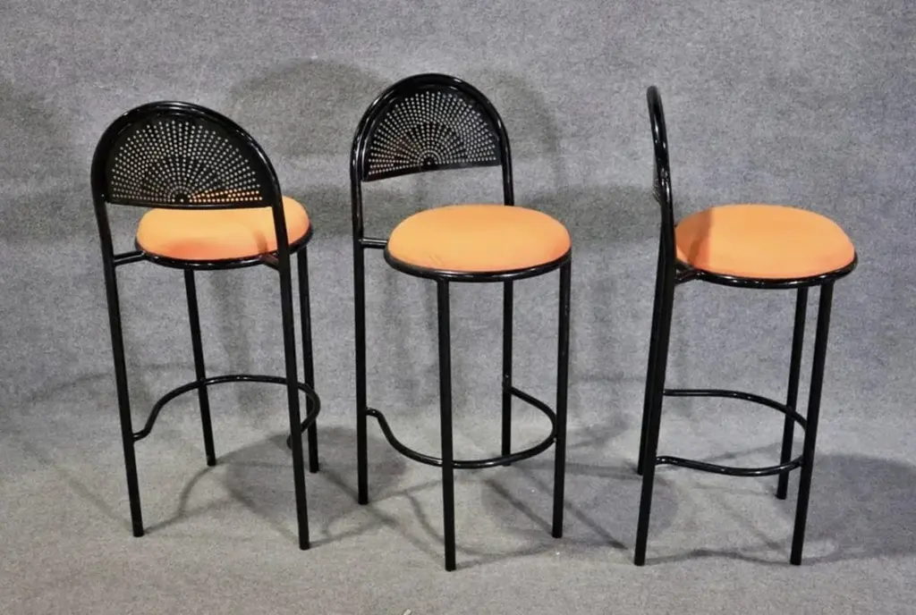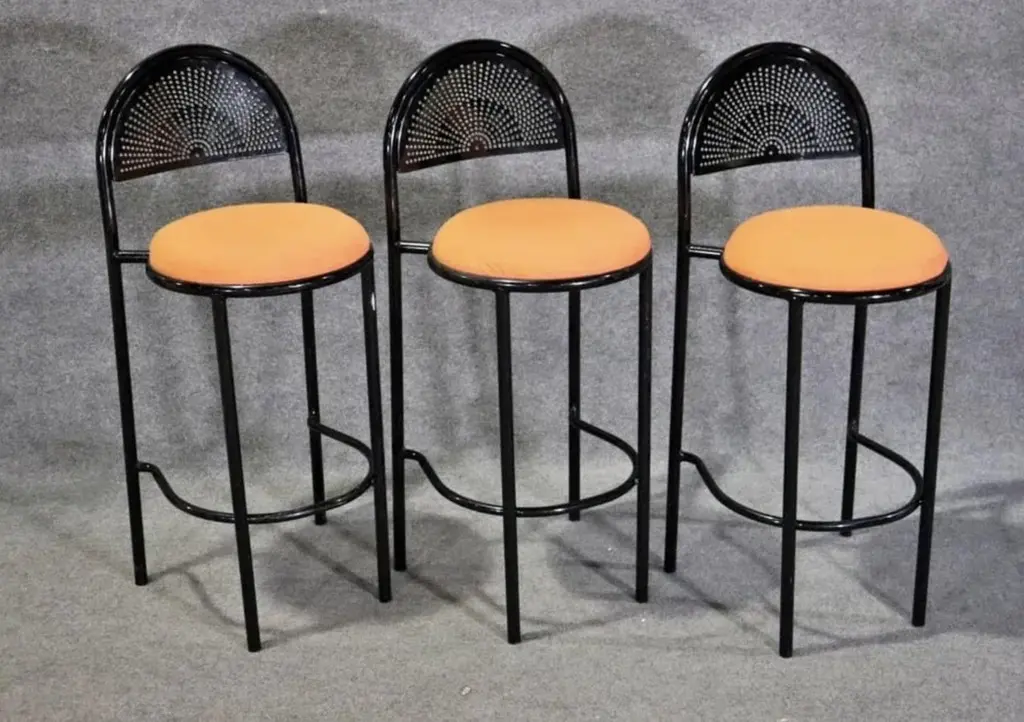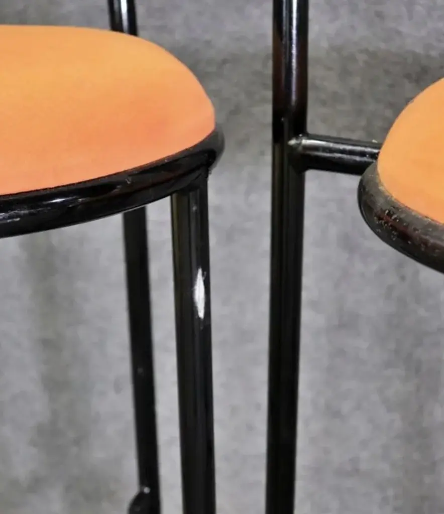 6 AvailableListing is for 3 black painted metal stools with bright orange seats.Half round perforated seat back.Please confirm location NY or NJ